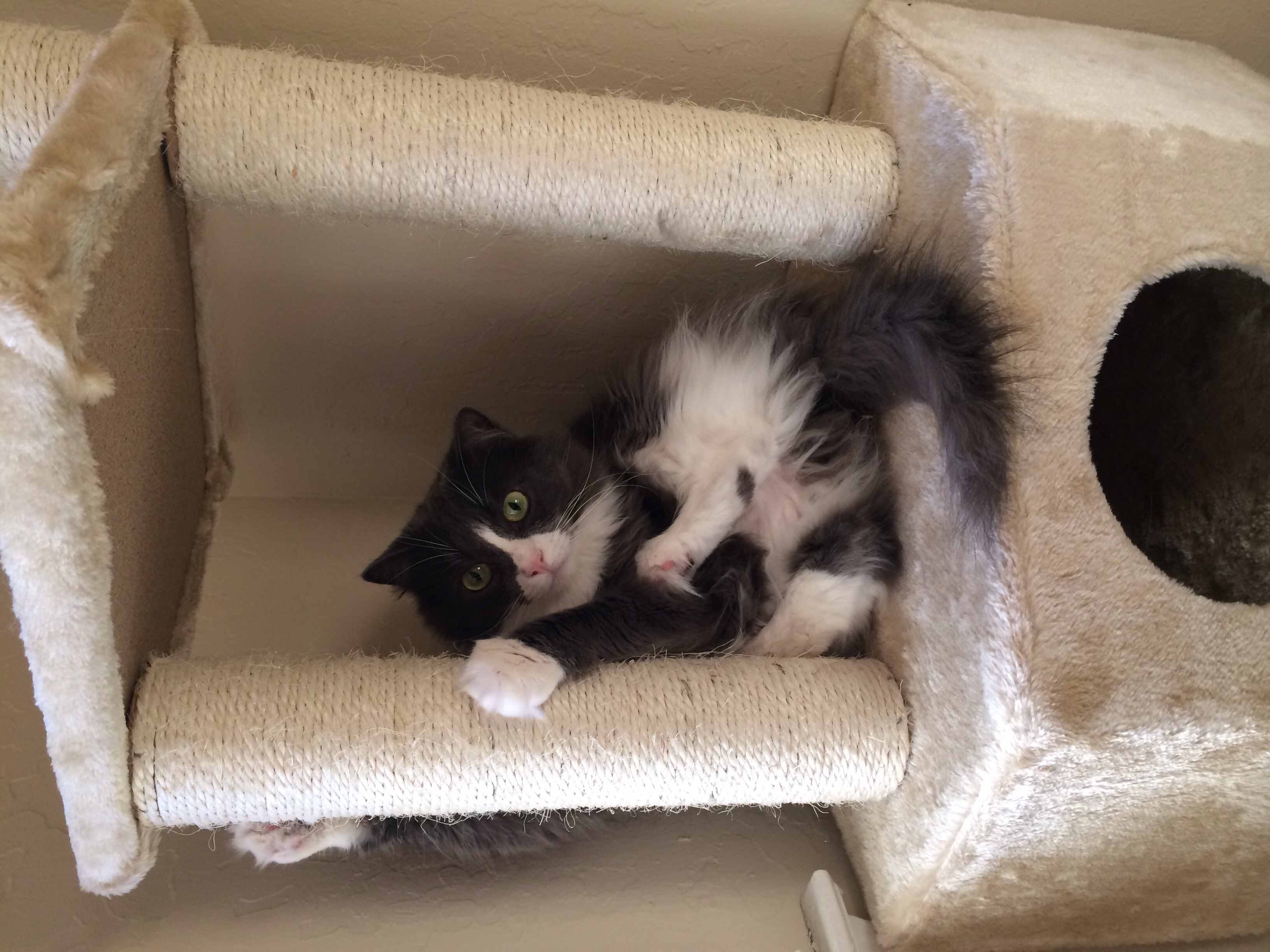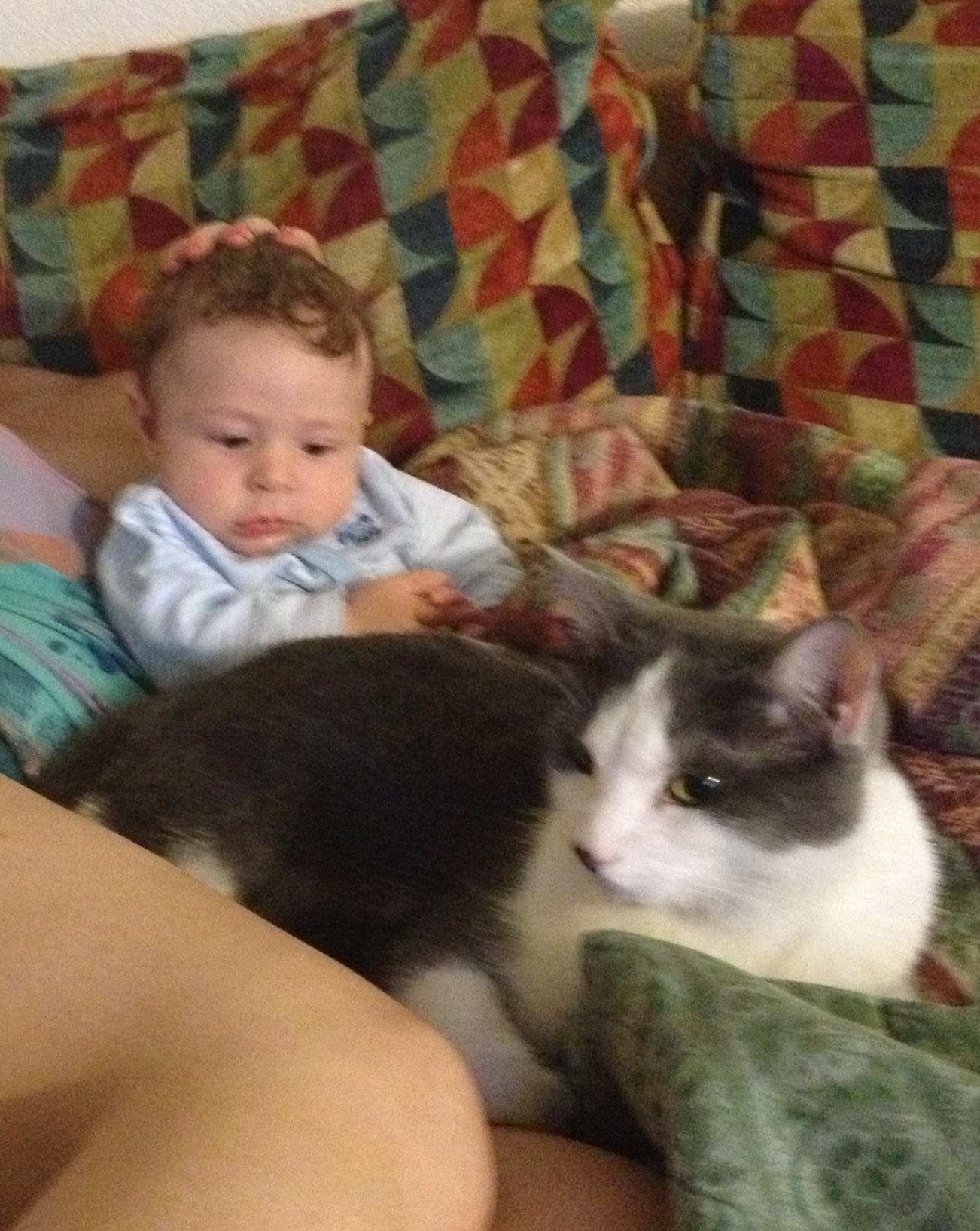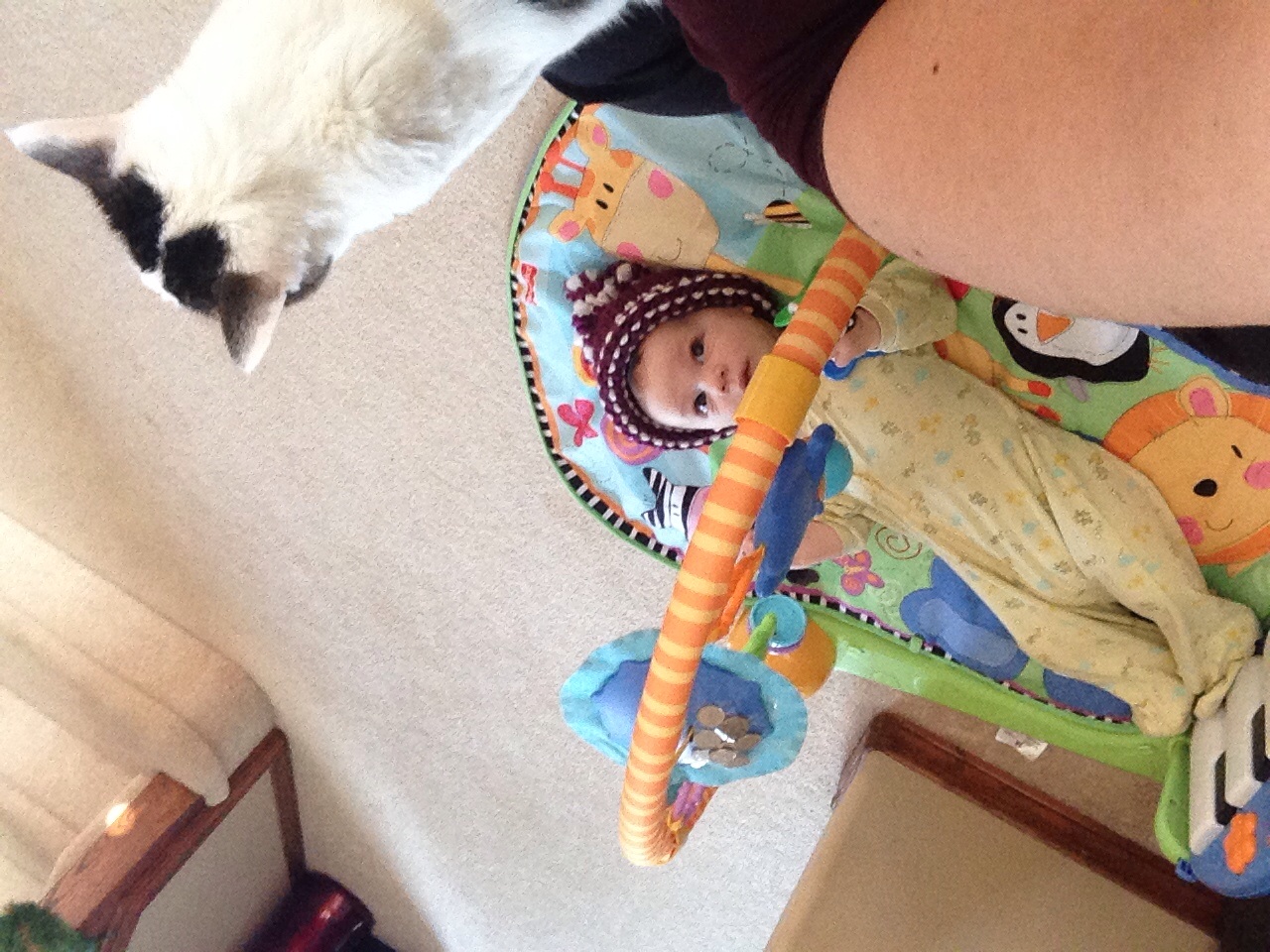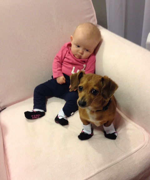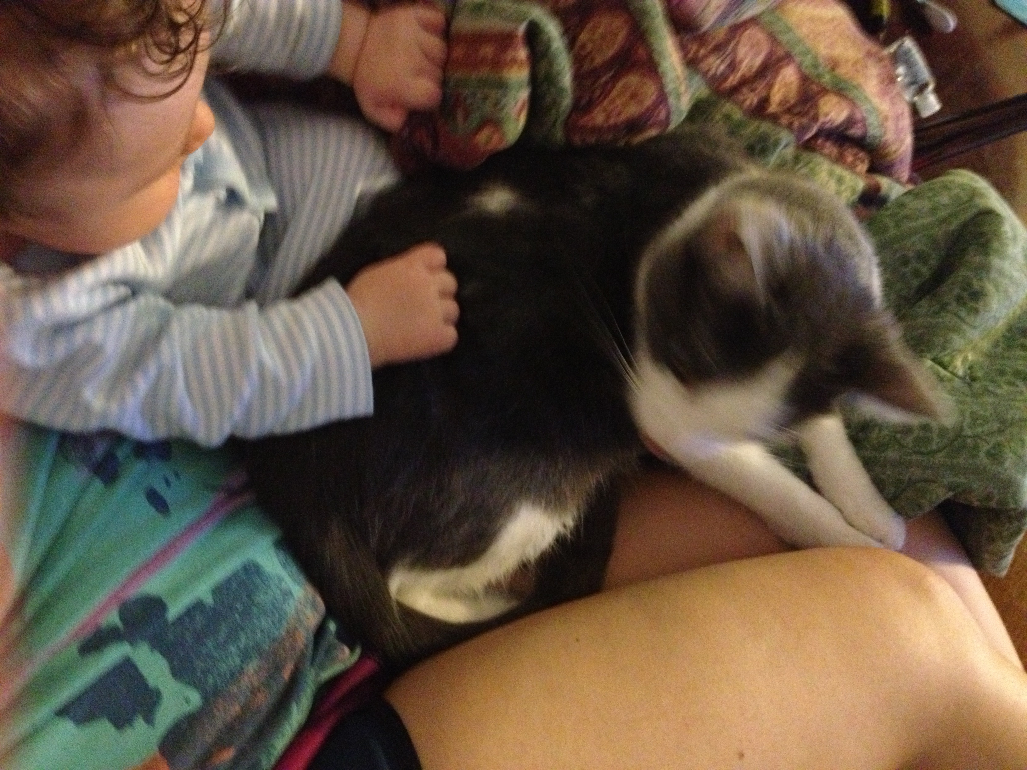 Chewy, after 6 days with just mommy and baby he stepped up to be the man of the house and protect us. Once dad got home and he knew he was off the hook, I walk into my bedroom to this!