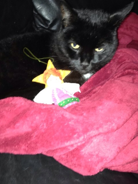Aaand here's my cat, cuddling with his favorite ornament last year.