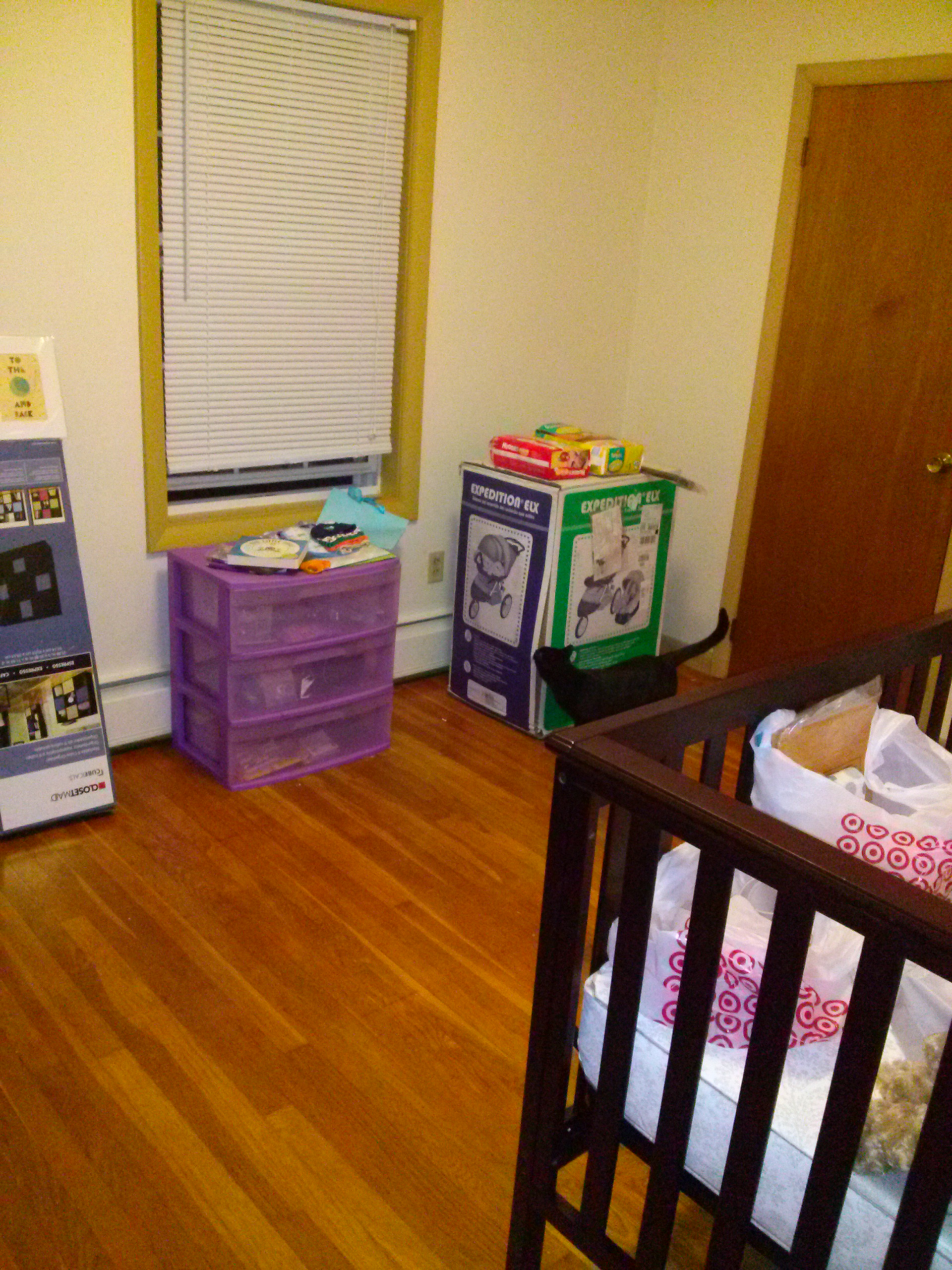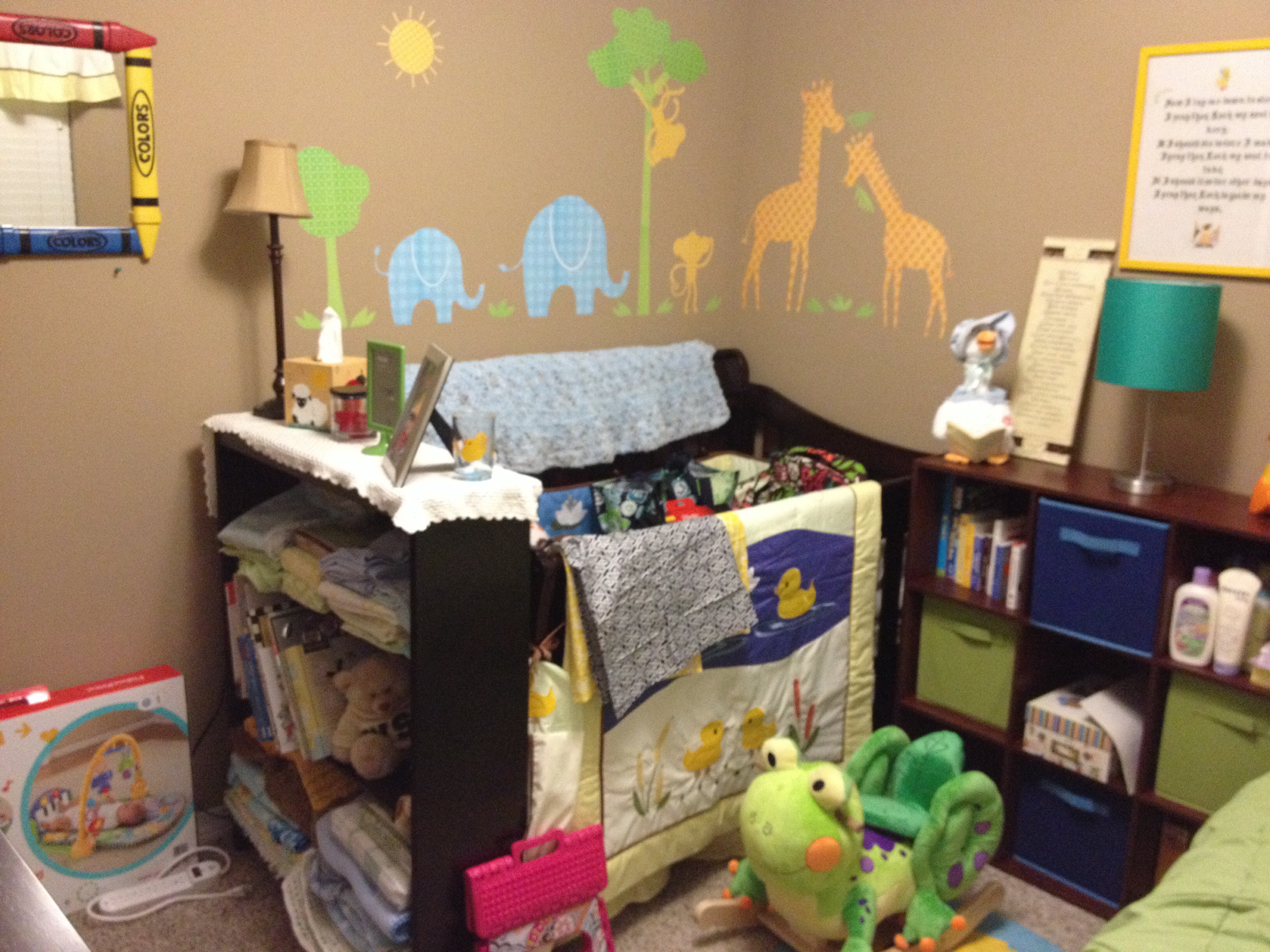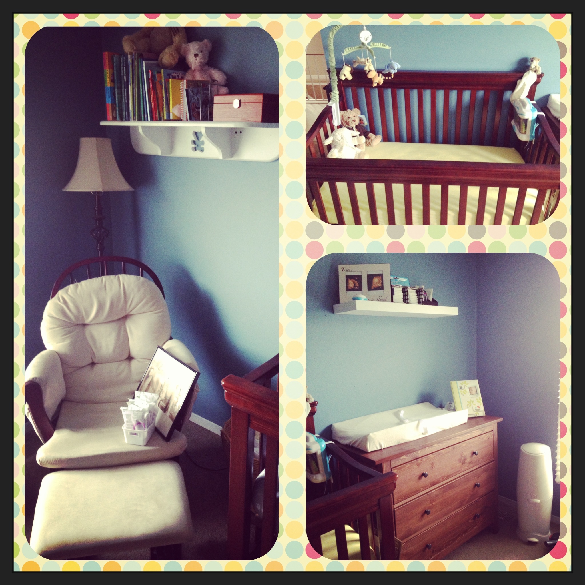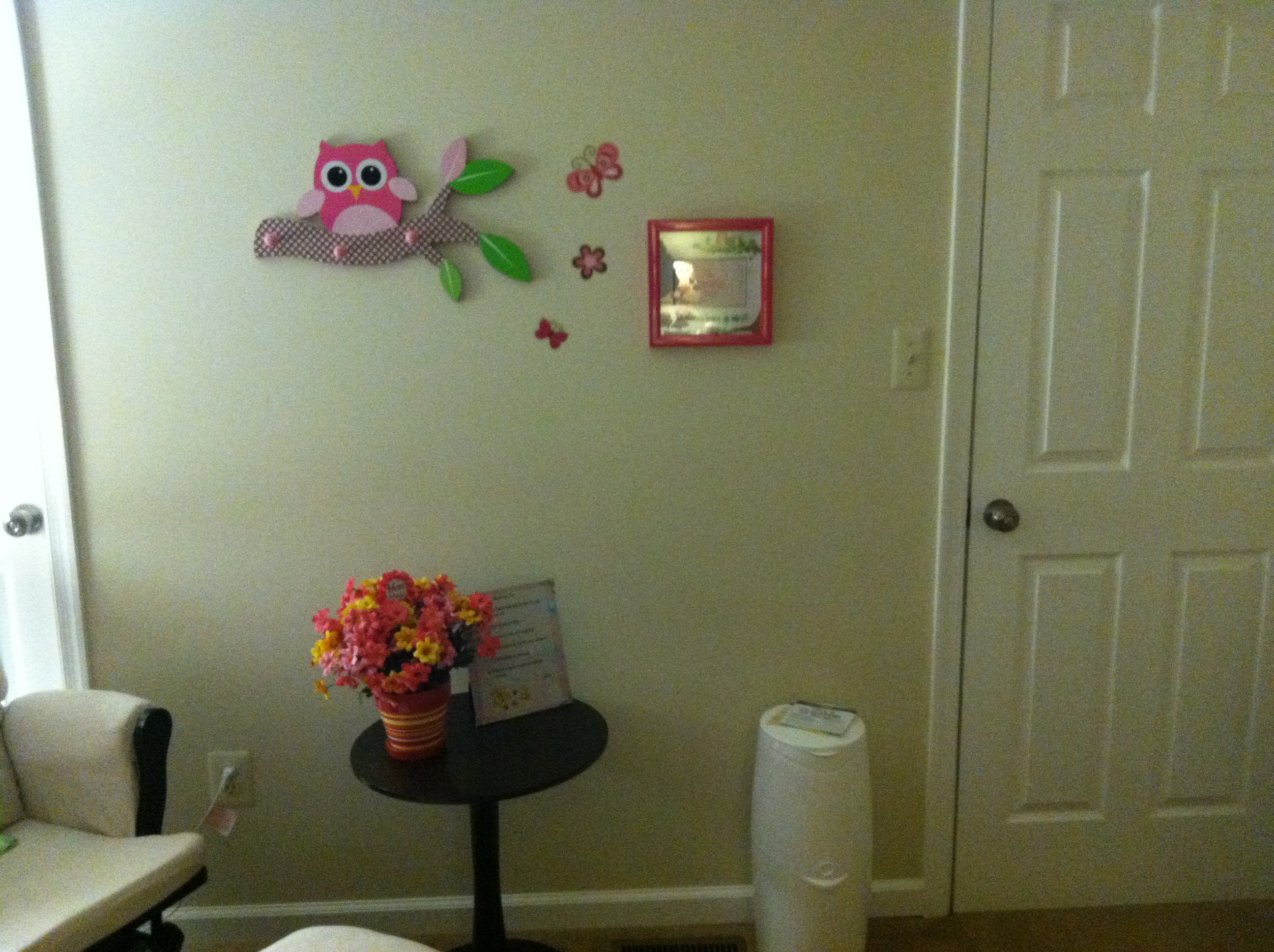 The picture frames aren't staying on the walls, and that purple drawer thing will be replaced with a bookcase. I still have a lot of decorating to do, and a glider to purchase, but progress is being made!