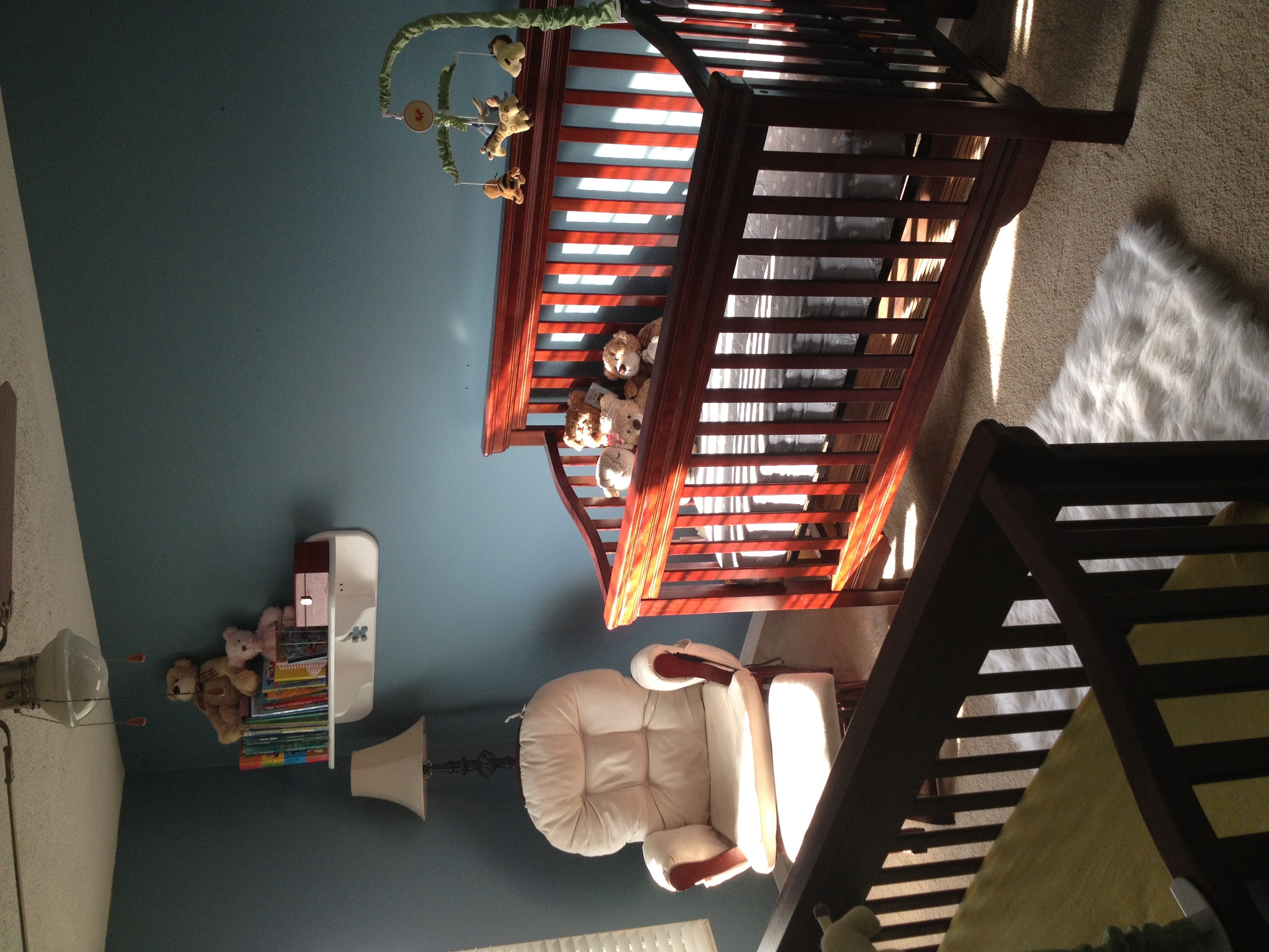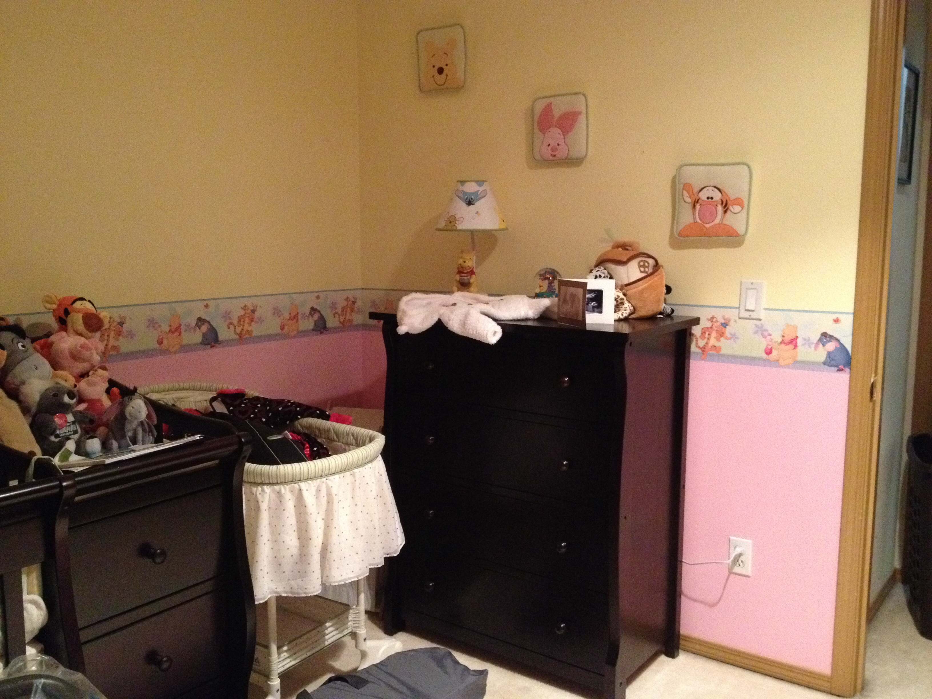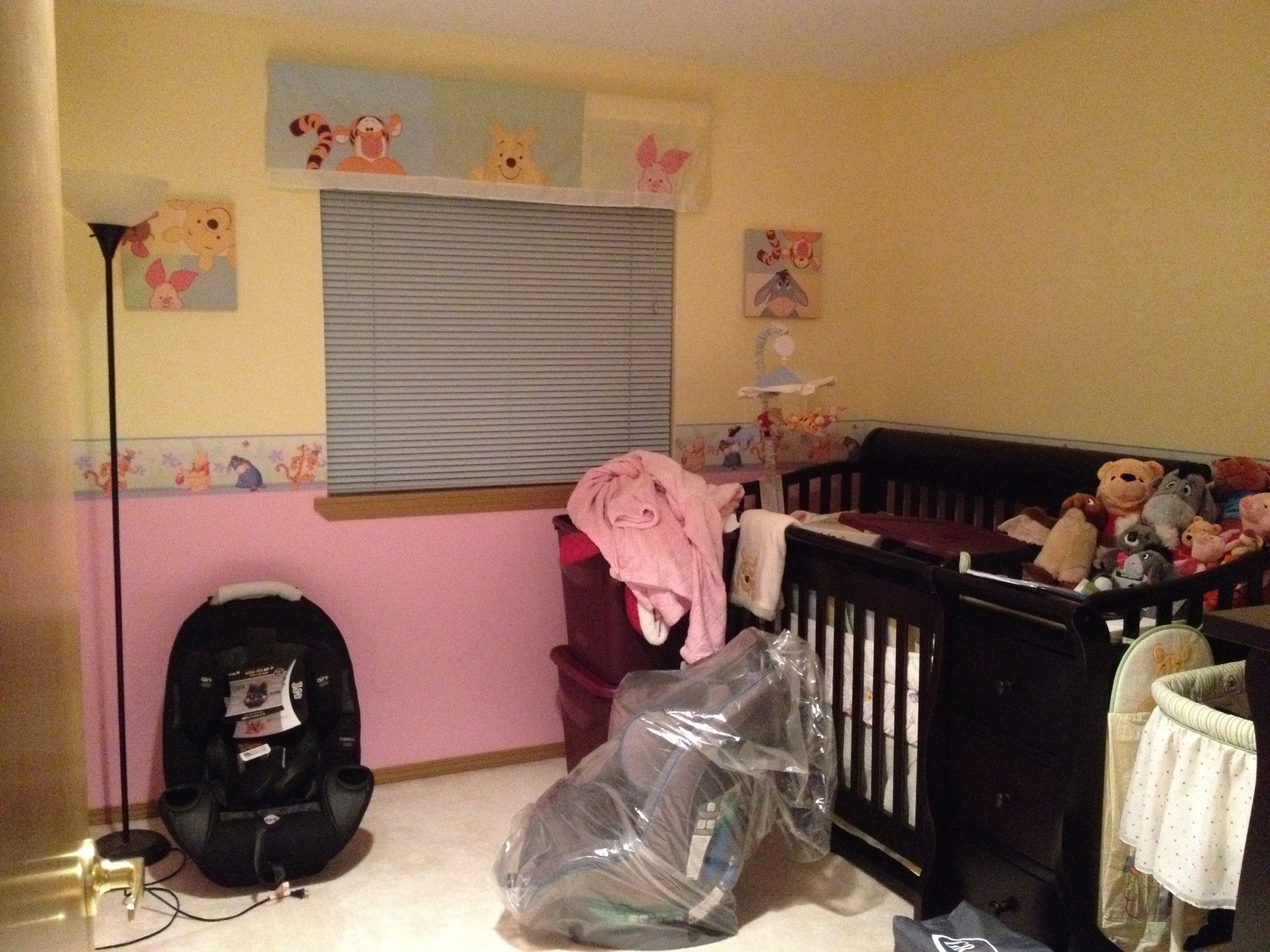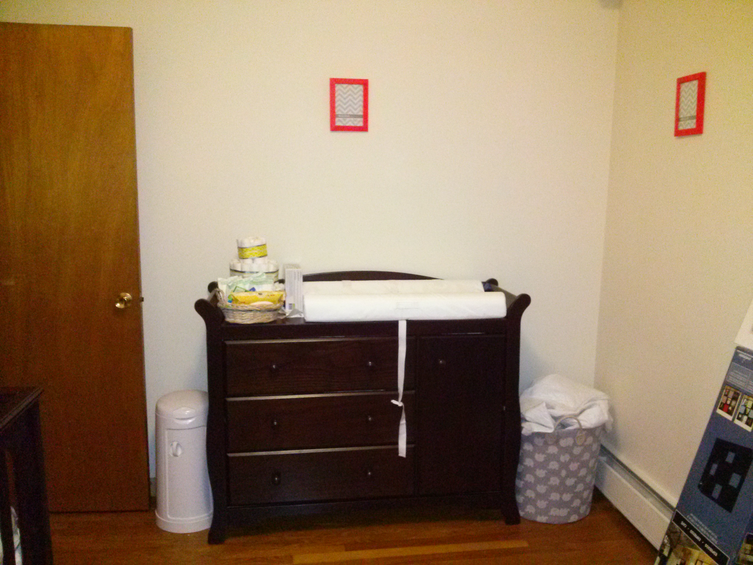 The picture frames aren't staying on the walls, and that purple drawer thing will be replaced with a bookcase. I still have a lot of decorating to do, and a glider to purchase, but progress is being made!