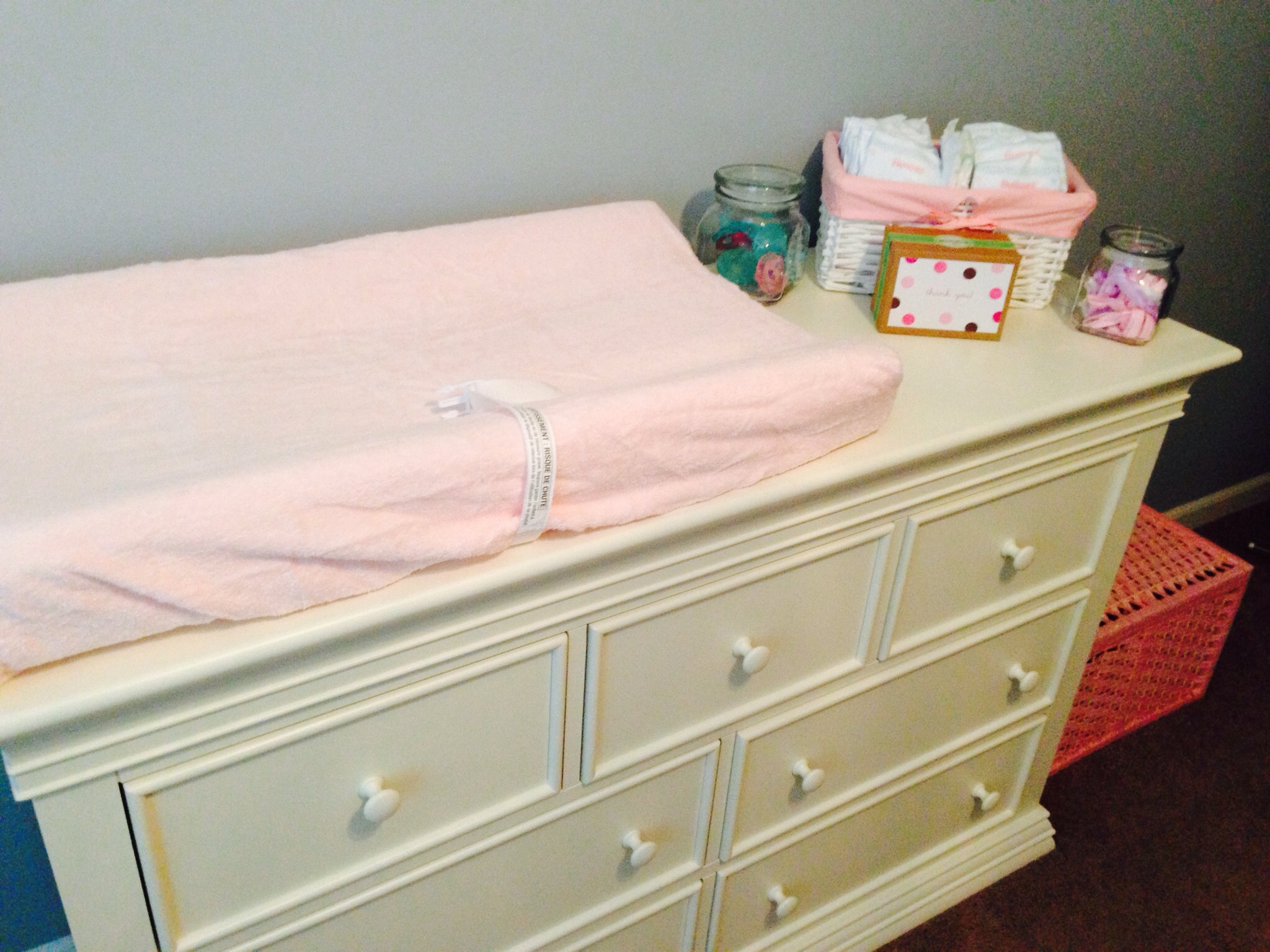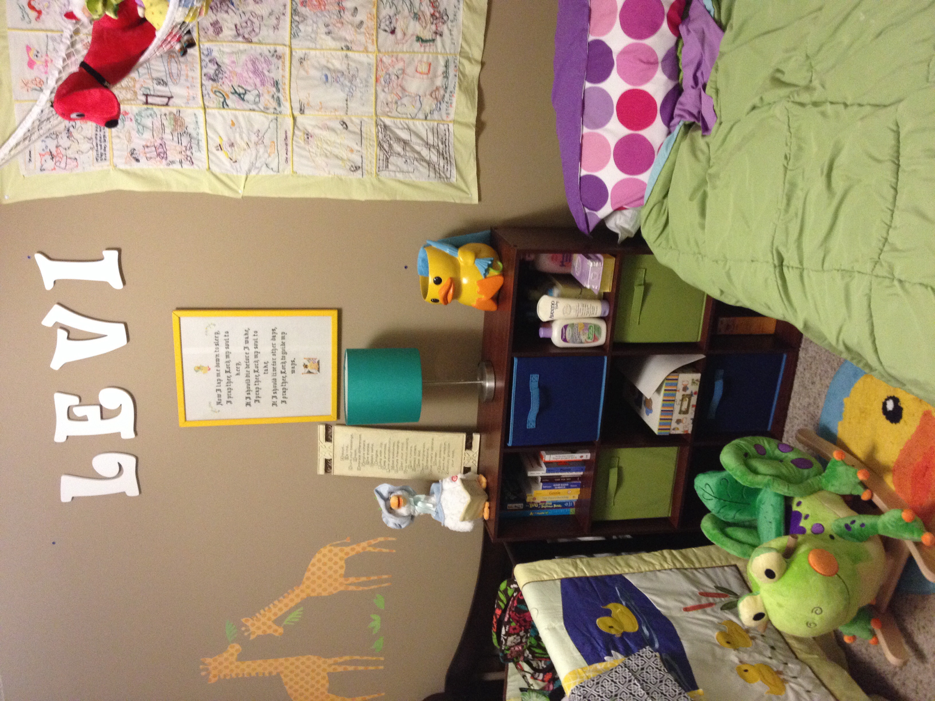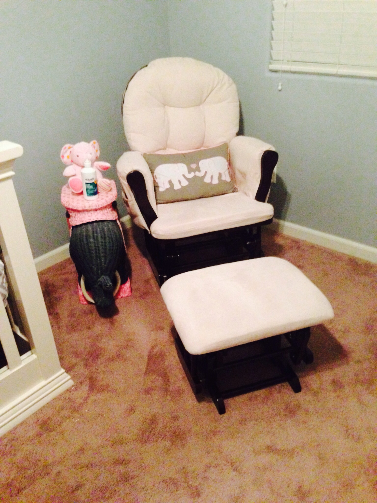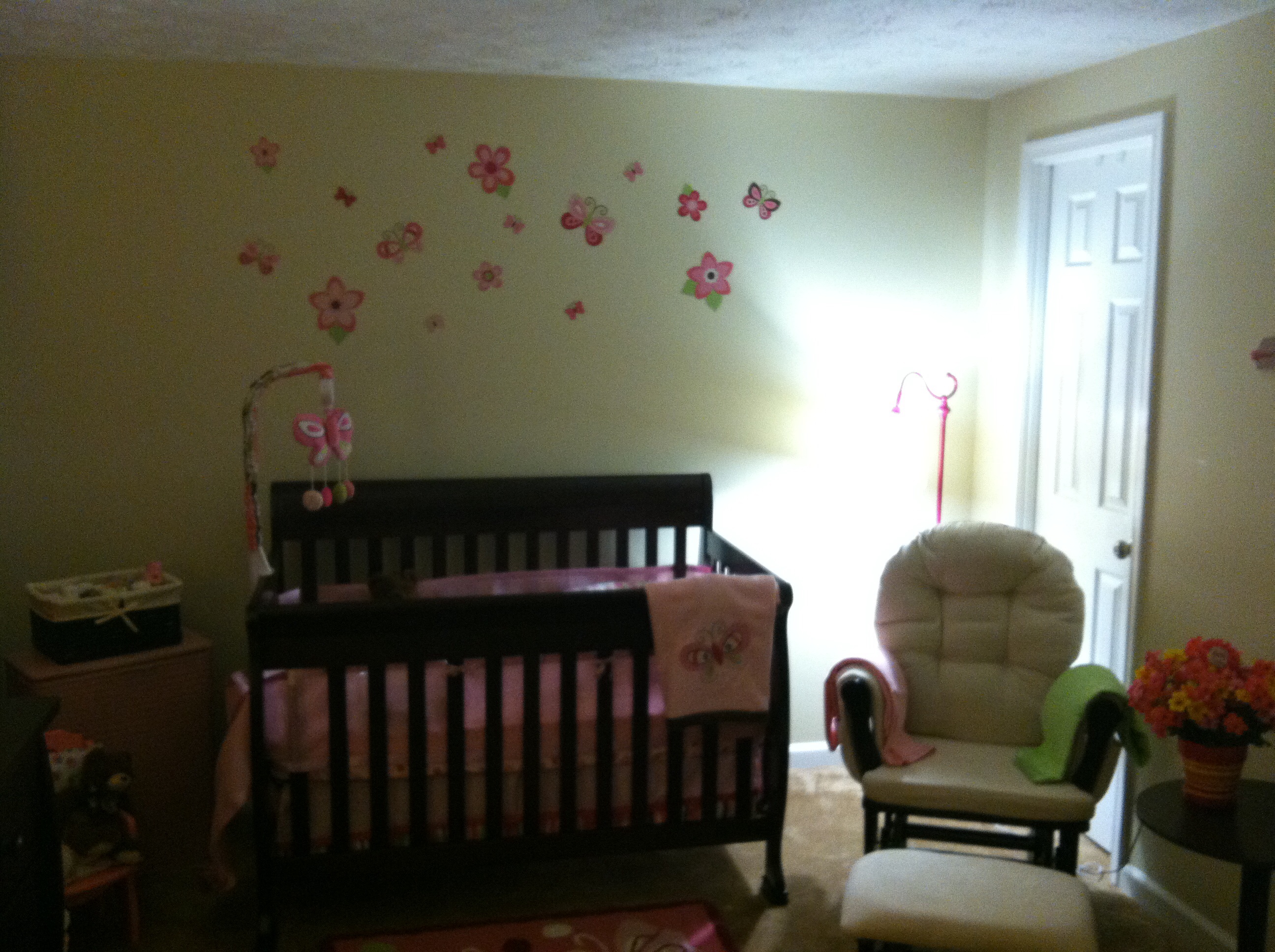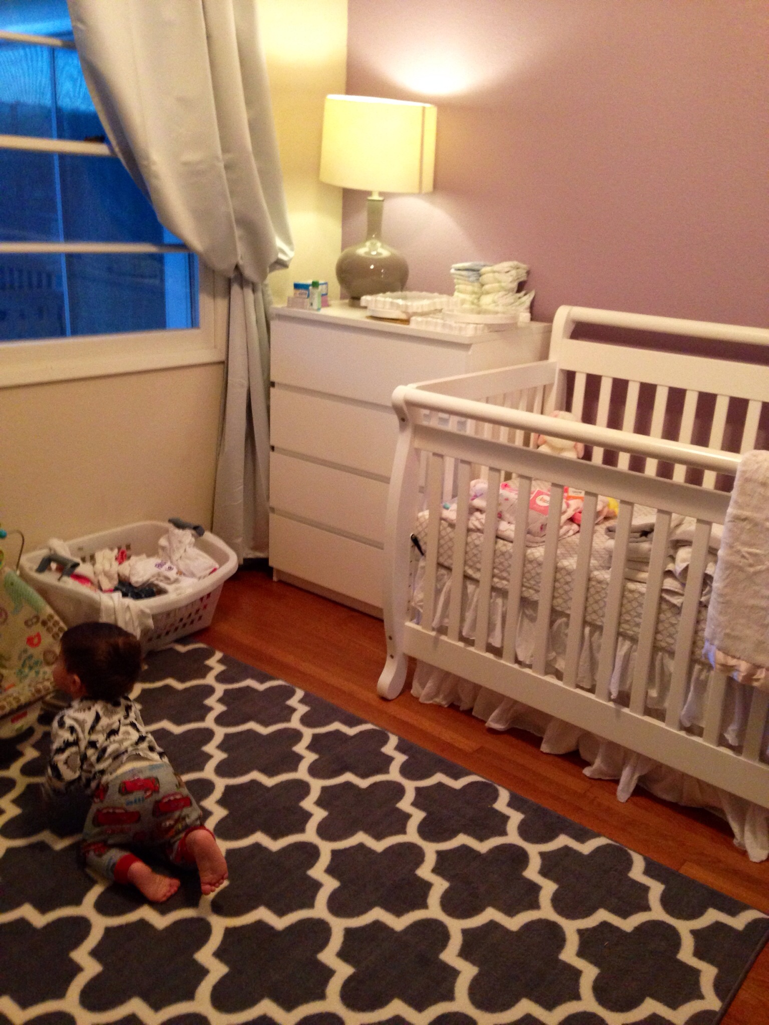 The picture frames aren't staying on the walls, and that purple drawer thing will be replaced with a bookcase. I still have a lot of decorating to do, and a glider to purchase, but progress is being made!