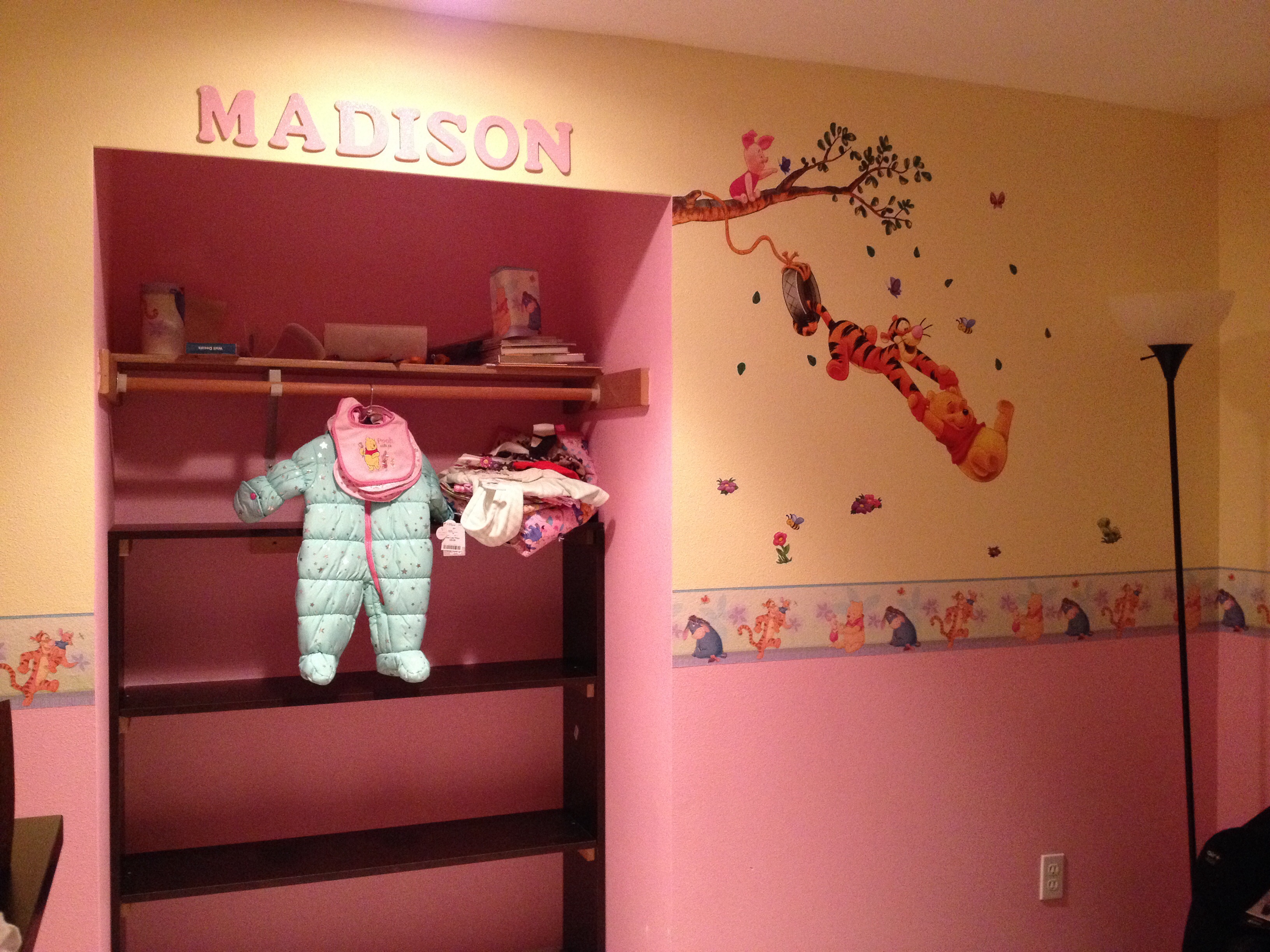 I don't have any current pictures on my computer. It has drywall now though!! DH just has to finish the puttying, and then my brother is going to paint, and then FINALLY I can put in all of her stuff. I am so excited!!