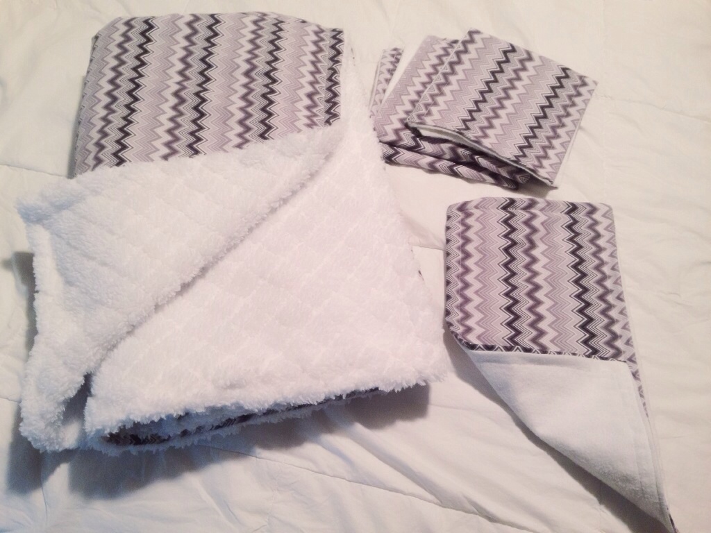 The paw print blanket and burpcloths will be from the pups, tag blankets for all! Only one of them know the sex so I went with green minky for the rest.