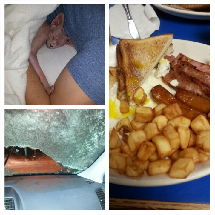 For myself, I was really hoping to get one great photo and which I did of DH playing hockey - but- as I thought about it this morning it turns out the highlight of my week was yesterday morning. It was about 5am and we were both warm in our beds when I got a craving for a big breakfast and wanted to go out Now! DH got up (he's NOT a morning person), helped me slide down the icy driveway, chopped about 2inches of ice off the vehicle, and then we drove around for almost an hour looking for a breakfast joint that was open in the middle of a mini ice storm. So I documented it in 3 pics.