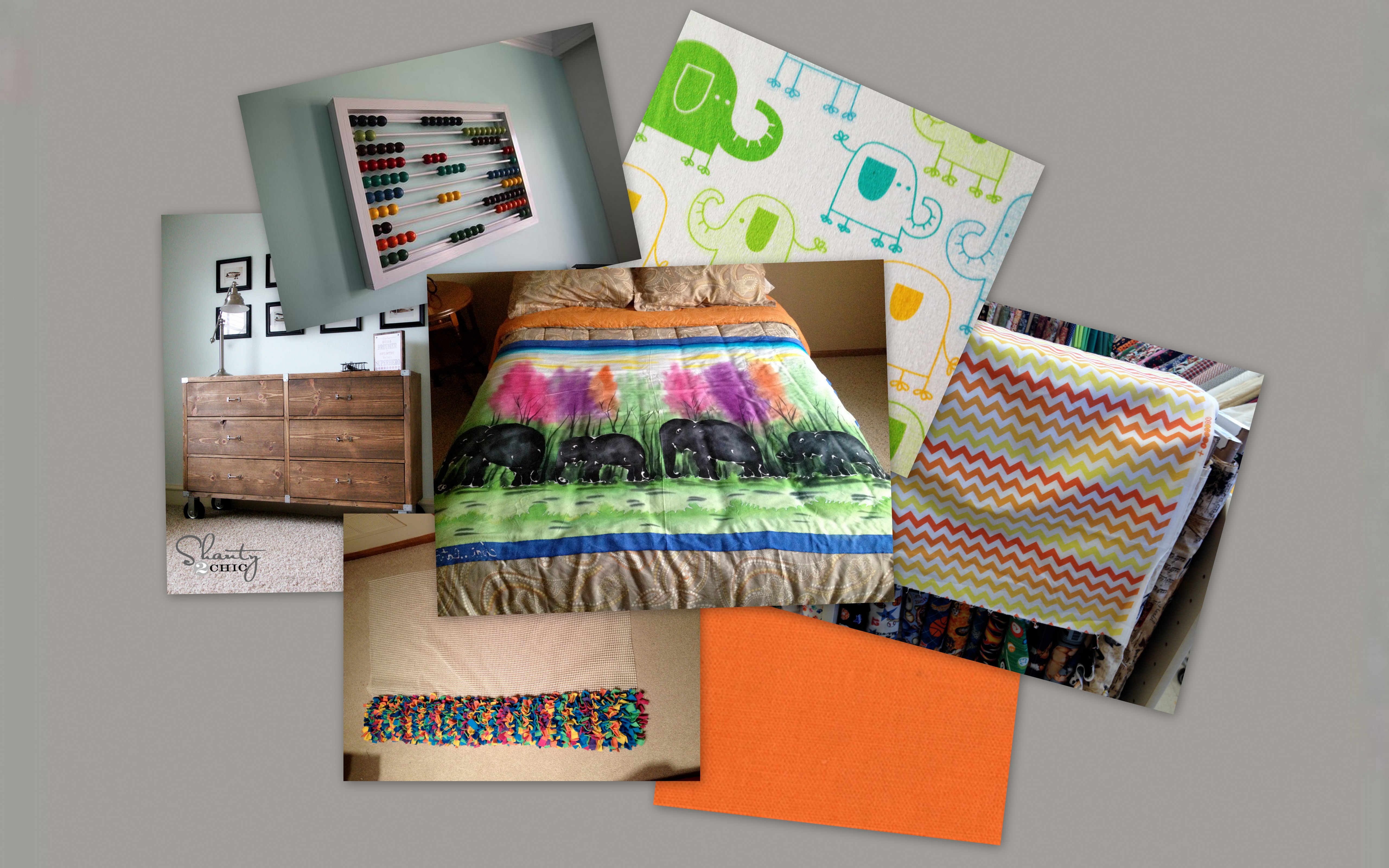 - Upper left: Example abacus that will go above the changing table. The balls will be in the same colors as the elephant print and the wood will be darker, not white.
