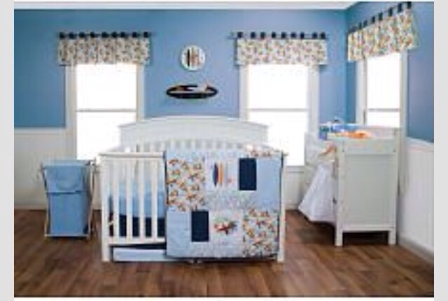 We plan to get a white crib, glider and bookshelf and we'll be painting an existing dresser the aqua color to coordinate with the sheets. We find out the sex next week, but since we plan to have one more after this and re-use the nursery, we're going gender neutral-ish. (it's still more boy colored, but if it's a girl, I might add in some girly accents)