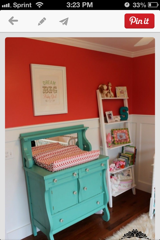We haven't started yet because we have to move DS1 to guest room downstairs, DS2 to DS1 room and then can do LO room. Here a couple Picts of my inspiration and one of the dresser I refinished that will be LO with changing pad on top. Yes I am using the dresser for the time being