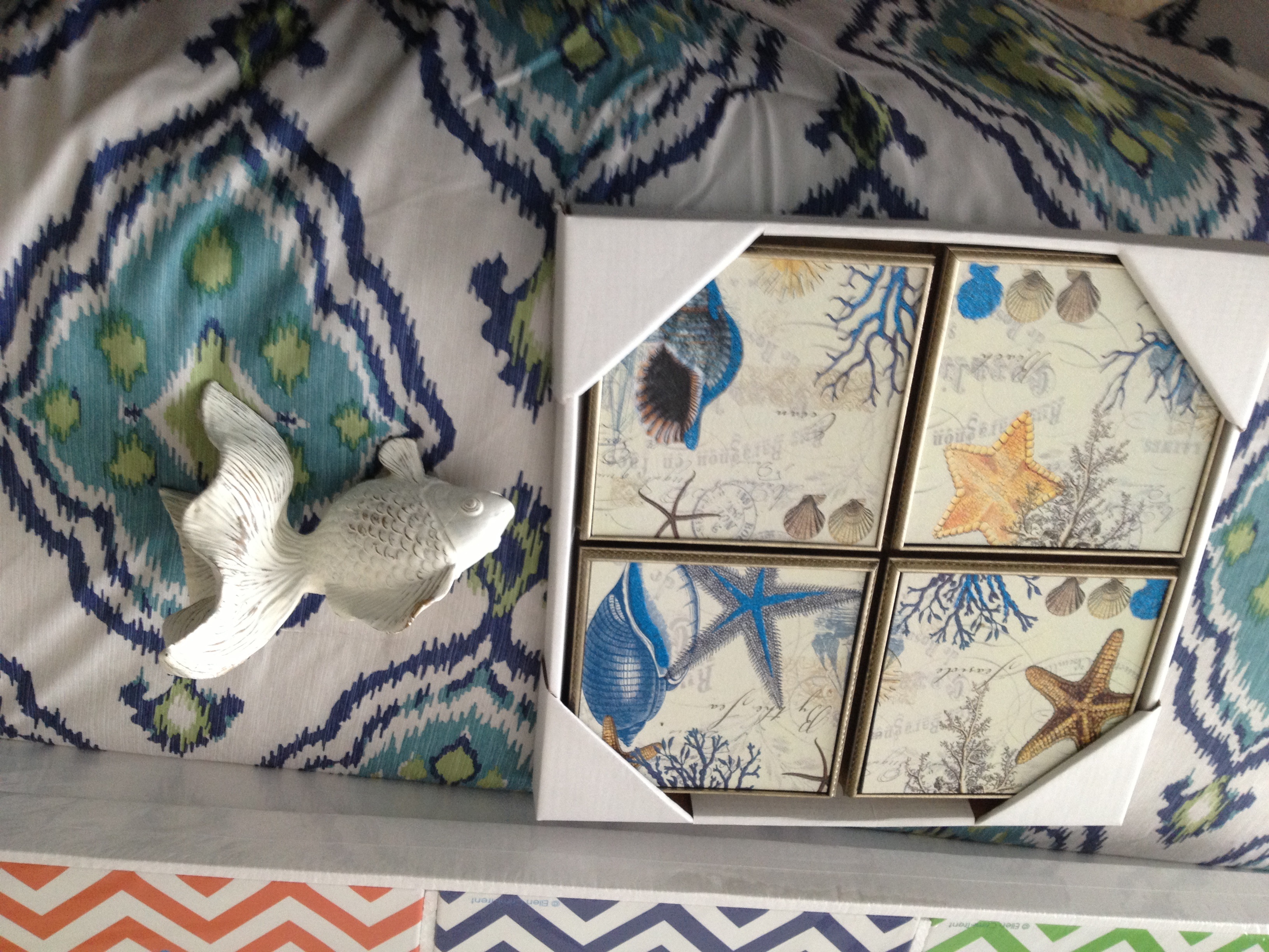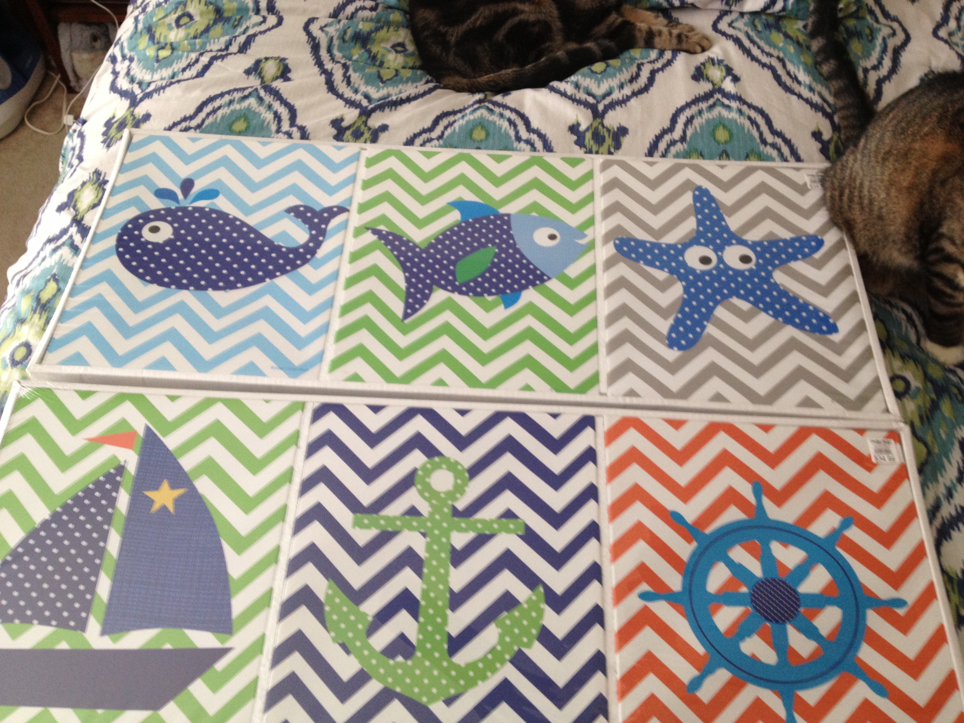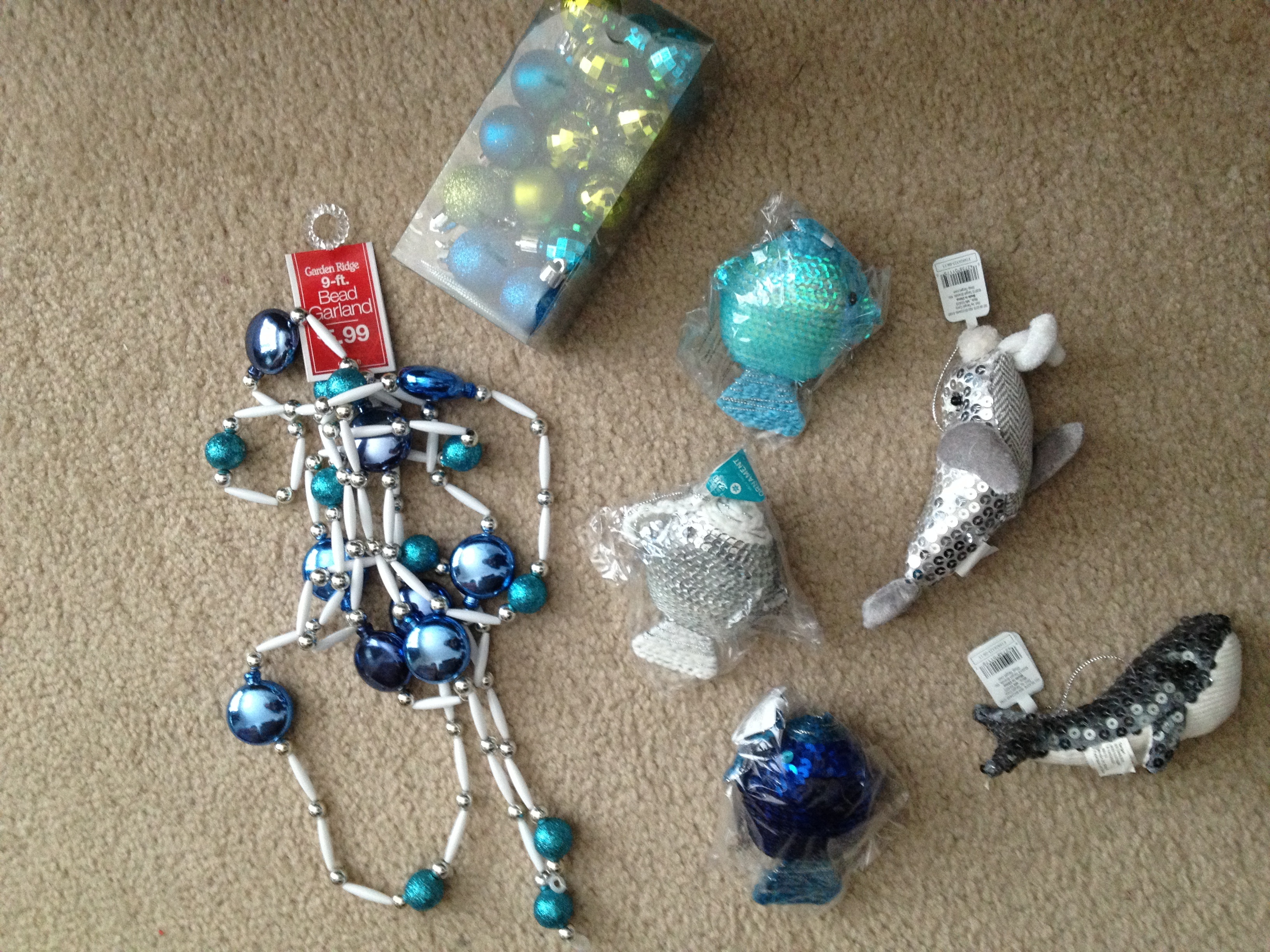 With my mom here he tends to spoil us no matter what we try, so while she was here she got everything we could possibly want or need for Tyler's room since we've kept everything from our oldest. We went with a nautical/under the sea theme (Not like nemo, just whales, fish, blues and aquas, with a few accents of gray, green and a touch of orange.) we even found the perfect artwork yesterday before she left. Even found everything for his Christmas tree in his theme for next year (each kid has one in their rooms)