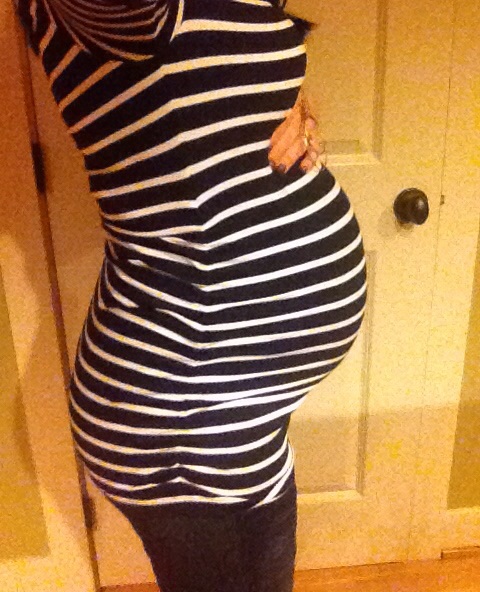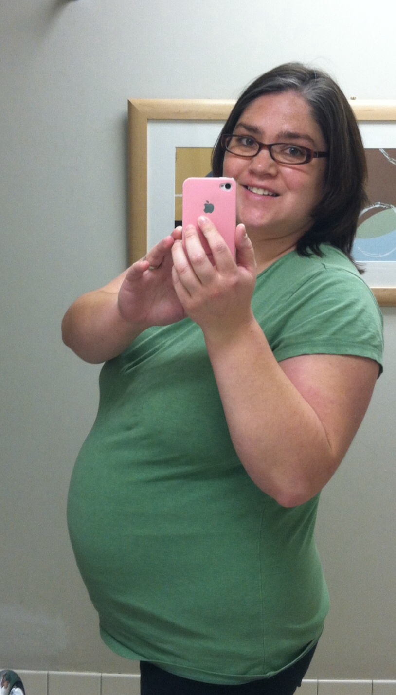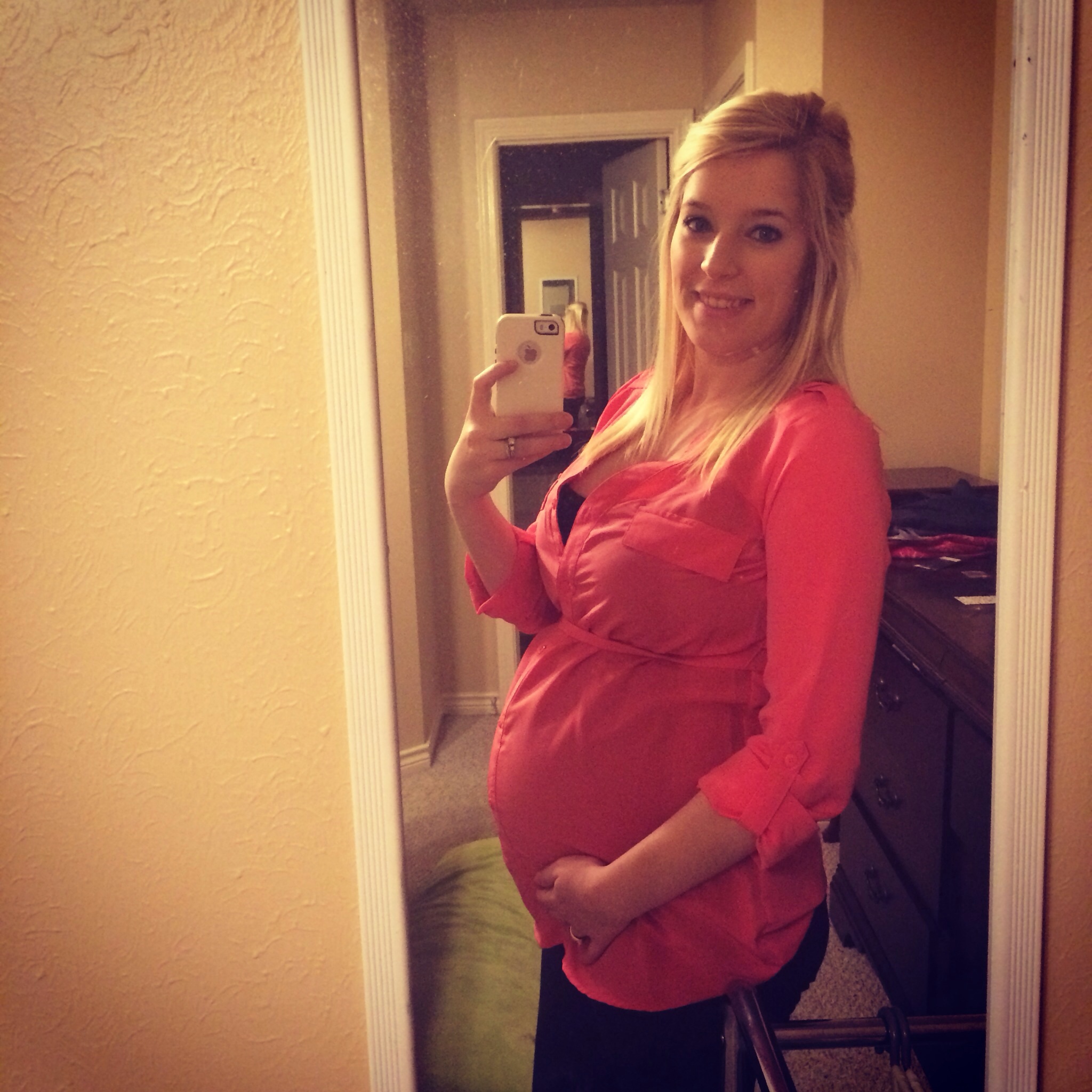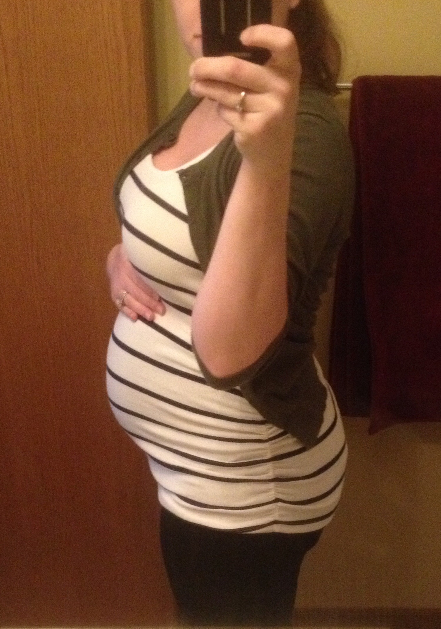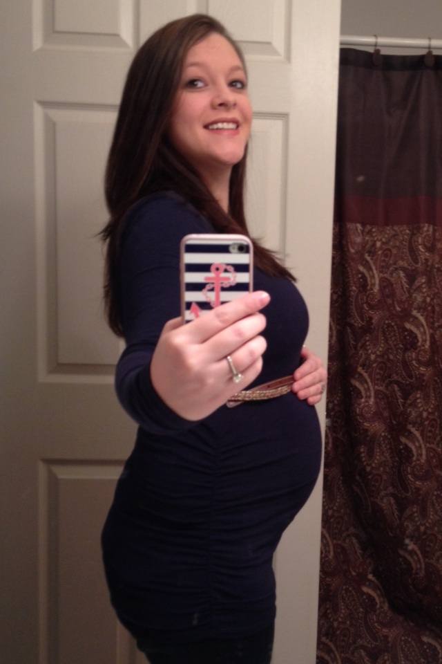 This was taken at 28 weeks a few days ago. I already regret buying a button-down maternity shirt because my boobs are already almost too big for the stupid button!