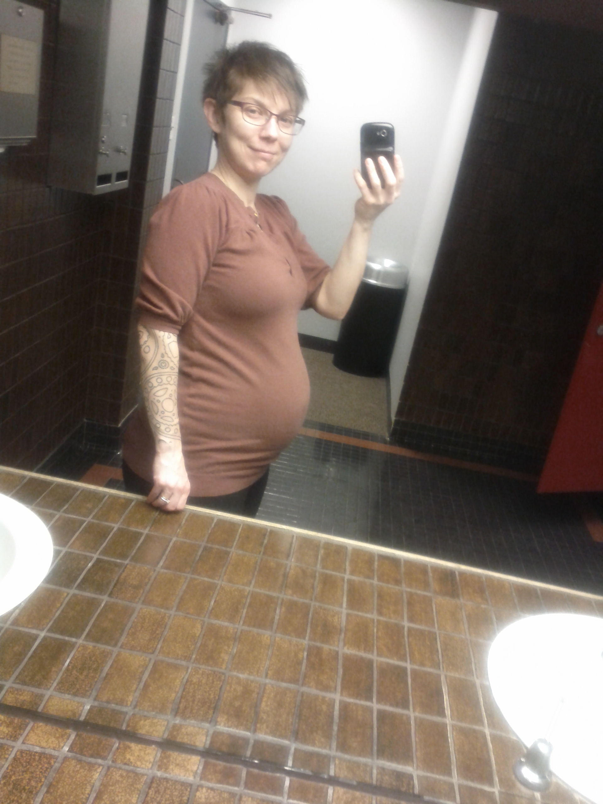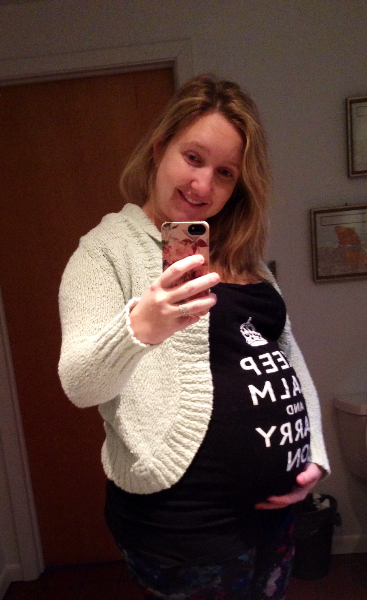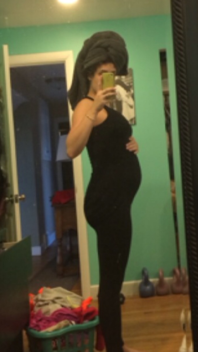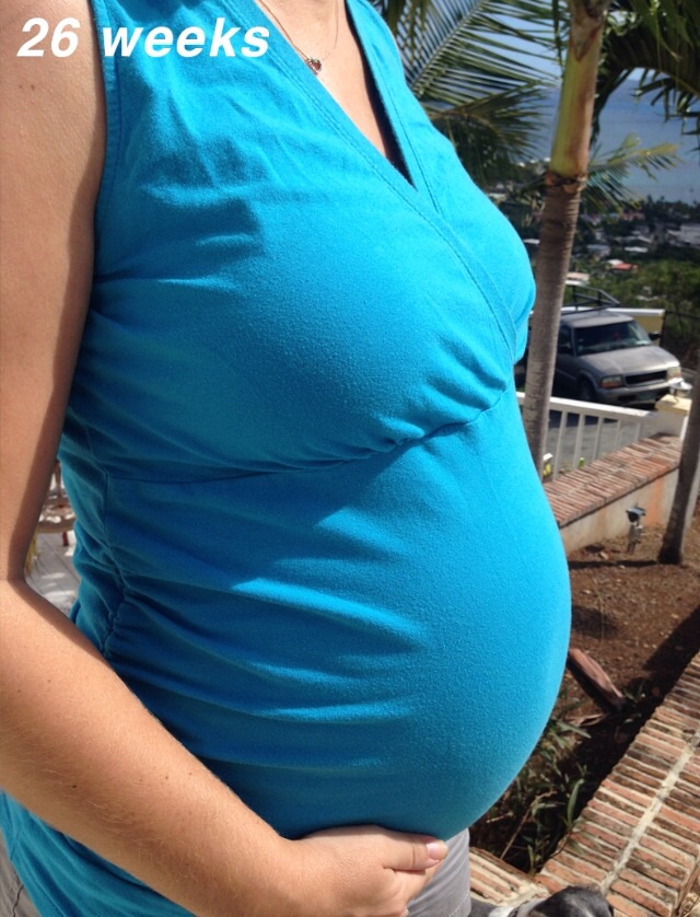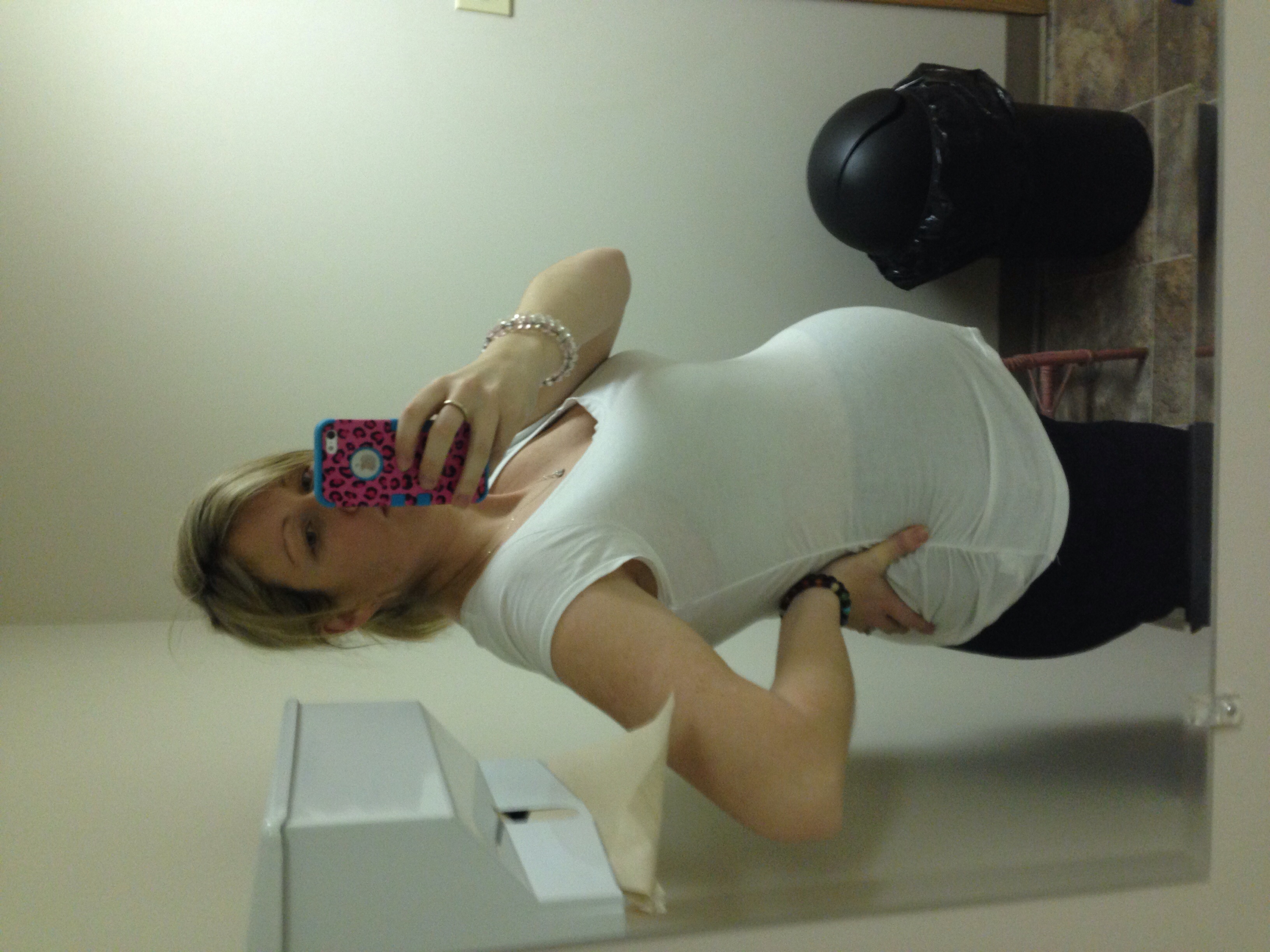 This was taken at 28 weeks a few days ago. I already regret buying a button-down maternity shirt because my boobs are already almost too big for the stupid button!