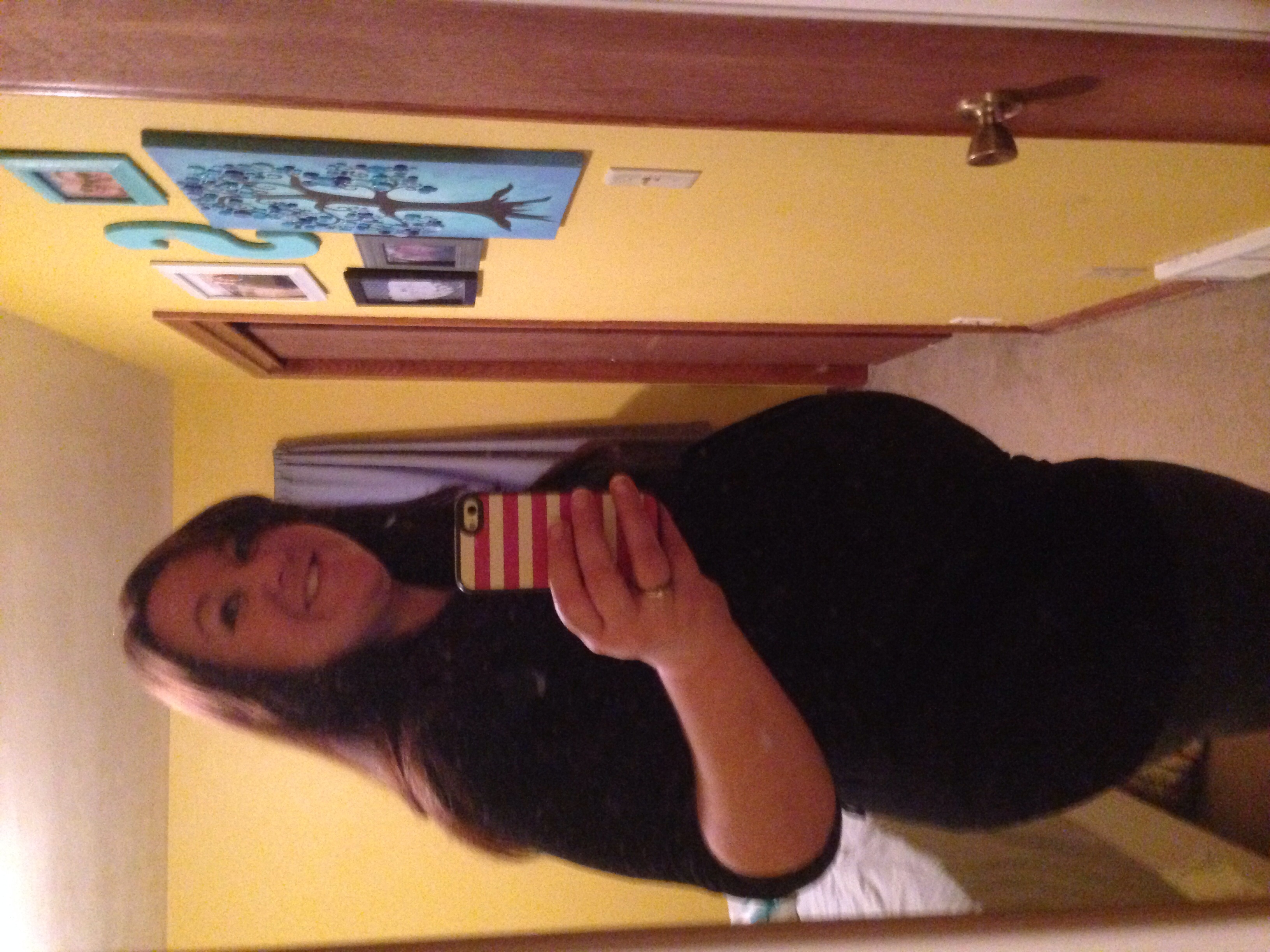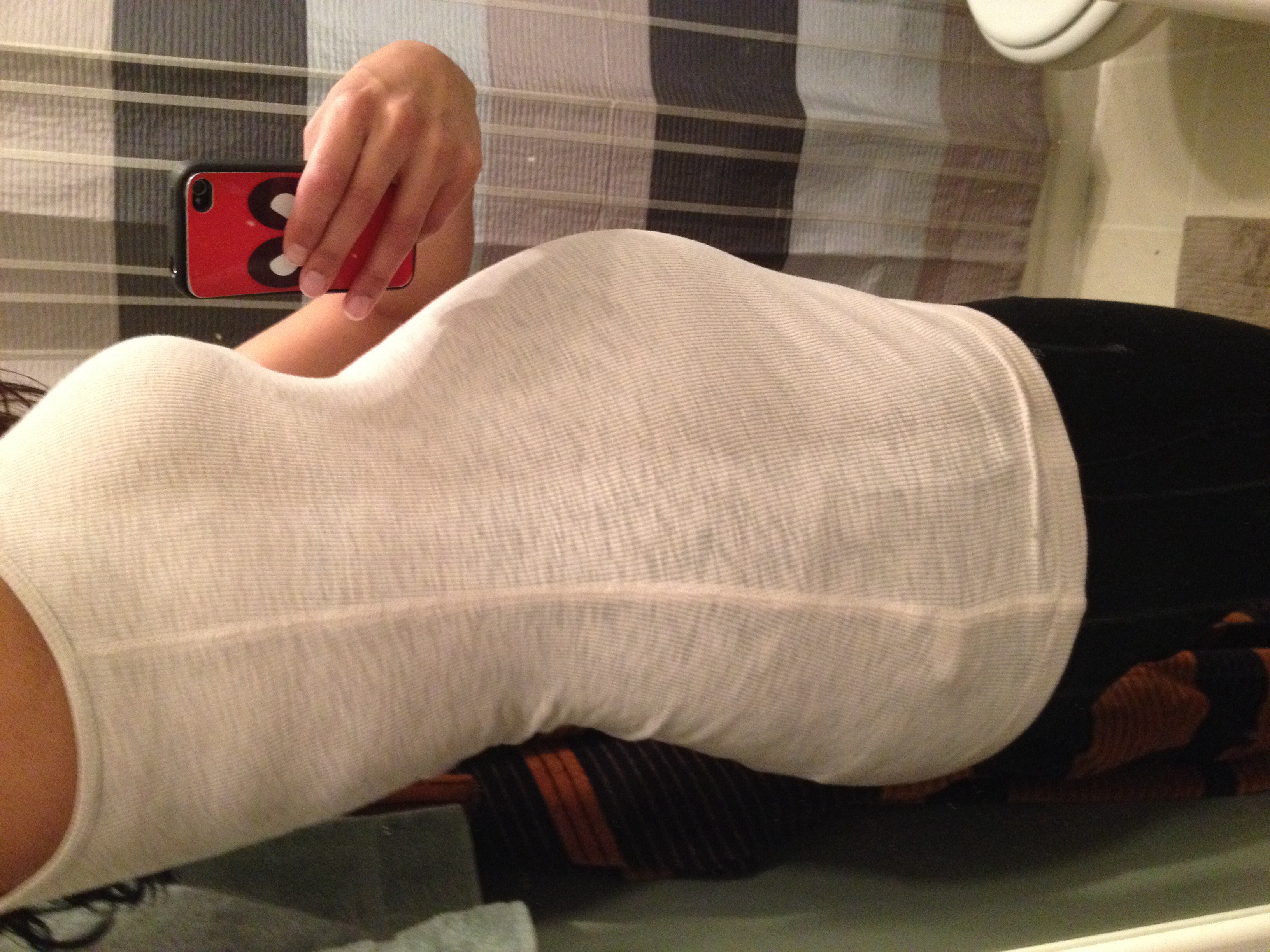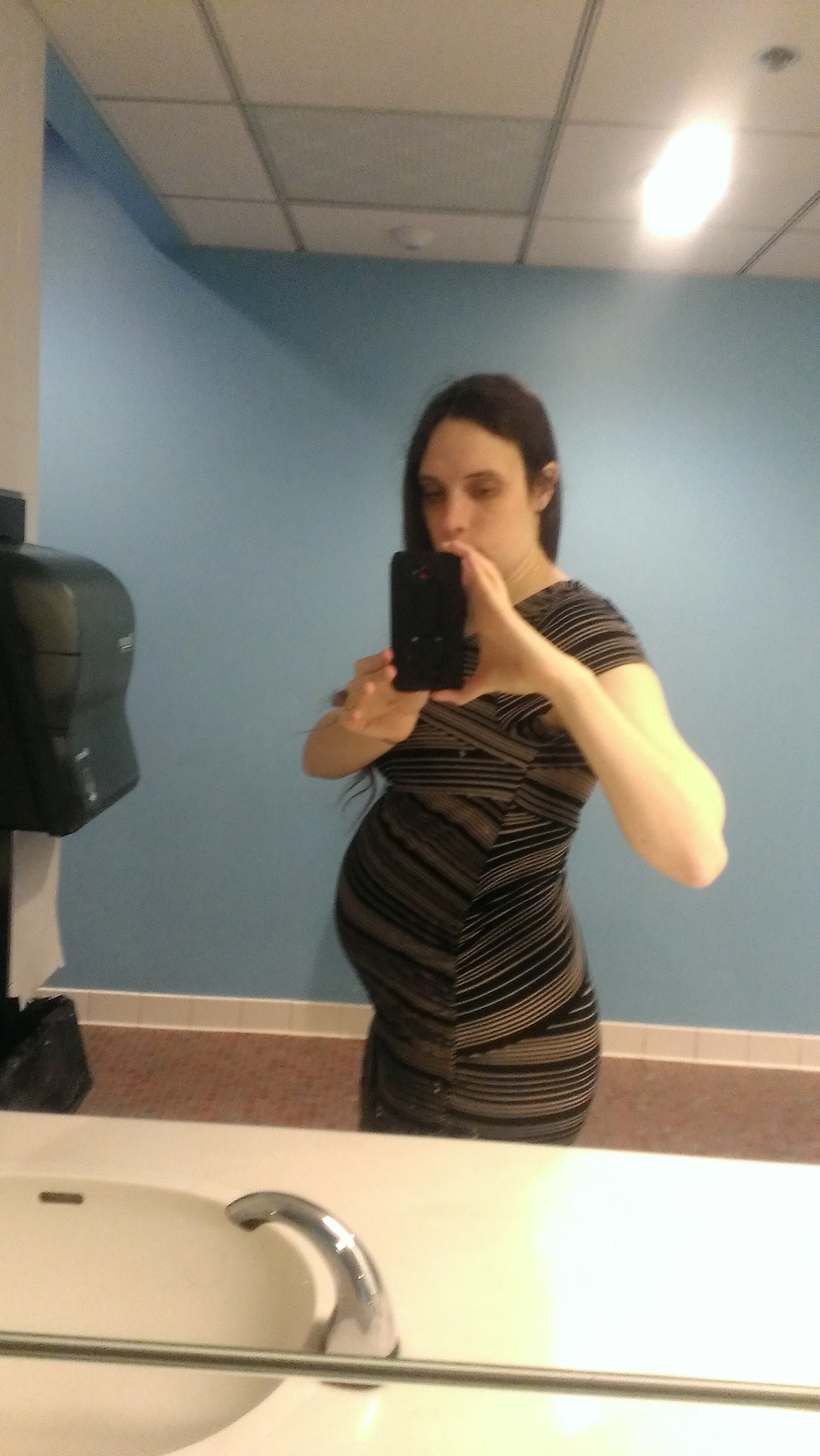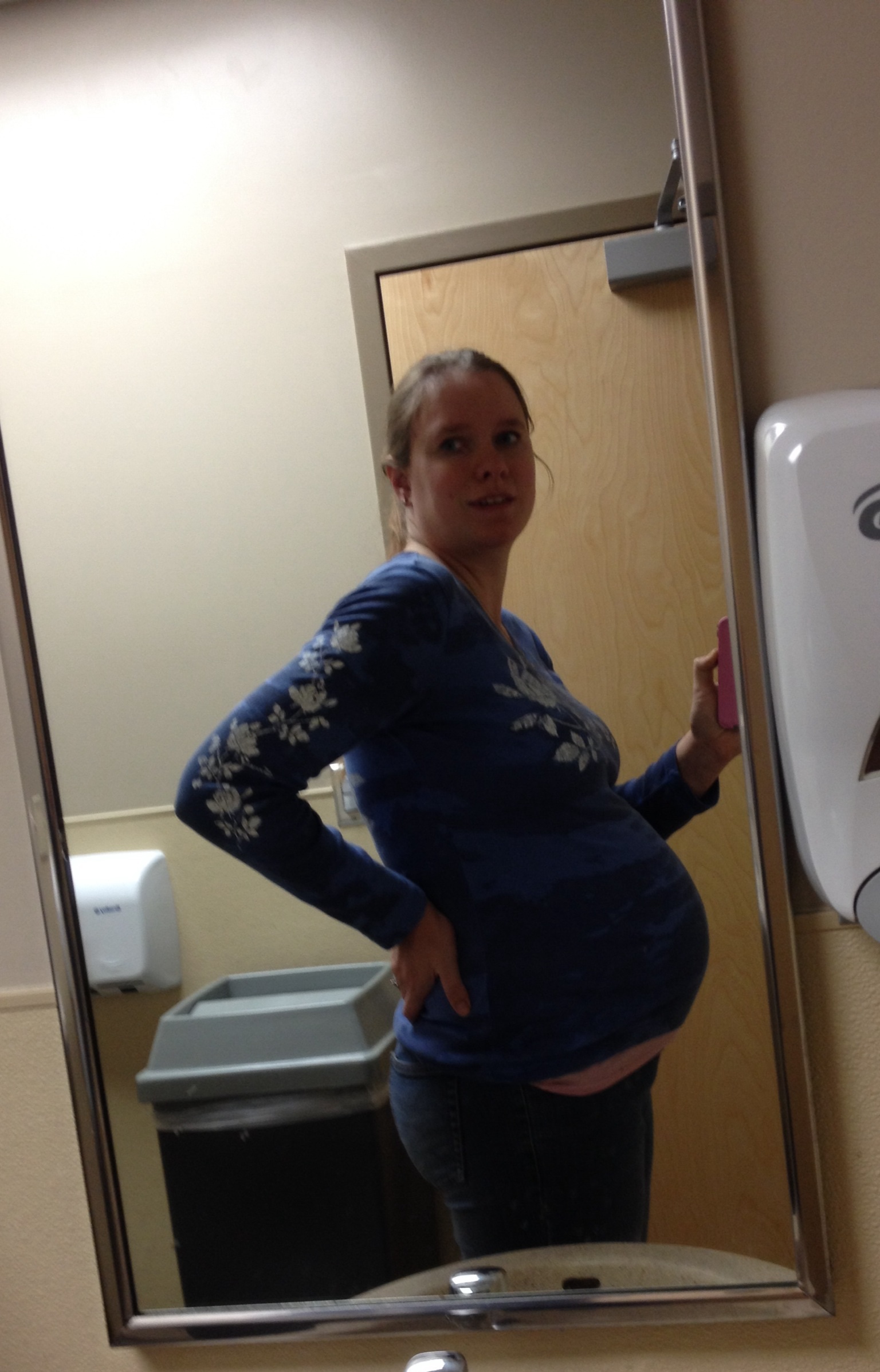 This was taken at 28 weeks a few days ago. I already regret buying a button-down maternity shirt because my boobs are already almost too big for the stupid button!
