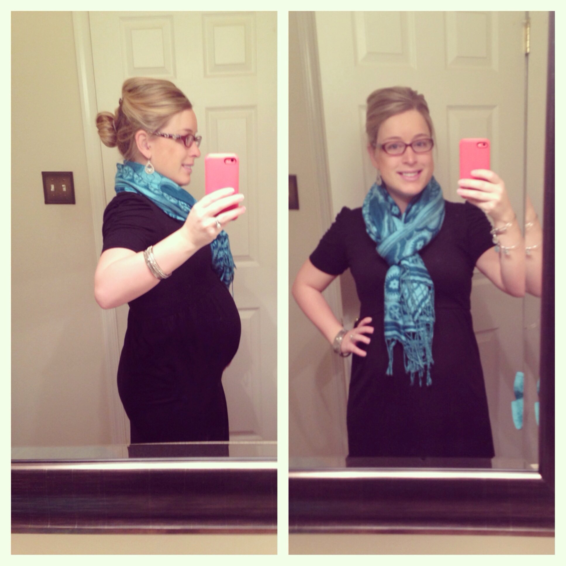 The bumps are looking beautiful! I love seeing the bumps at different stages during our pregnancies. I'm 28w1d and feeling pretty FINNtastic (see what I did there--I'm naming my baby boy Finnegan). However, I am experiencing extreme back pain. Also, my shoes match my scarf today and well, that made me happy!