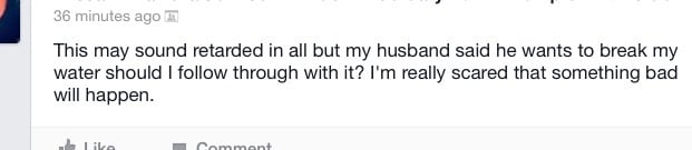 Holy f%#$ balls! I think I've seen the world's dumbest post ever. Taken from a "Due in February" Facebook group. Chick is 36+1 and is just not going to make it because baby has been sitting on her pelvis for 7 weeks. Does anyone else find this completely insane? Do people really do things like this?