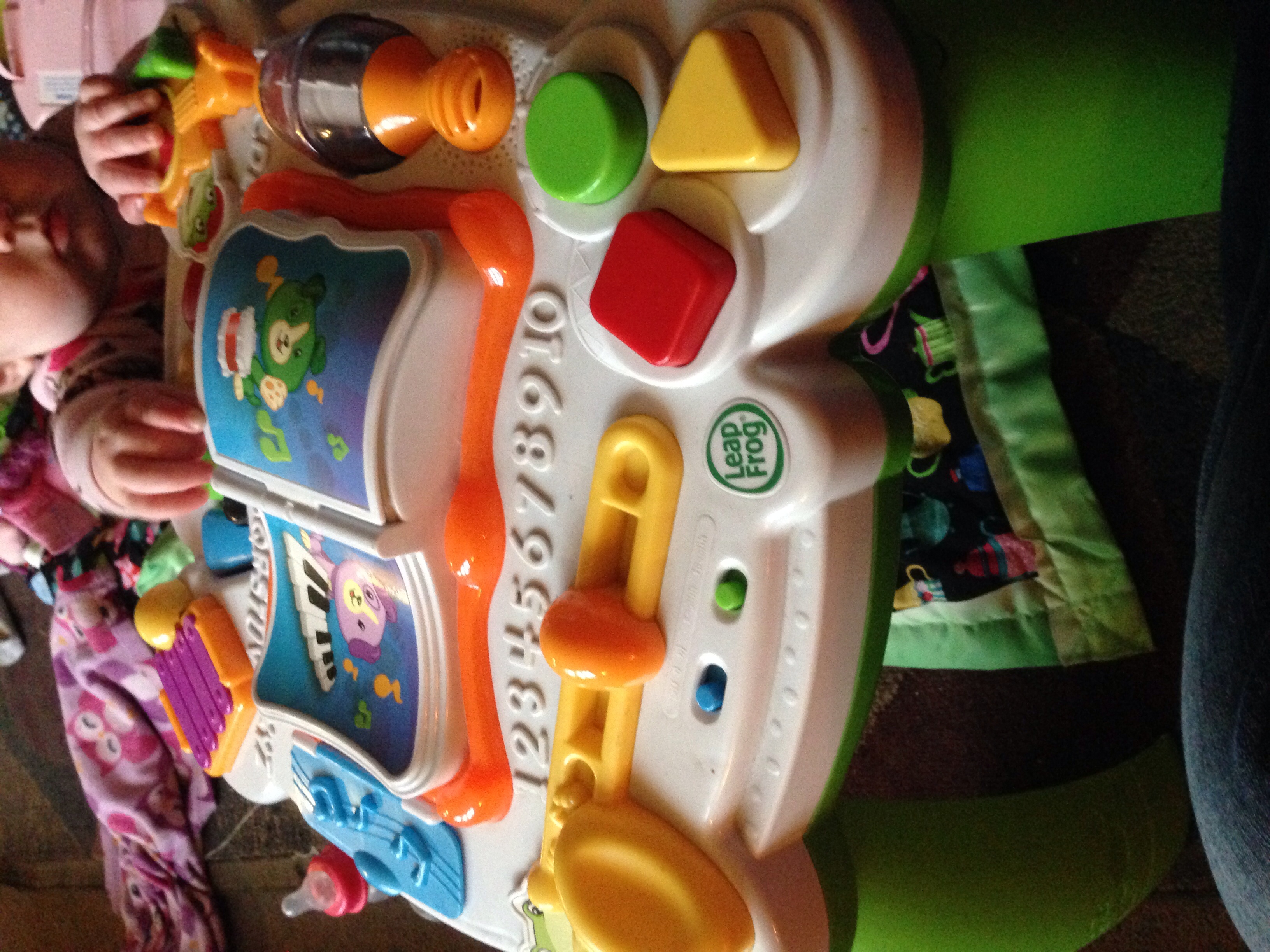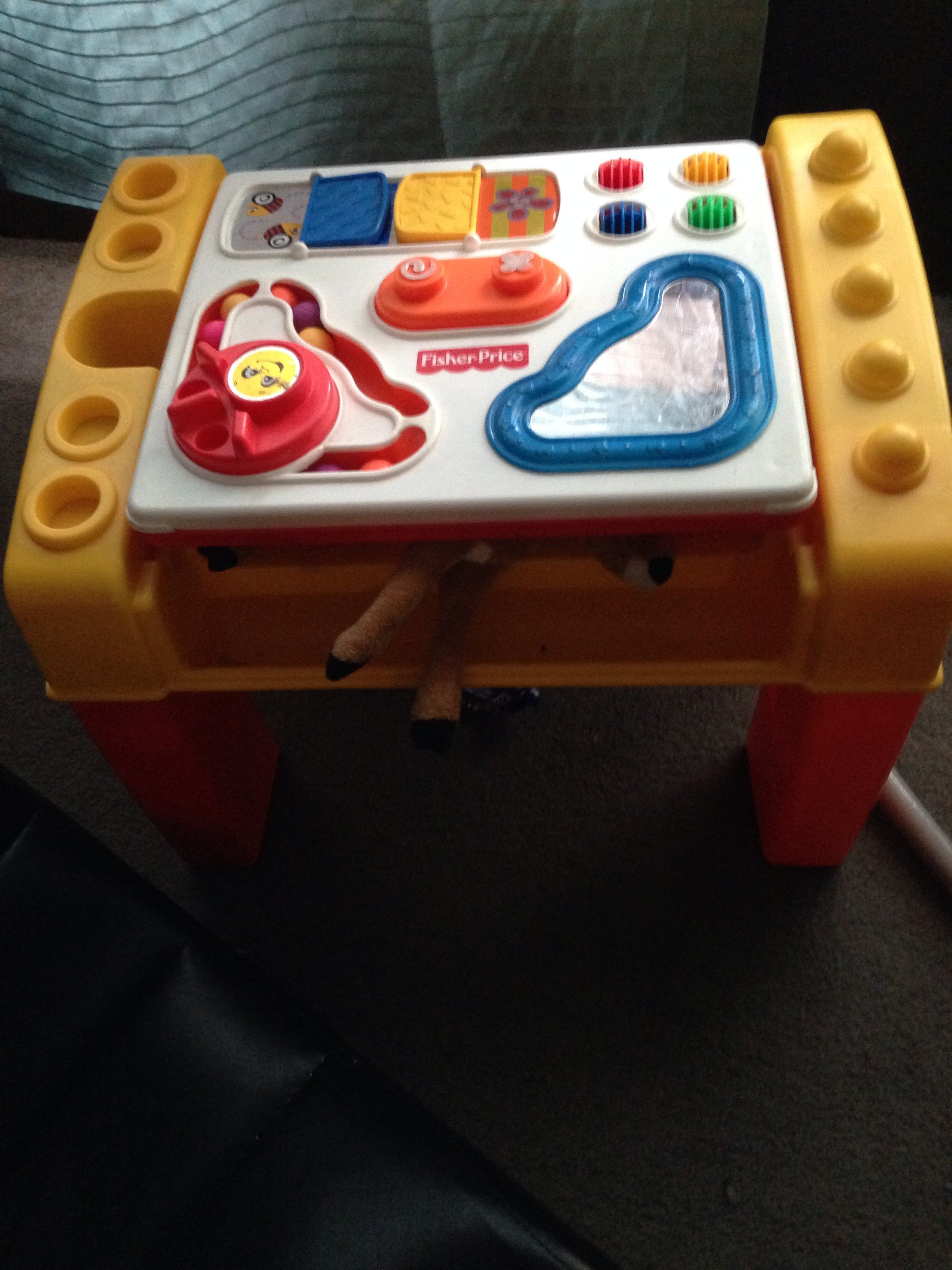 Ben tries to pull himself up on his activity table, but, well... He is 23 lbs so it tumps over Maybe one day they will make one of these things that is 40 lbs so chunkers like him can pull up safely. Poor little squishy.