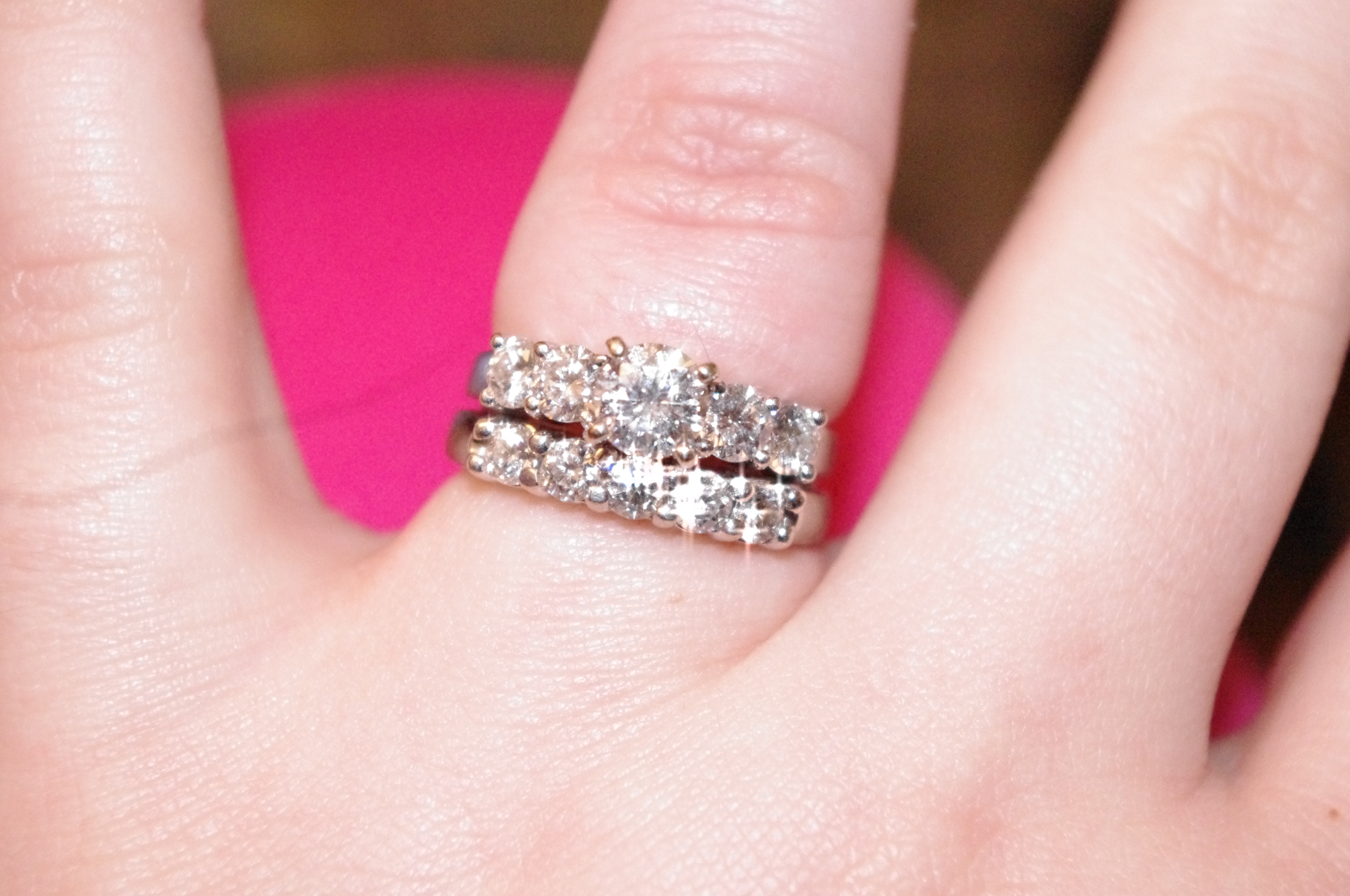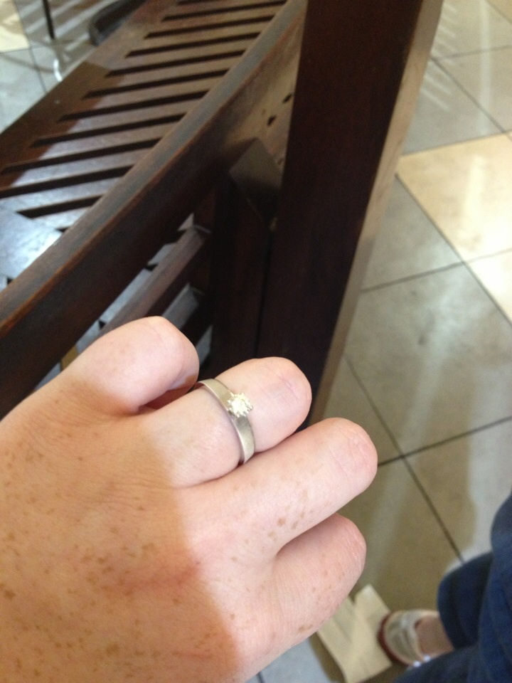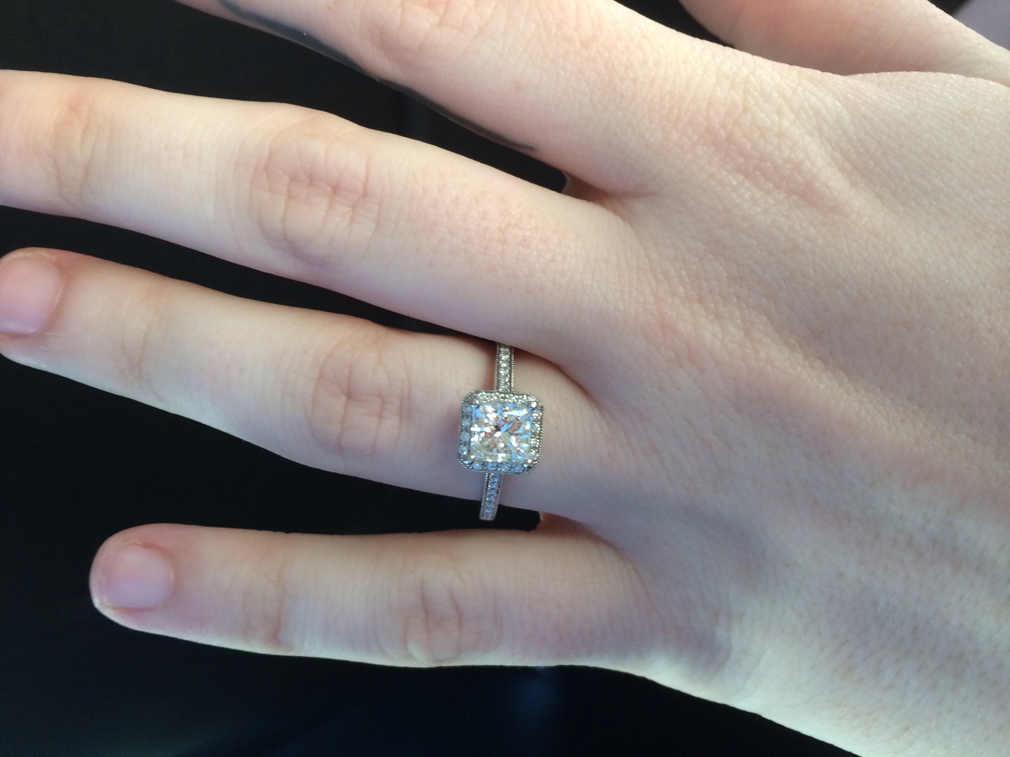 My friends and I would go and check out the rings. I loved this one. J went with me to see it 6 months before he proposed. He than got a jeweller to make the same ring with better quality diamonds (We wanted Canadian Diamonds). I can't believe he remembered exactly how it looked.
