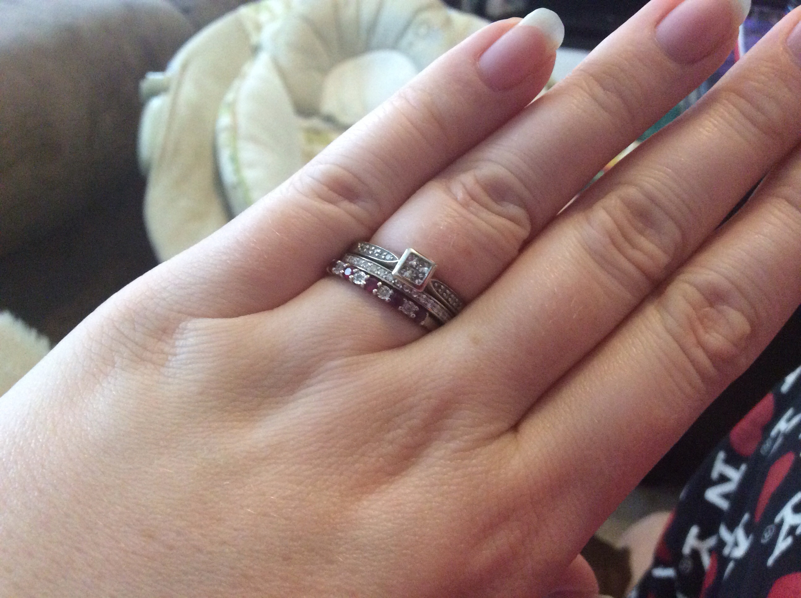 My dream ring. I had one just like this one when I was 13 and swore its be my wedding ring but lost it when we moved. DHs mom wanted me to have we ring and when I received it I was so shocked to see it was identical to the one I had when I was younger. It fit when I put it on and so I thought it was fate. I plan to get the kids birthstones put in it soon.