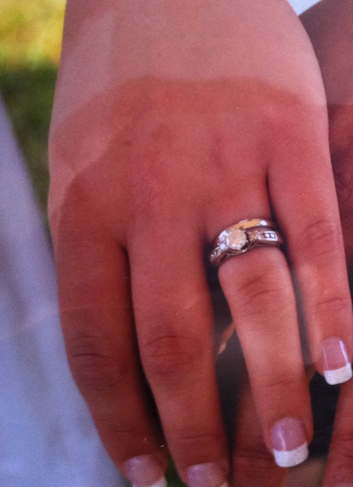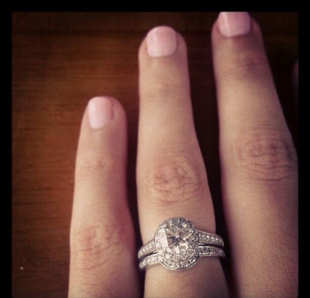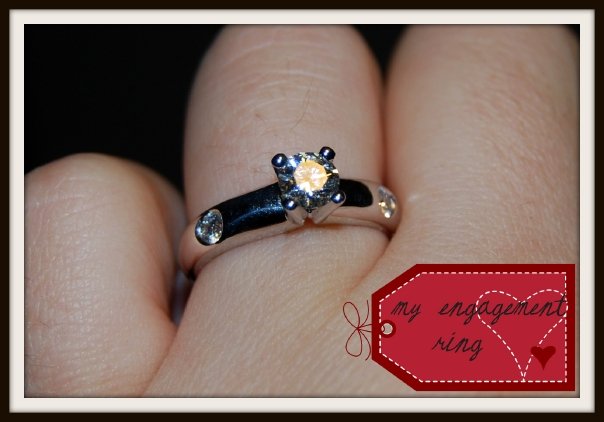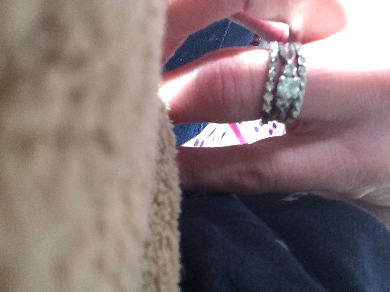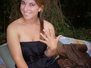 I don't have a close up pic of my ring, but here's the day I got engaged. My rings were H's grandmothers and his ring was his grandfathers. His ring has their initials and wedding date and our initials and wedding date.