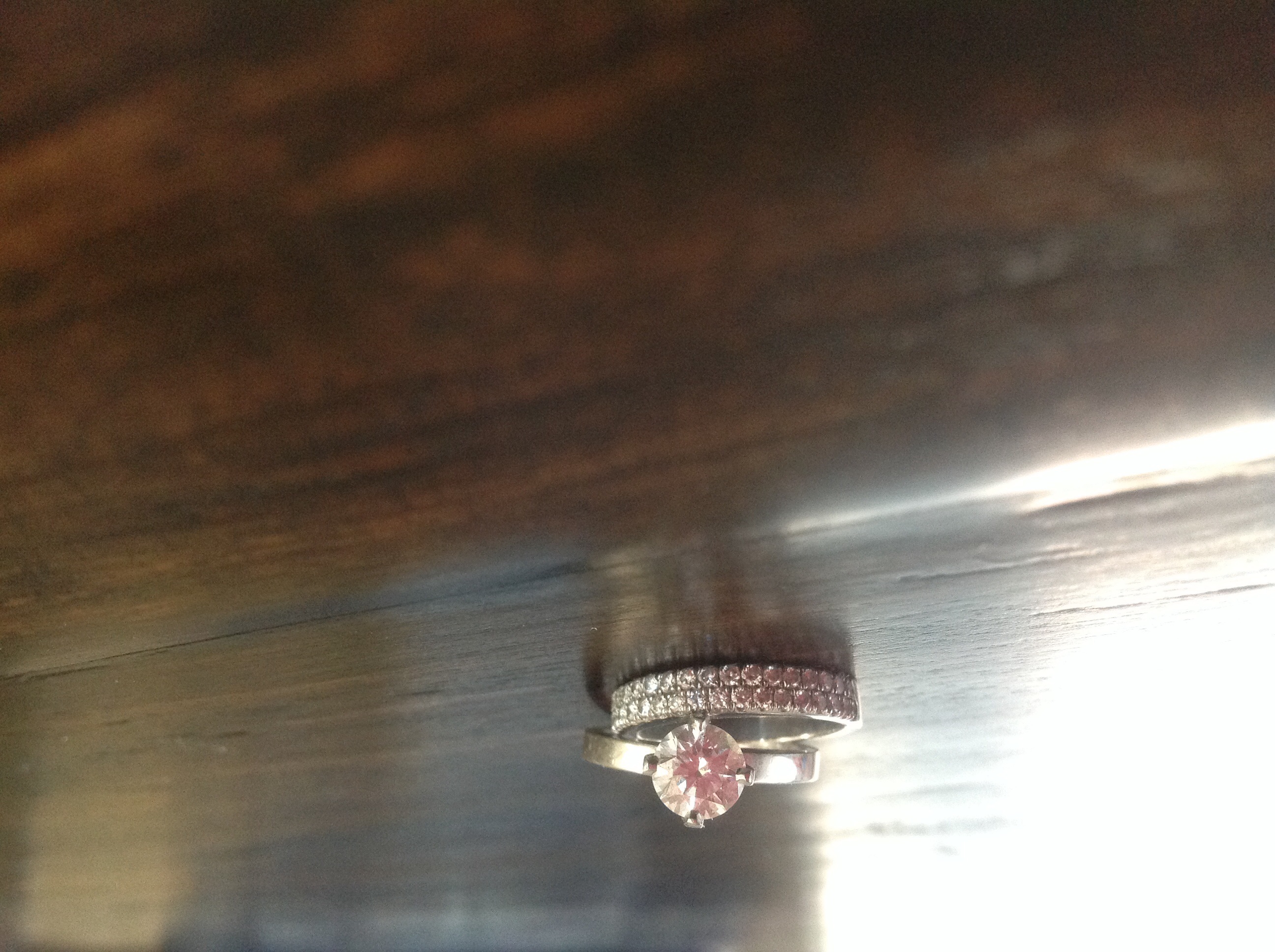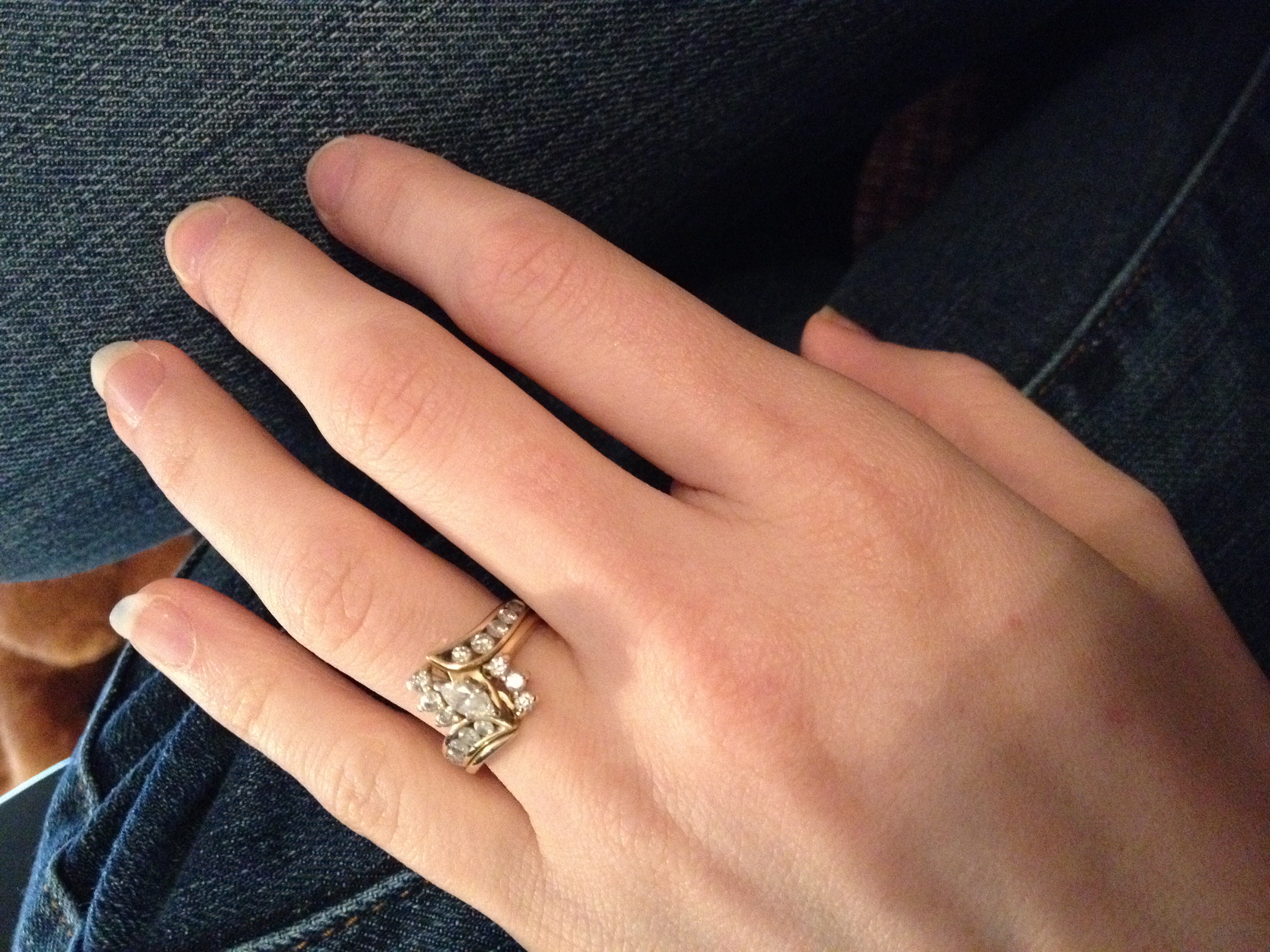 I have a thing that the engagement ring should be frivolous while the wedding band should be serious. Wedding band is just a 2mm gold band, but I love it. And I am kind of proud that I can still get my size 4.5 rings on my finger, even if I can't sausage myself into my pants.