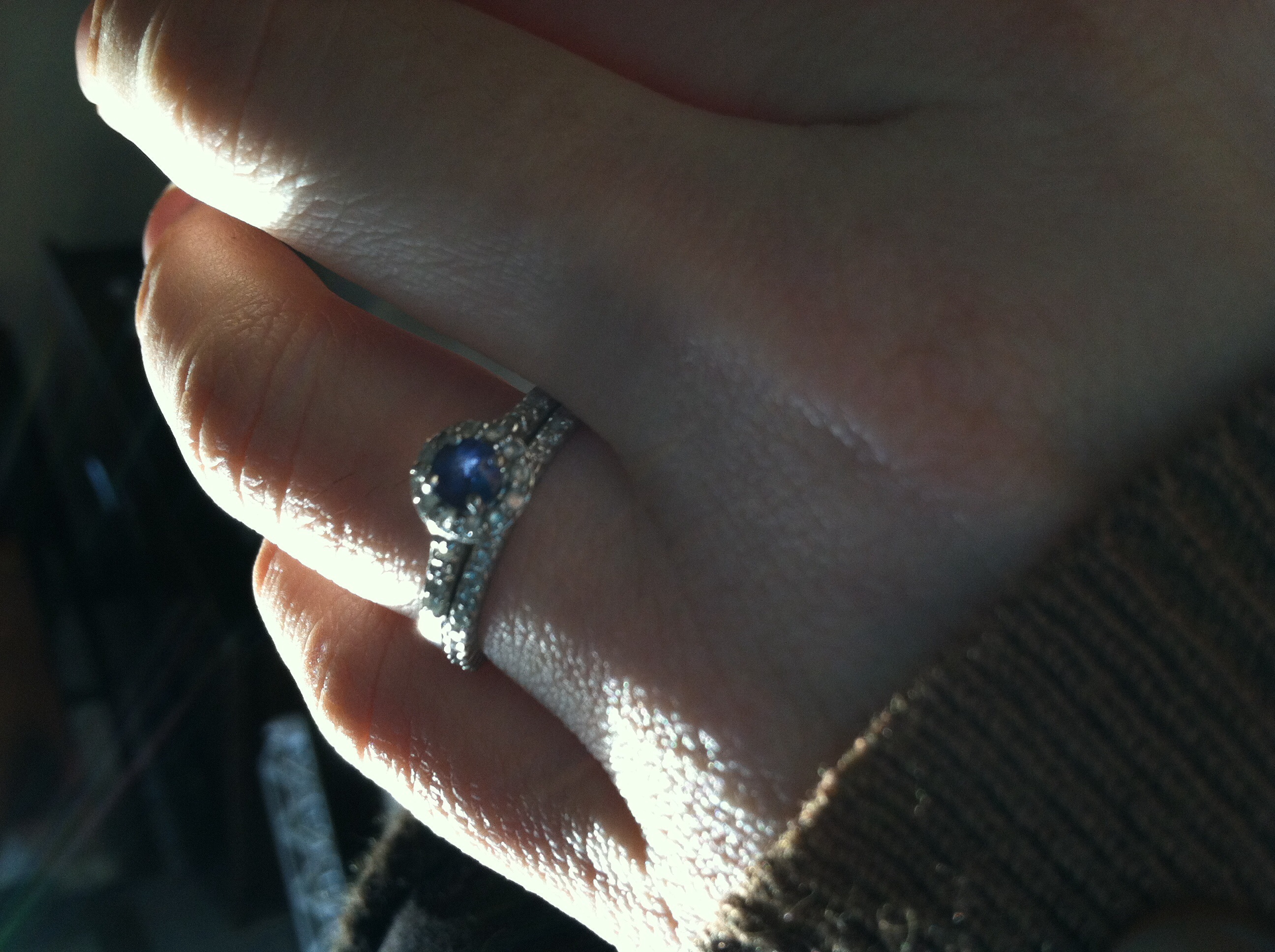 He had no money when he proposed so he bought a $50 ring from Dillard's that I had no issue wearing. He bought me this ring a few months later. I wanted something vintage looking. One day we'll put a diamond in it (maybe). It just had such a ridiculously huge setting it's be crazy expensive and I saw no reason to be in debt over a ring so we put an aquamarine. It's beautiful and I get tons of compliments.