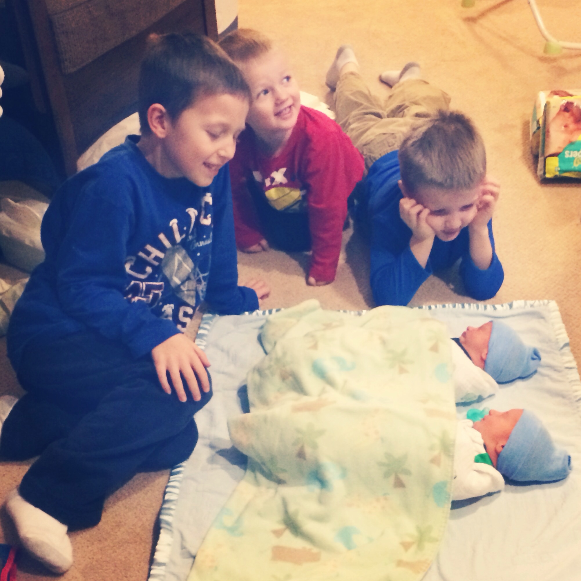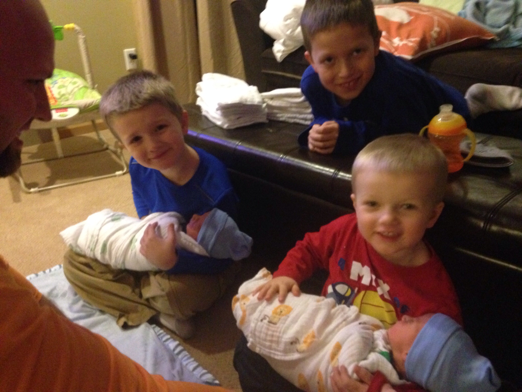 We've been home for 2 days and the boys are bottle feeding while I pump. They latch no problem to the breast but get tired quickly, so I'm building my supply and will try to get them latched and eating from the breast again soon.