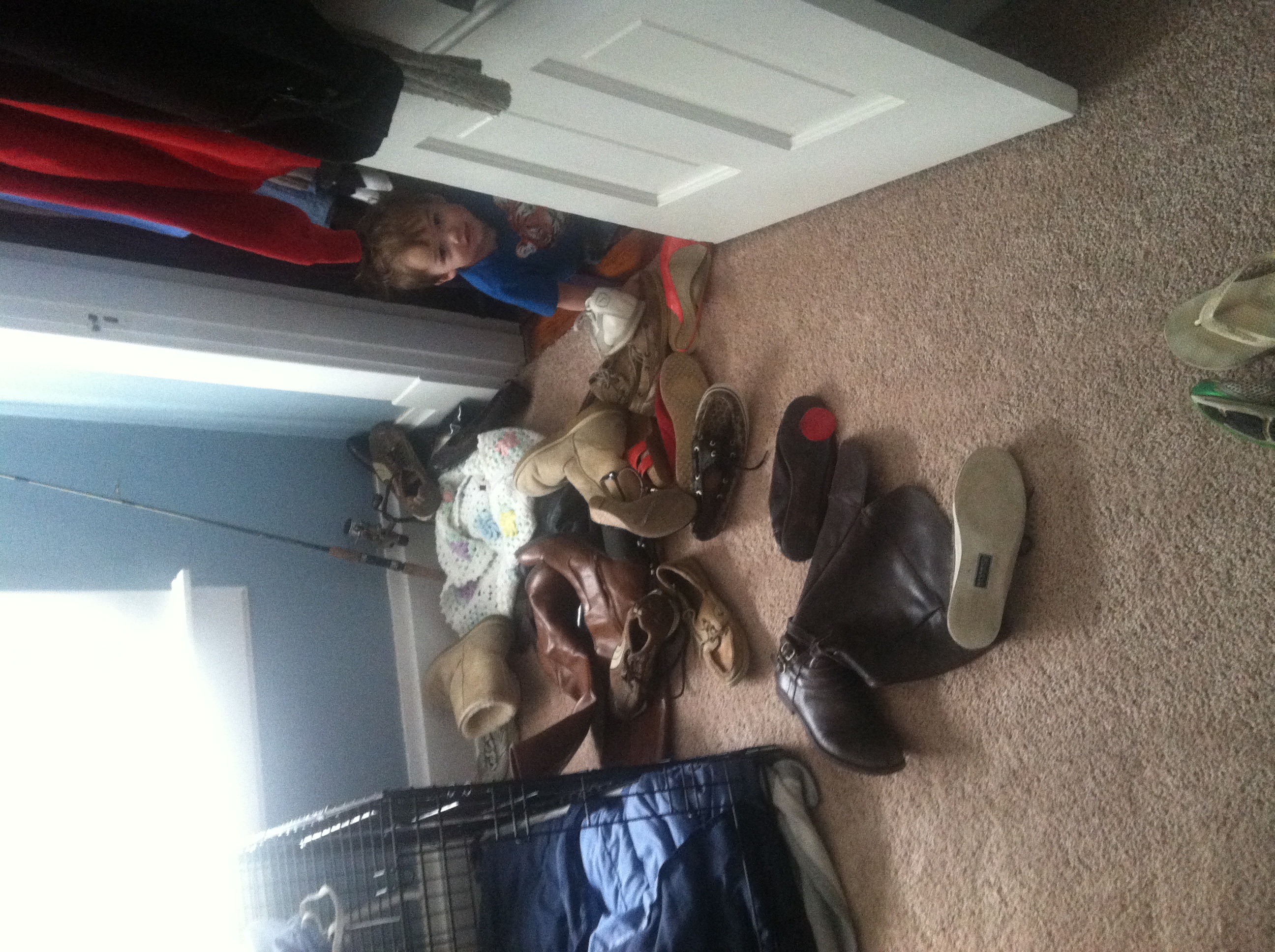 Remember the other day when I said it's nearly possible to keep my house clean with kiddies? I walked into the other room to get the vacuum, come back and find this. He decided it would be awesome to throw all of my shoes out of the closet.
