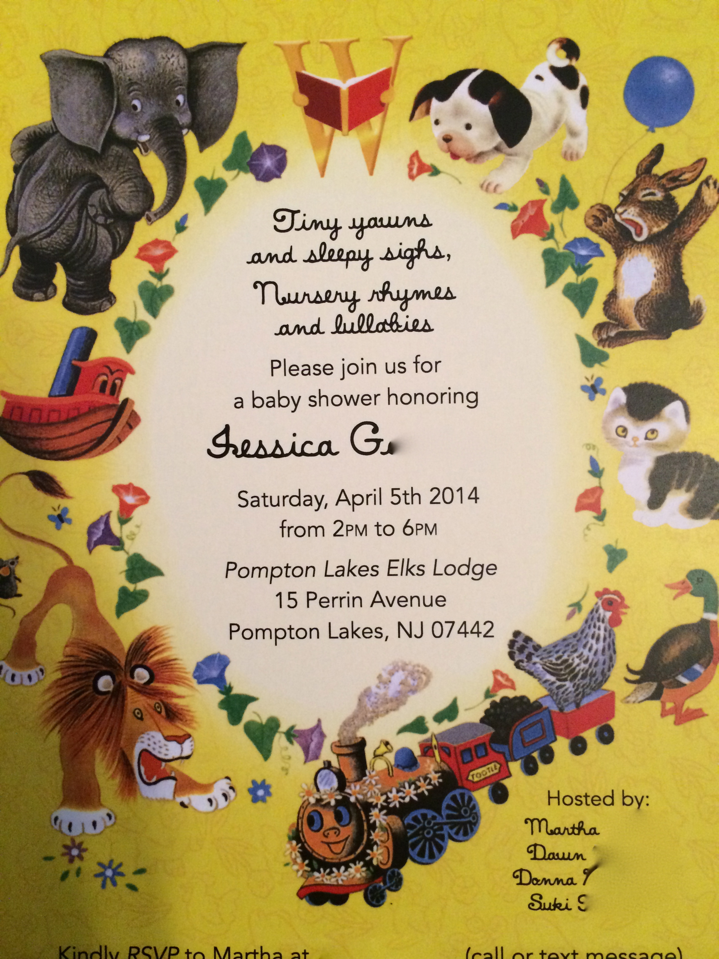 So my boyfriend's mom showed us the shower invite that she just mailed out!! bf's cousin is a graphic designer and did everything and another family member owns a printing company. So happy that we have such amazing people who were willing to give their time and money to make this so special!! We LOVE little golden books and I had never seen an idea like this and it was so darn cute!! And the little "W" detail is so adorable (bf's last name). And they had stickers made up to go inside the books that people will give us with a To and From spot and a place for a little note to baby.