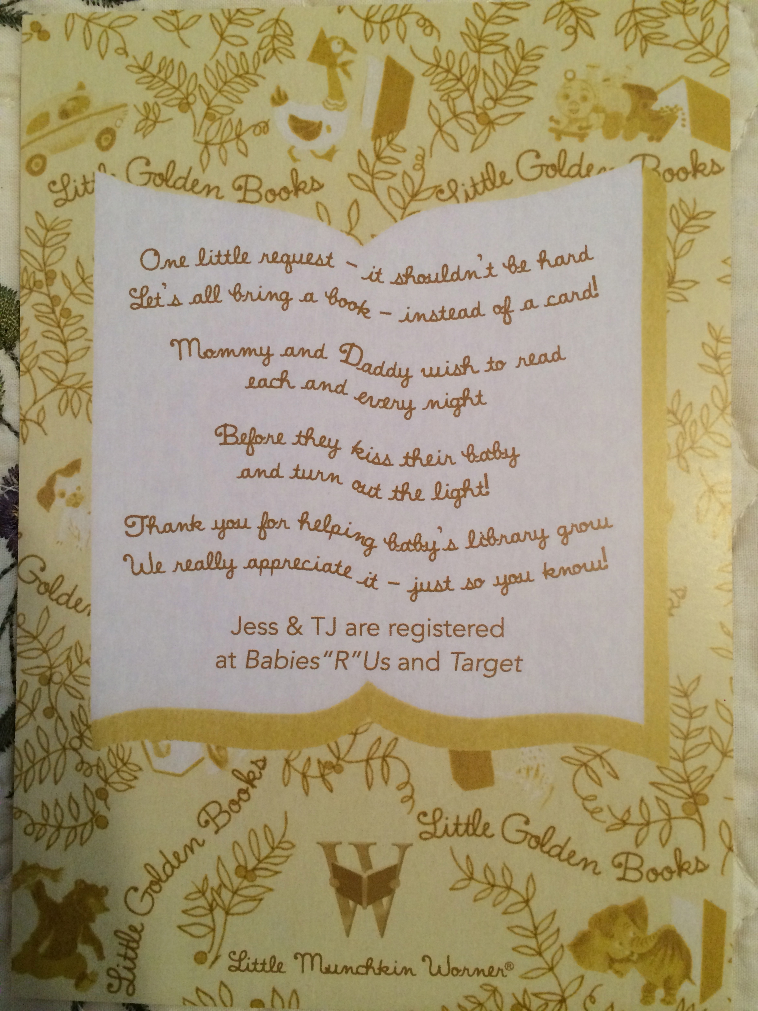 • Very cute. Funny how no one jumped all over you for asking for a book instead of a card. I was told I was being rude for having a diaper raffle which is pretty much the same concept, except books can be more expensive. Whatevs!! I love your invitation.