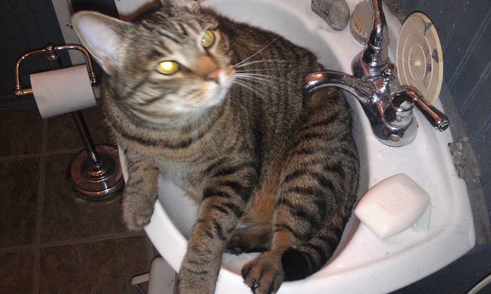 The sink cat is Fagan 20lbs of love, he is a big chicken, the little one is Vixen RIP, she died 12/24/13. Fagan is obsessed with drinking outof the shower, toilet or sink, he will knock you over when you open the door to the bathroom.