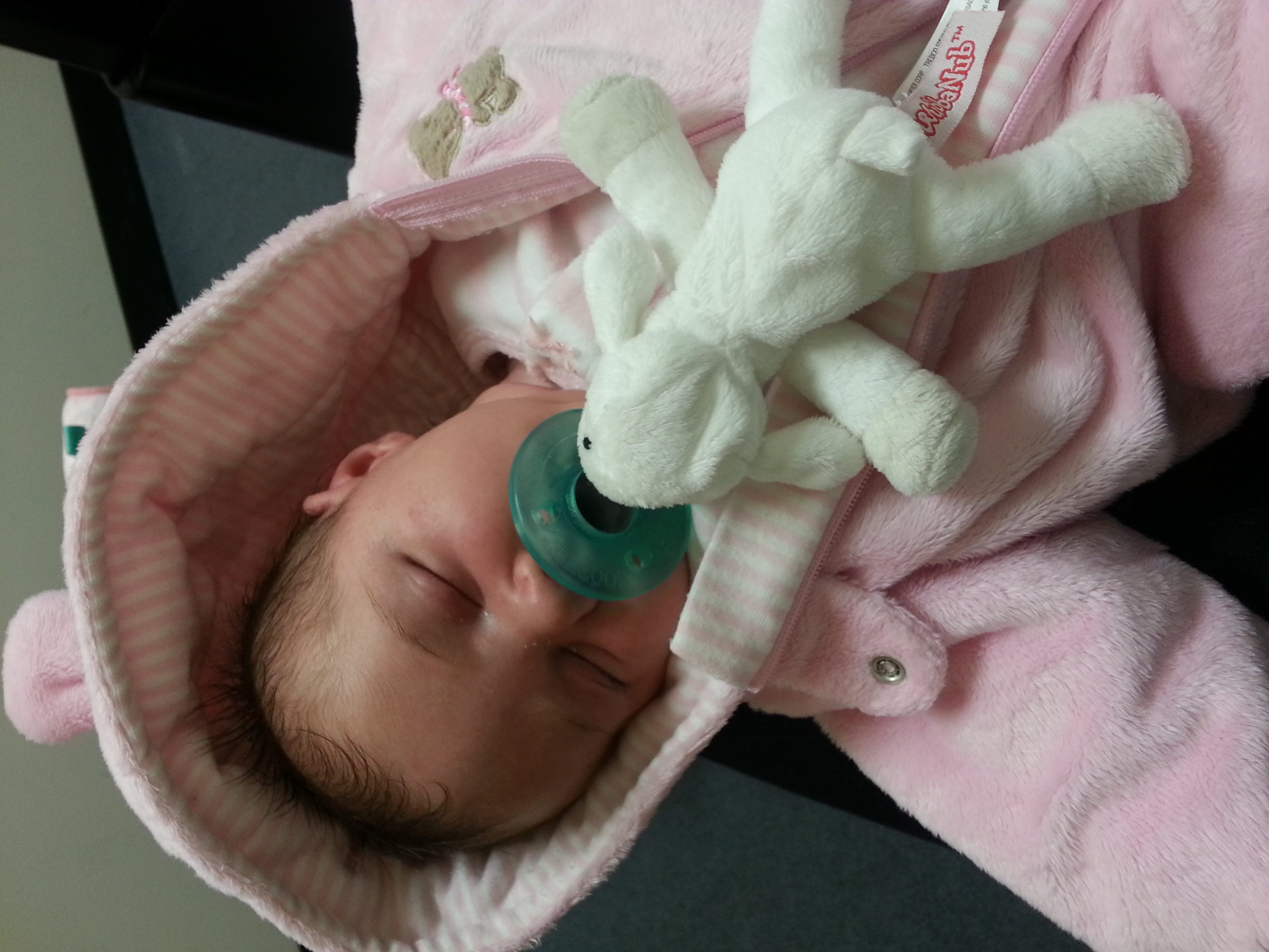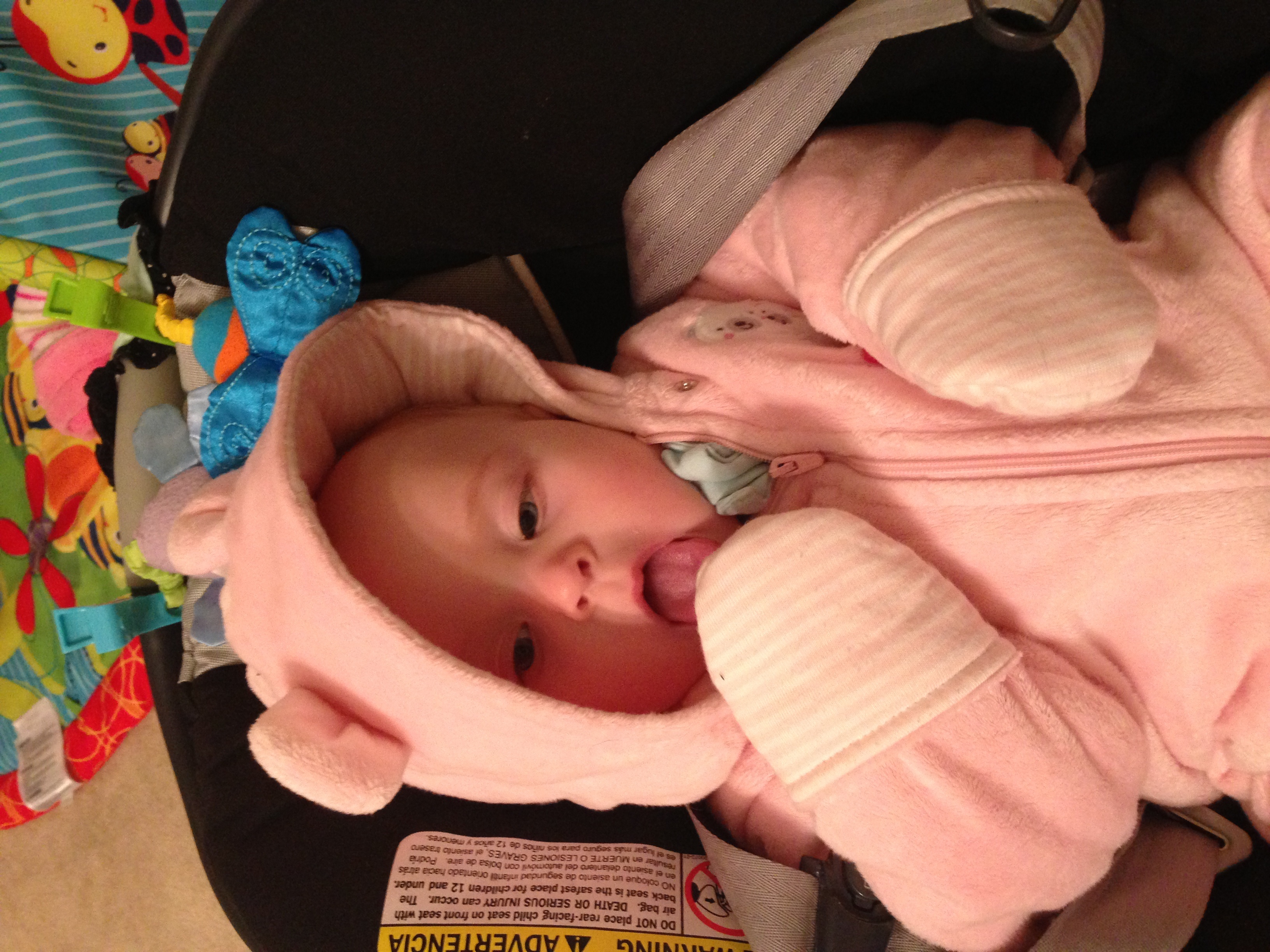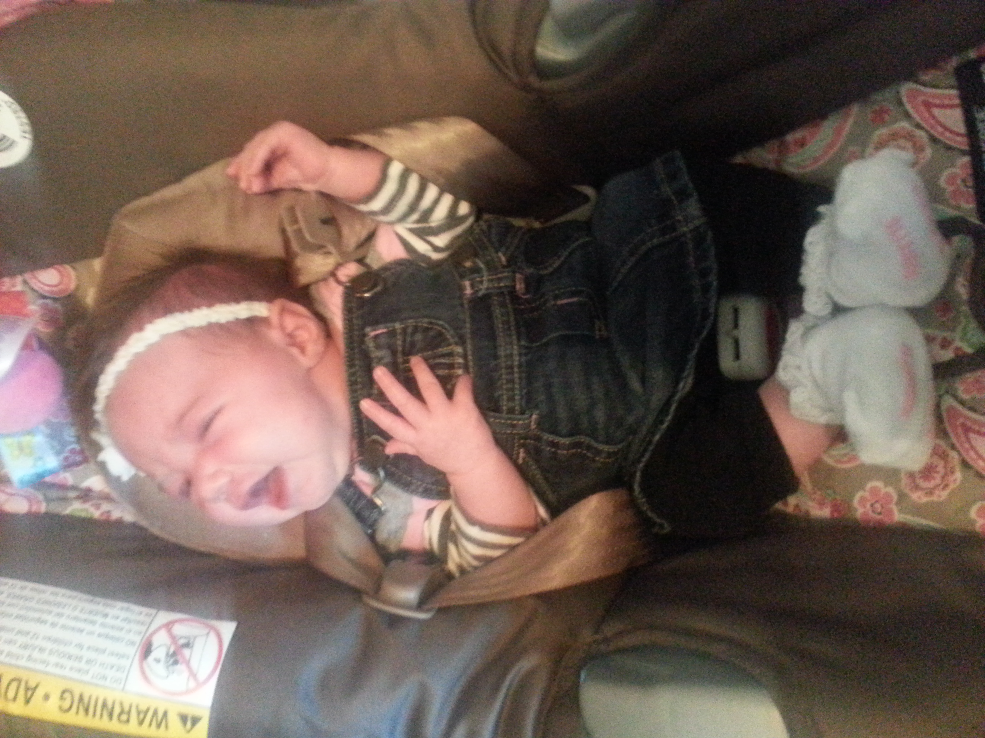Baby in overalls. Pissed bc we just got home from our first mall trip and she wanted the boob.
