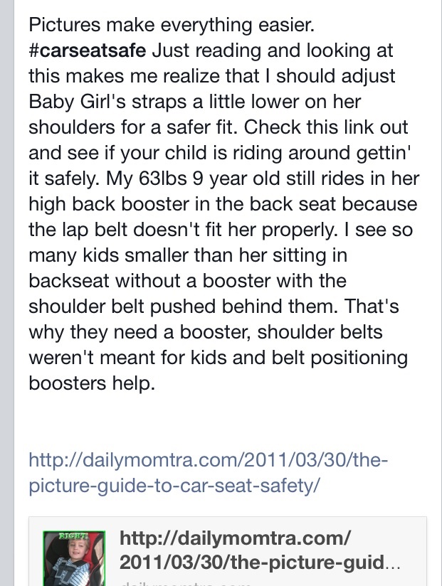 @RondackHiker I can agree with that! I see so many of my friends post pictures of their kids on FB in unsafe car seat situations it's not even funny. Most of the people I know wouldn't take it well so I try to randomly post car seat safety post every so often hoping that they would get a clue. I posted a few yesterday without calling anyone out but myself! I posted a picture of Baby Girl in with her new Graco belt buckle to start... Reminding people of the recall and that their kids should "ditch the old school snow suit her sister use to have" then went on from there. I really tried to be subtle! I think they were sick of my car seat related post after a while.