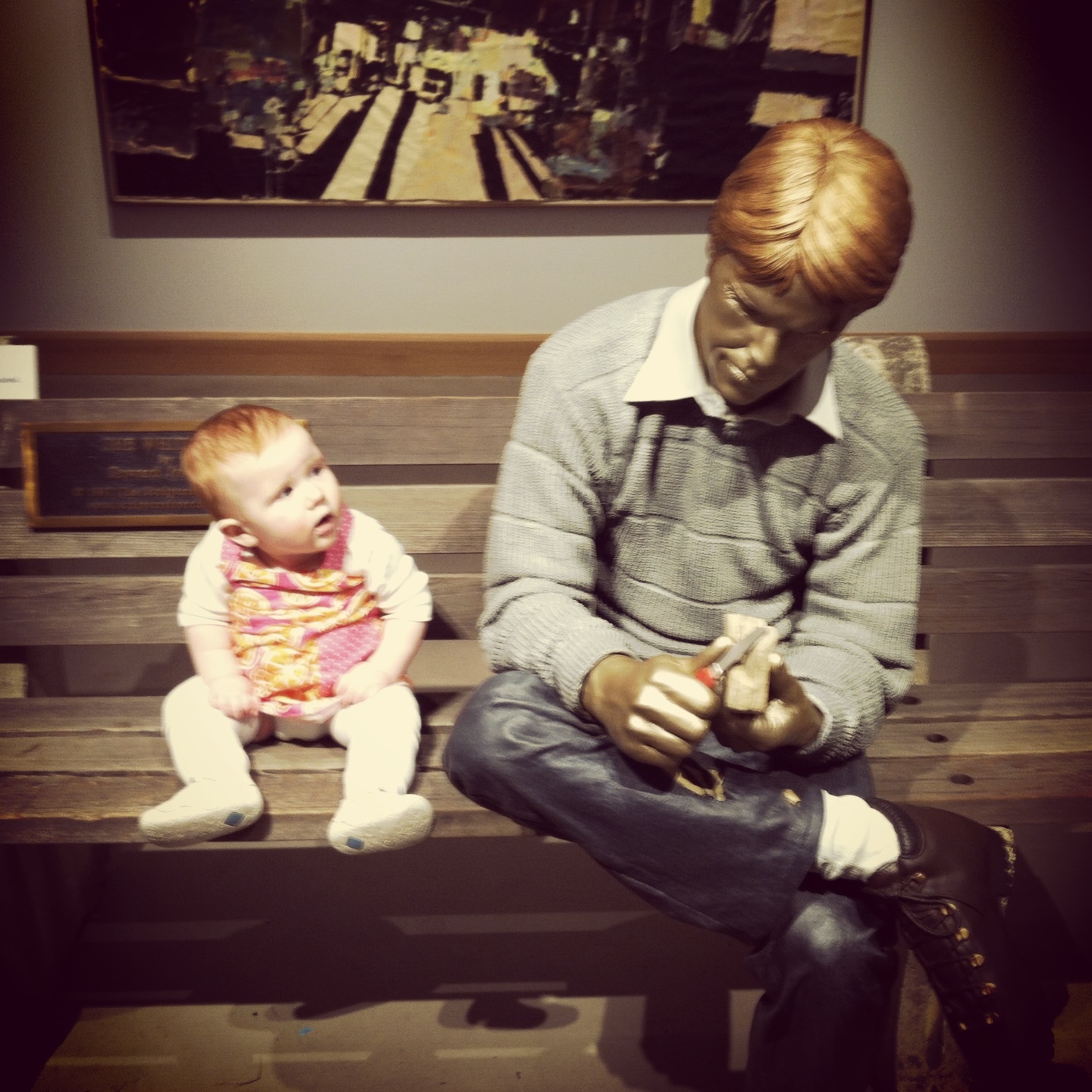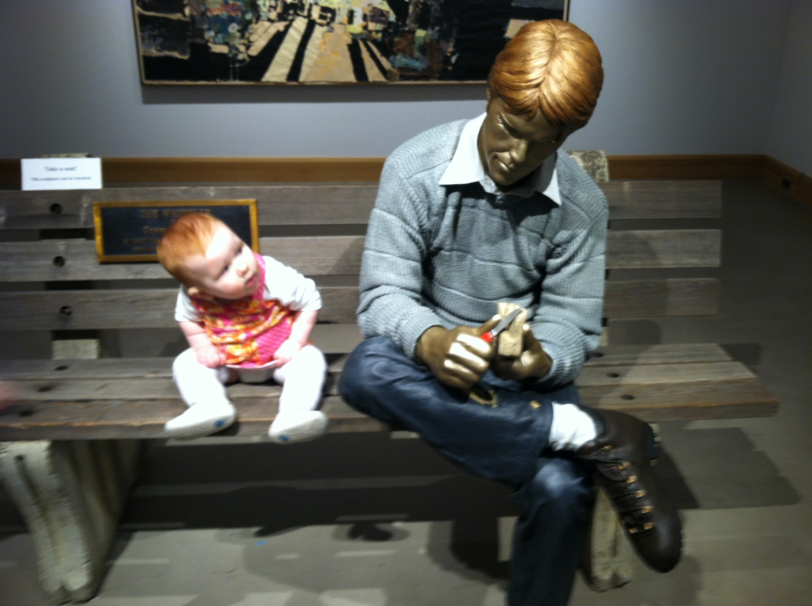 At first, I thought that she was falling off of the bench. Then I realized that she was just trying to get a good look at him. I was just off frame while a coworker took the photos.