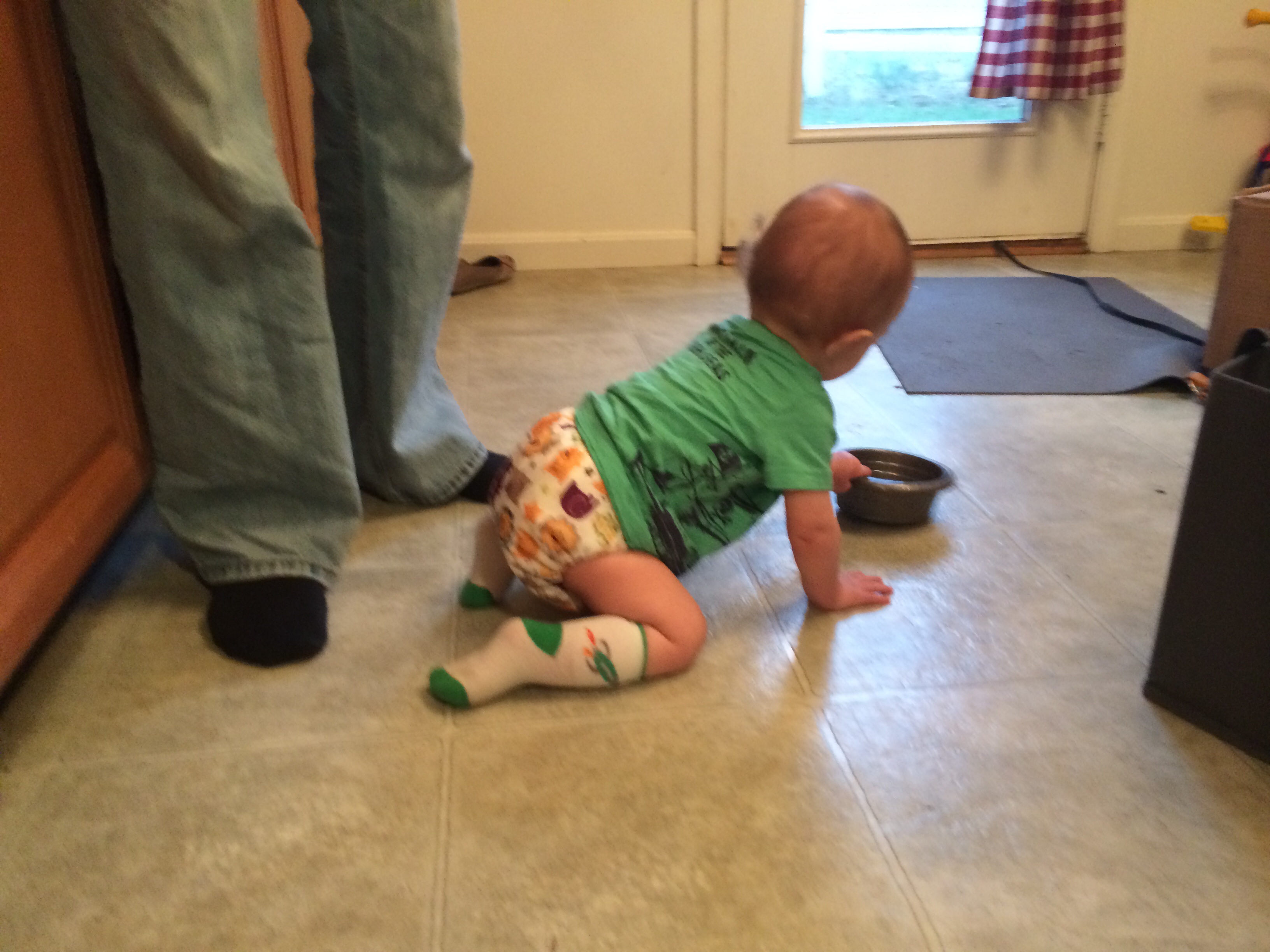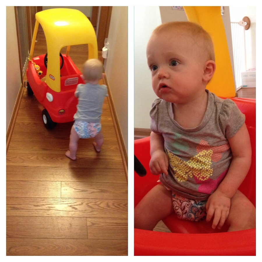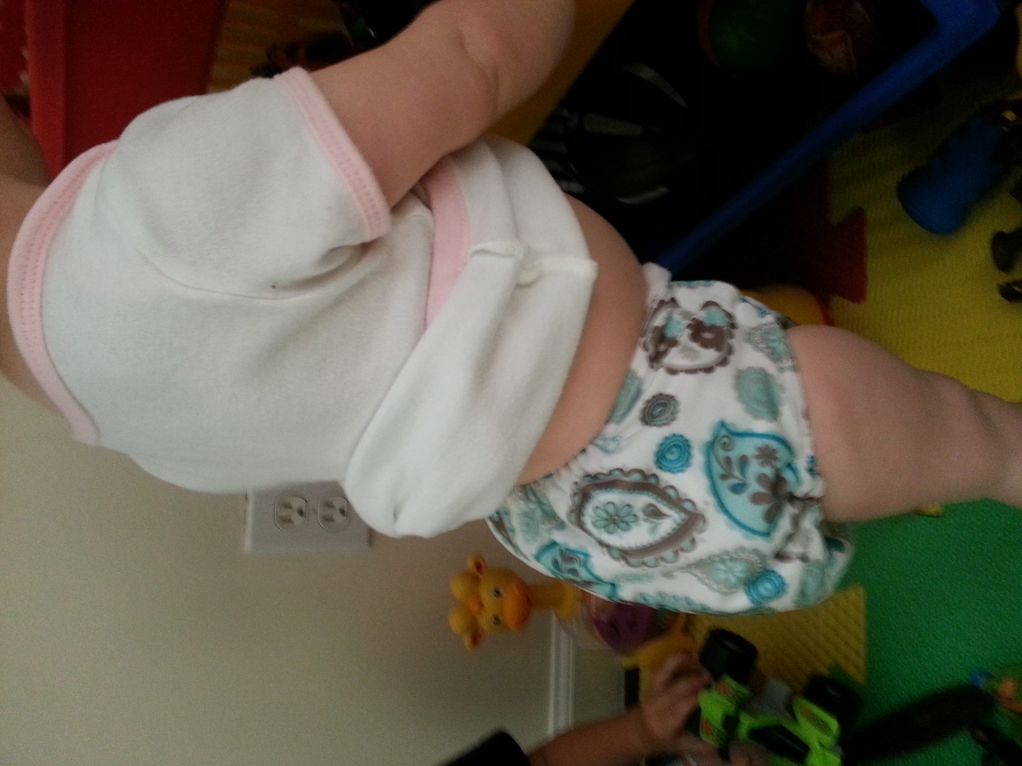 Playing with one of her birthday presents in her Lovelace. Am I the only one who always feels sorry for the babies/parents when parents post pics of their kids running around in disposable diapers? Cloth is just so much cuter!