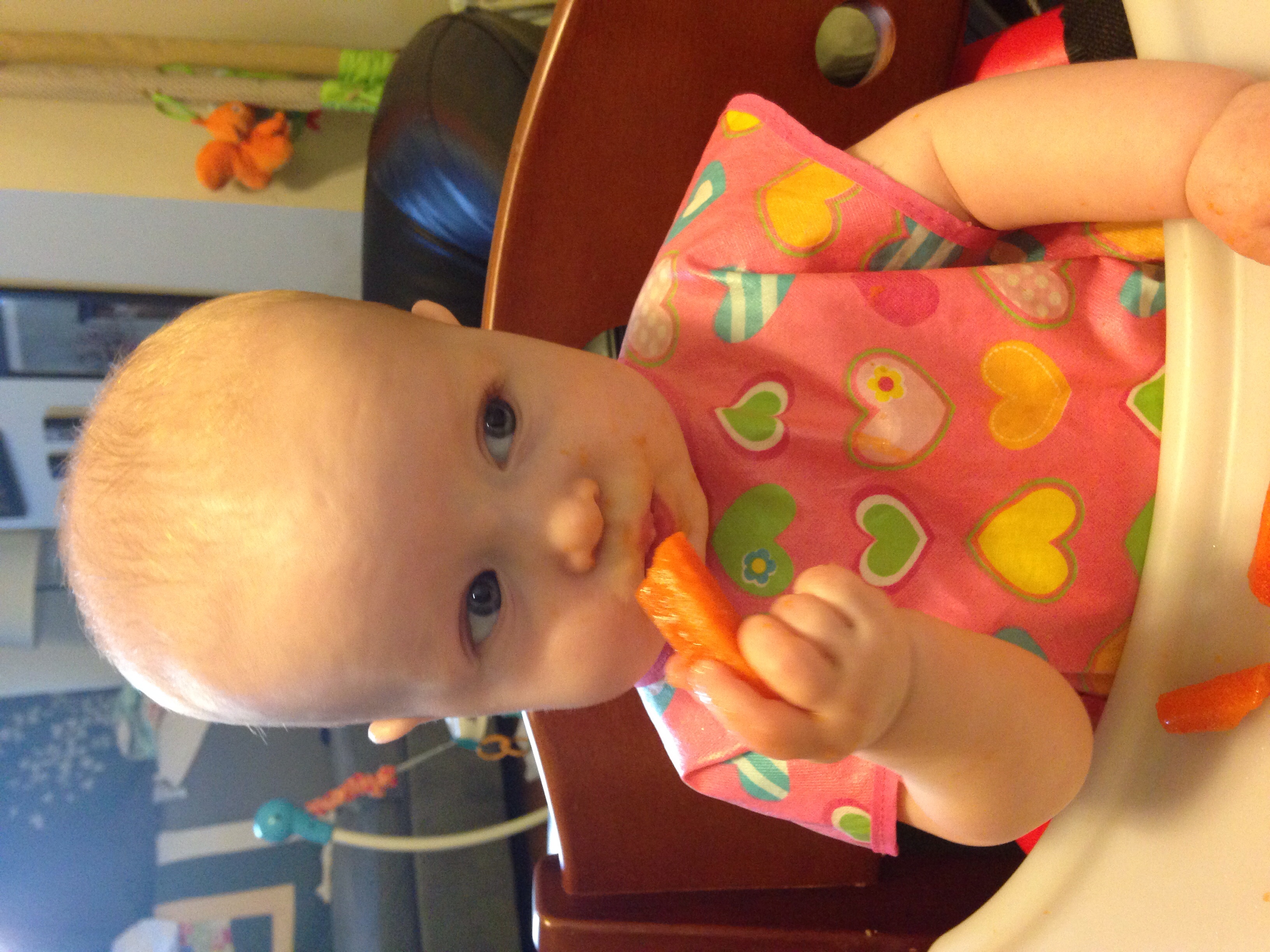 She is getting really good at feeding herself and gumming off pieces she can chew and eat. We've only had a couple gagging incidents that resulted in much of anything coming back up.