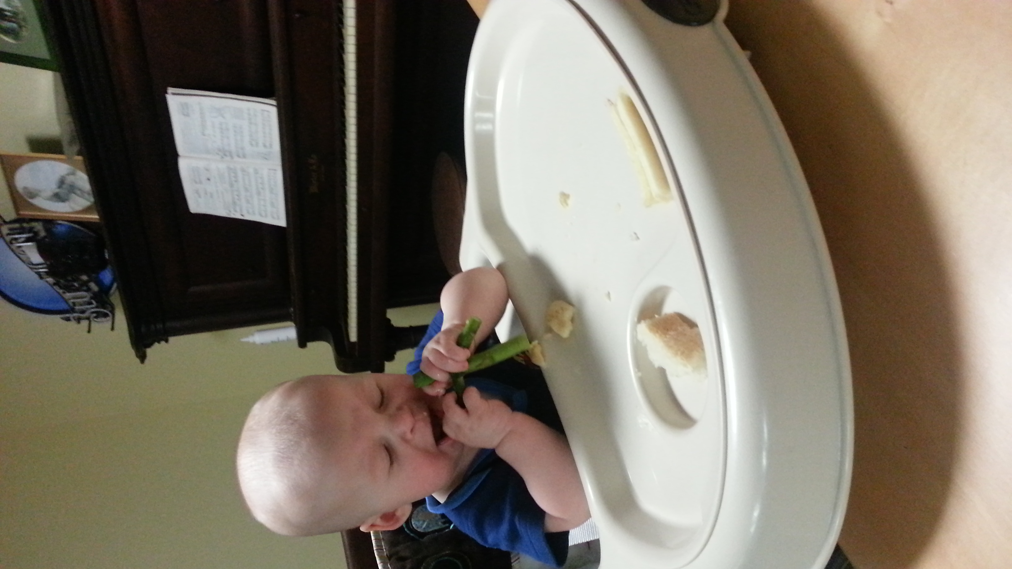 What will you try next?  So far we have done:  broccoli, cauliflower, carrots, apples, bananas, toast strips, green beans, yams, and sweet potatoes.  He likes all but carrots and bananas.  He will tolerate them, but isn't crazy for it.  Pears and asparagus will be this week.