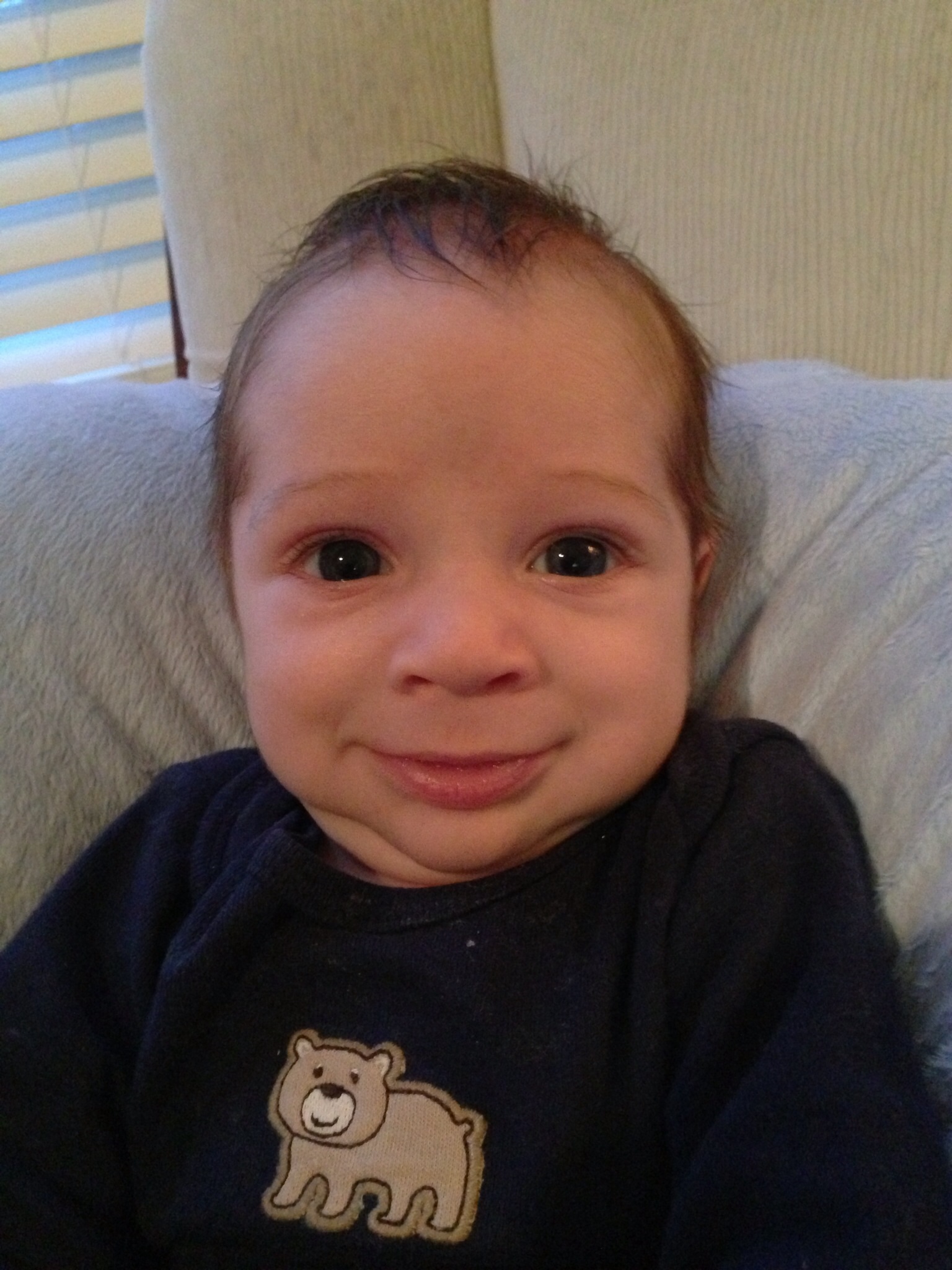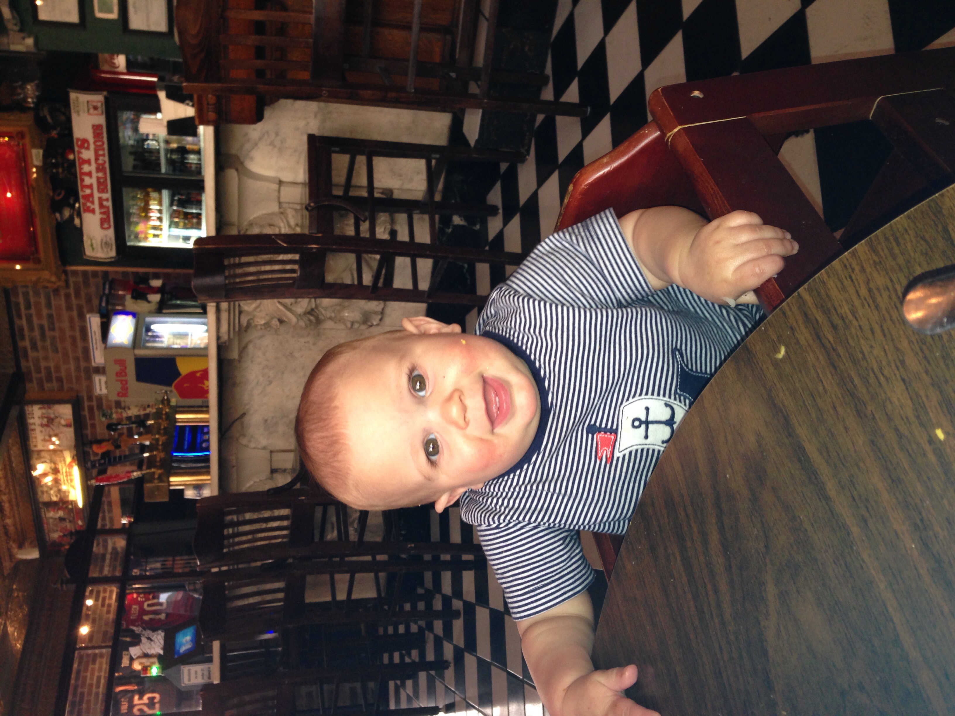 This was 8 weeks, and we call it the "fat librarian" picture. The second picture is around 14 months, and his belly just looks round from the horizontal stripes!
