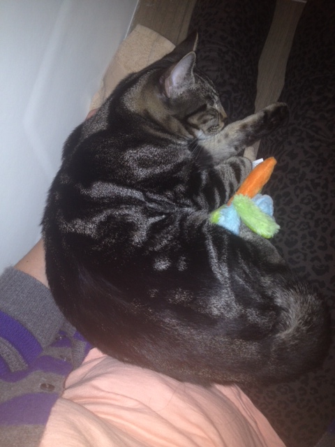 We found a perfect kitty and surprised ourselves by walking home with him from the shelter on our very first day of looking. We brought him home Sunday night. He is a year old but is TINY! He's only 8 pounds and is super playful and cuddly. I have him in the bathroom for a week for quarantine/health reasons, and last night I was cuddling with him and he FELL ASLEEP ON MY LAP - CUTENESS!!! I have so much love for him, falling so hard for him. Feels good.