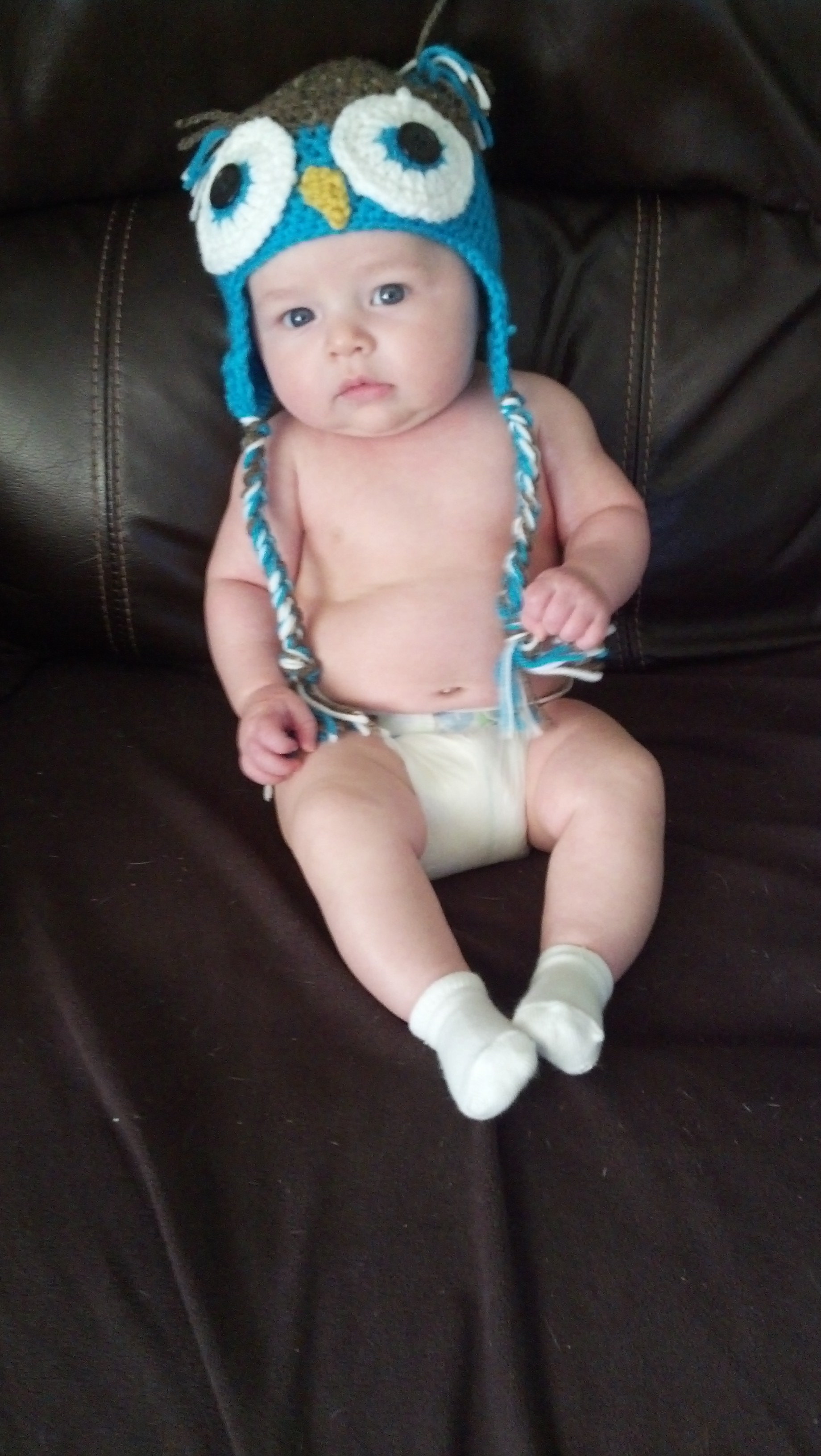 Baby J is 13 weeks. My cousin made this awesome hat for J. It finally hits his head so we took a pic to send to her. Sorry for the lack of clothes but who needs clothes when you have such a rockin hat?!