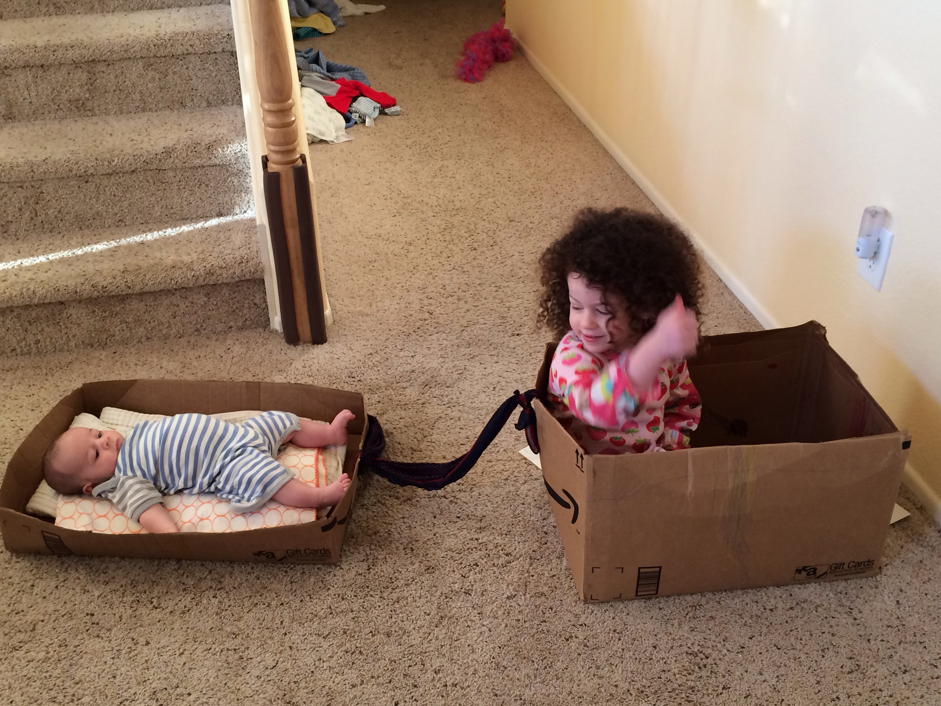 Here's DD driving her "baby train" and "pulling" DS behind!