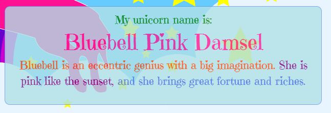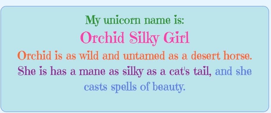 My unicorn name is:Lily Jolly CheeksLily is generous of spirit and always thinks the best of others.She is a jolly, brightly-coloured pony, and she casts happiness spells.