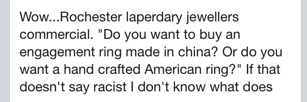 My brother posted on Facebook at a local (to him) jewelry store was advertising that their engagement rings were made in the United States and not China. Then he says "If that's not racist I don't know what is."