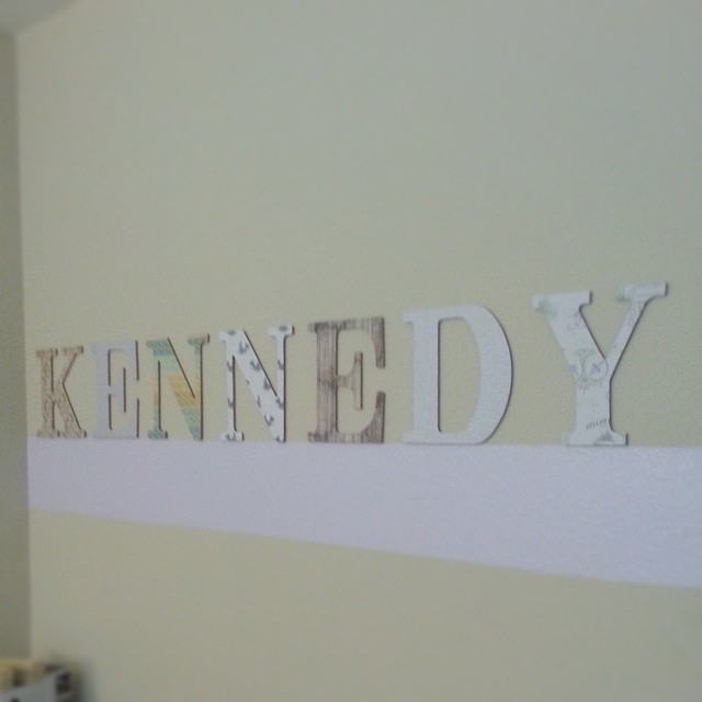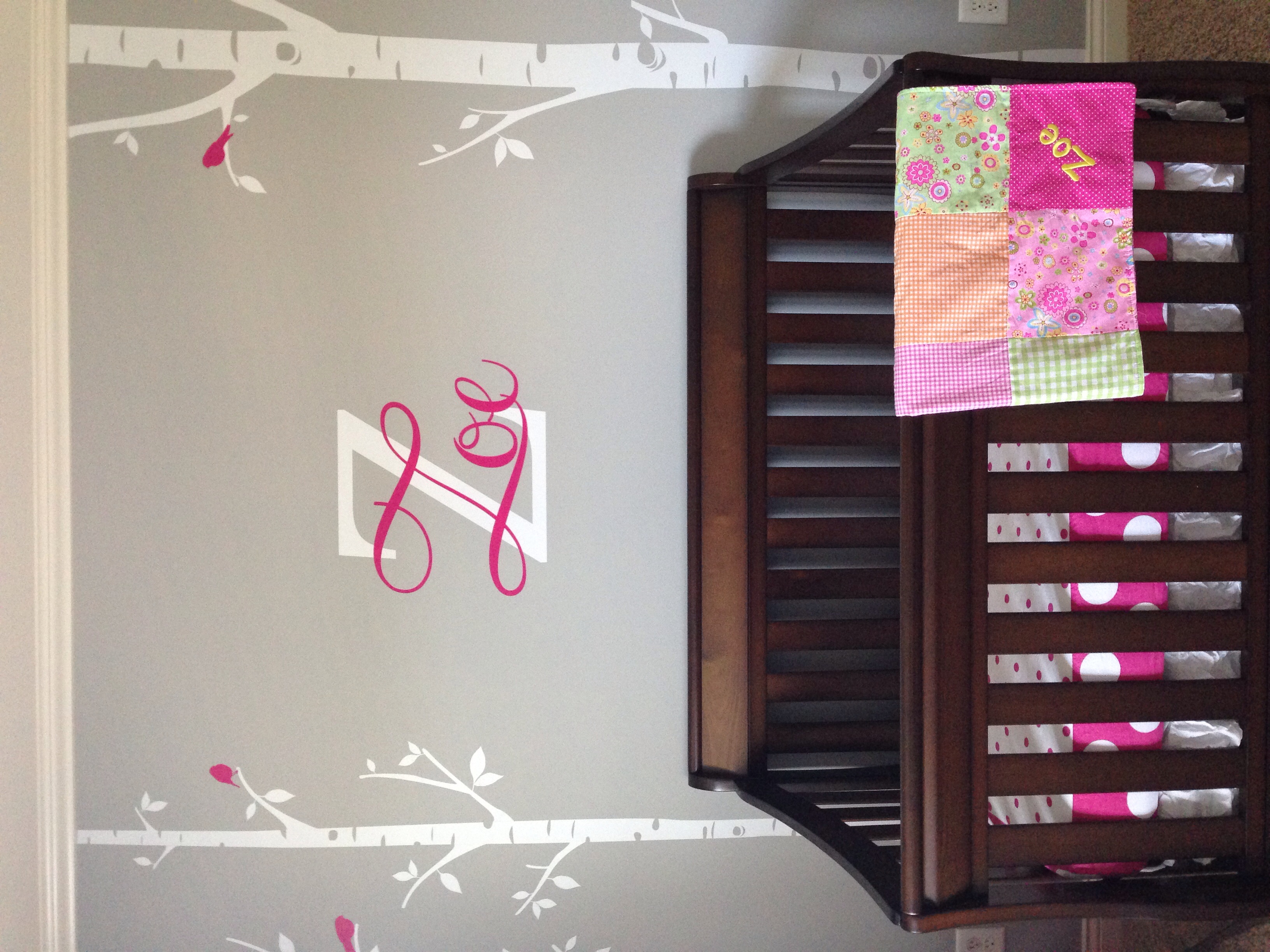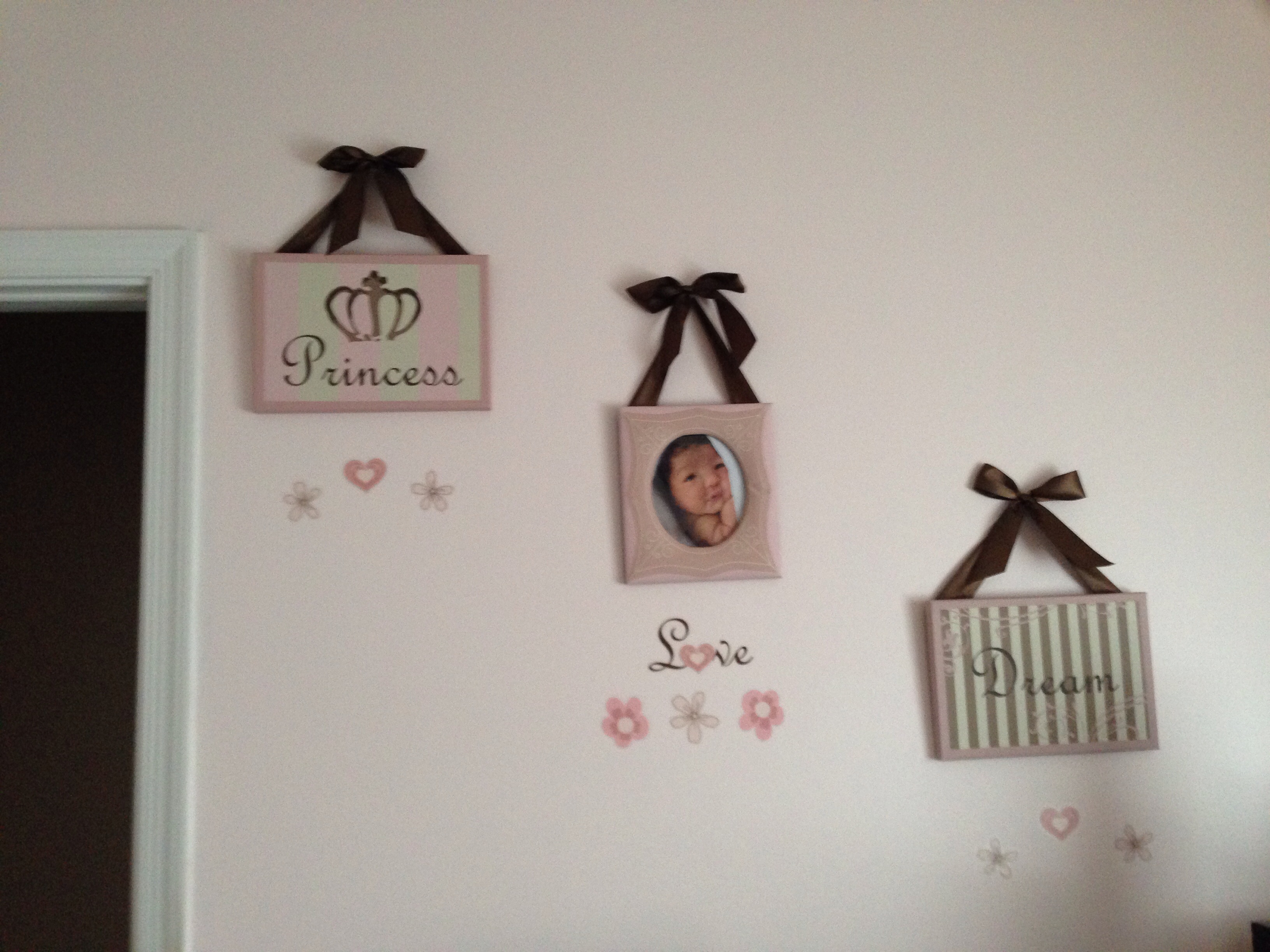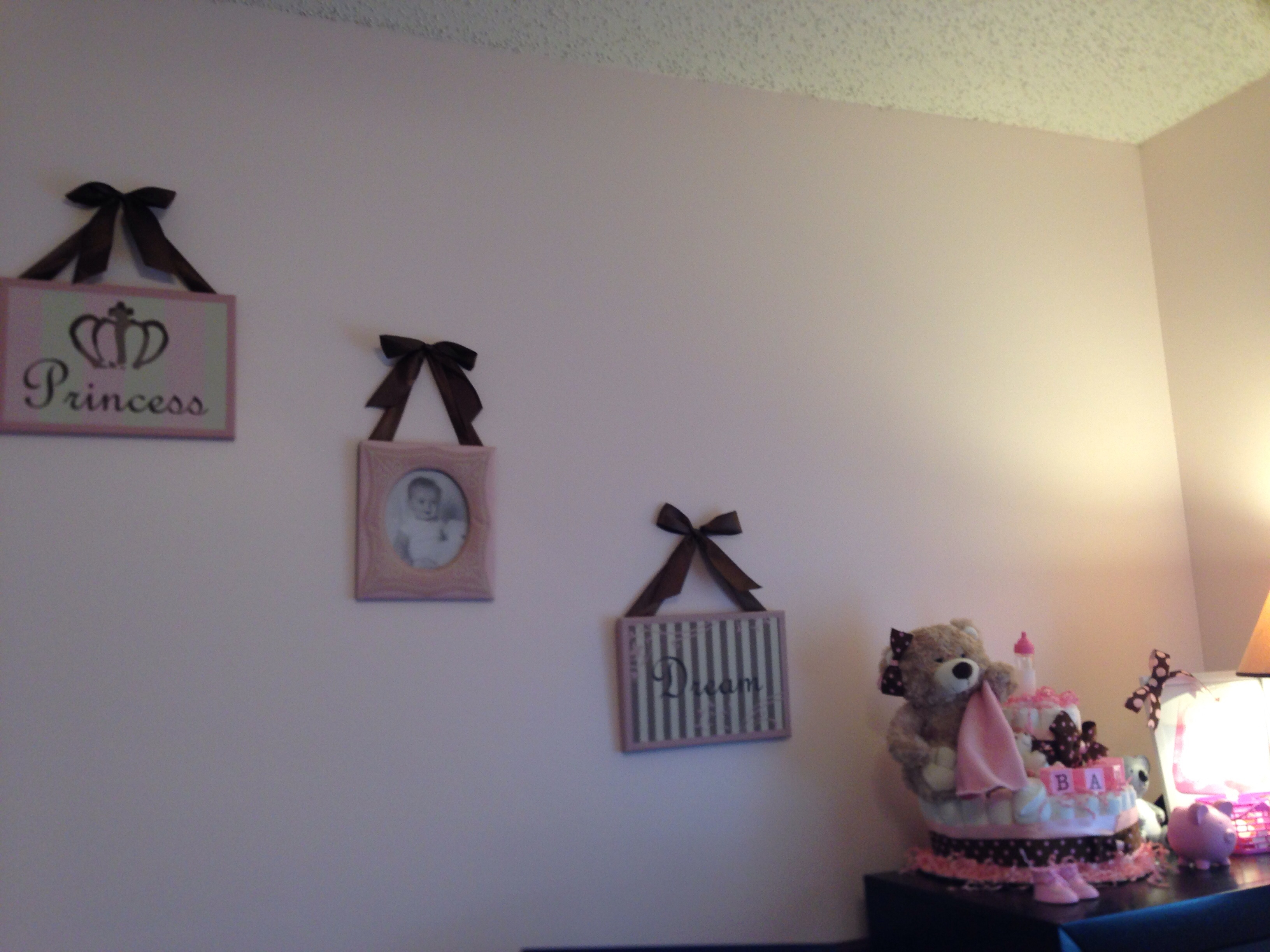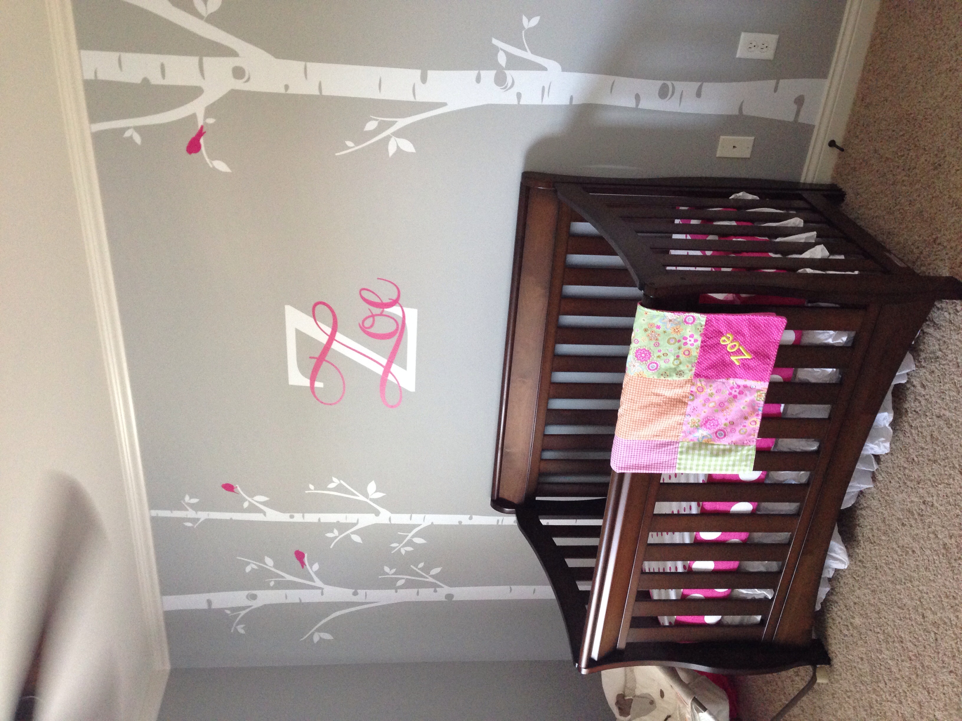 Our nursery is being split into two spaces. My husband works from home so he needs and office and we only have two rooms so his office is being turned into a "multi-purpose" room. Half of it will be Kennedy's space, will have her dresser, the glider and changing station. Her crib is in our room and is all set up and ready to go. The only decorating we have gotten around to is one wall in the multi-purpose room, we are getting the rest of furniture for her room this weekend (and seeing as though I only have around 2 weeks left, its about time!)