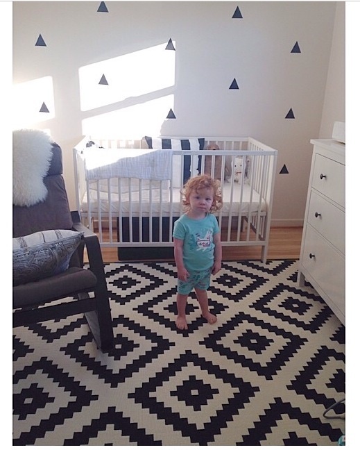 Here's ours! We went for a black and white geometric theme. We still need a curtain rod and some sheers (probably black curtains on the ends eventually because of that morning sun on the crib!) a side table to go on the left side of the rocker, and some shelves for the wall for books and a couple framed prints. This is pretty much all IKEA. I should probably get them to pay me for the advertisement that my home is for them LOL