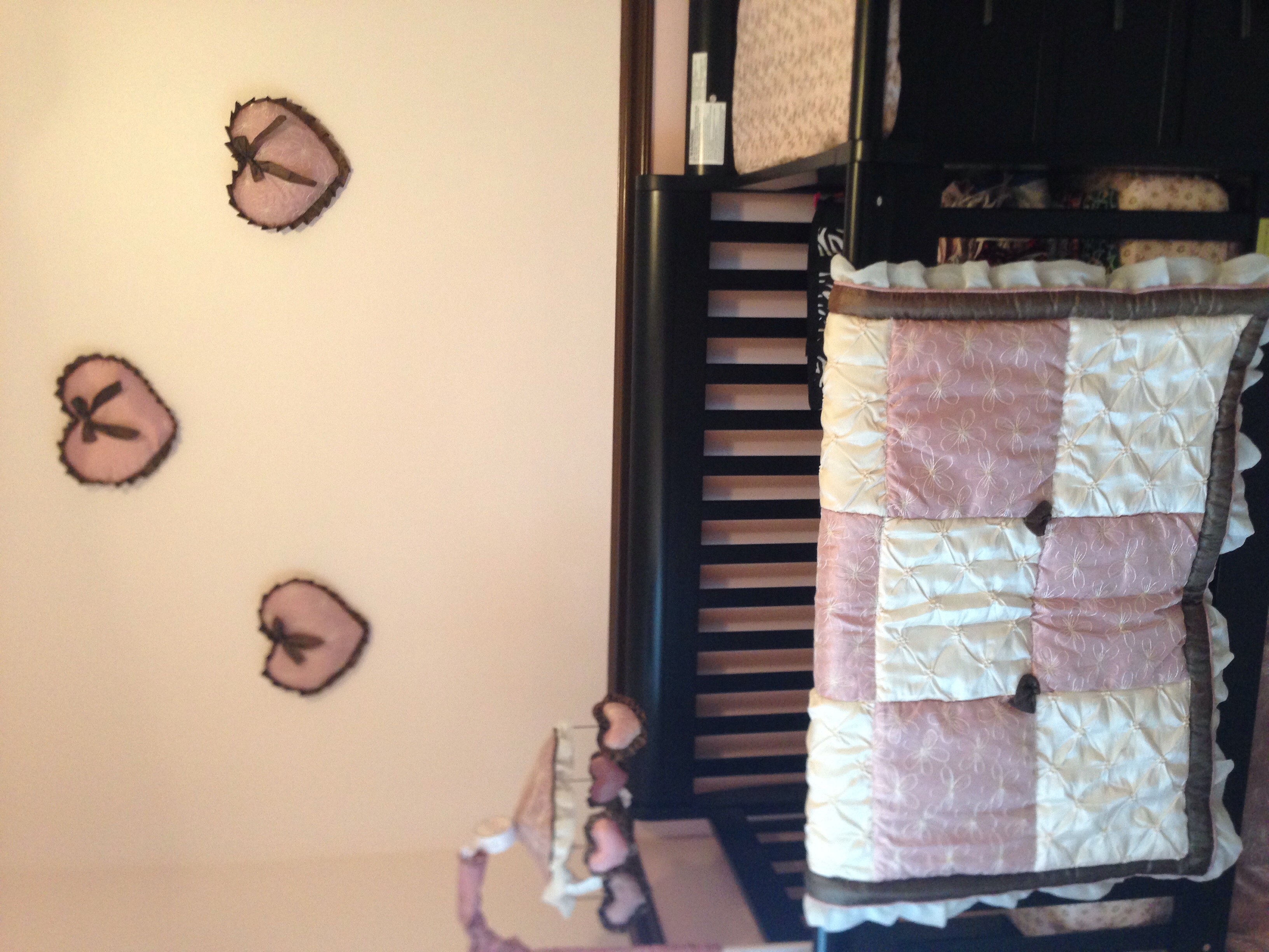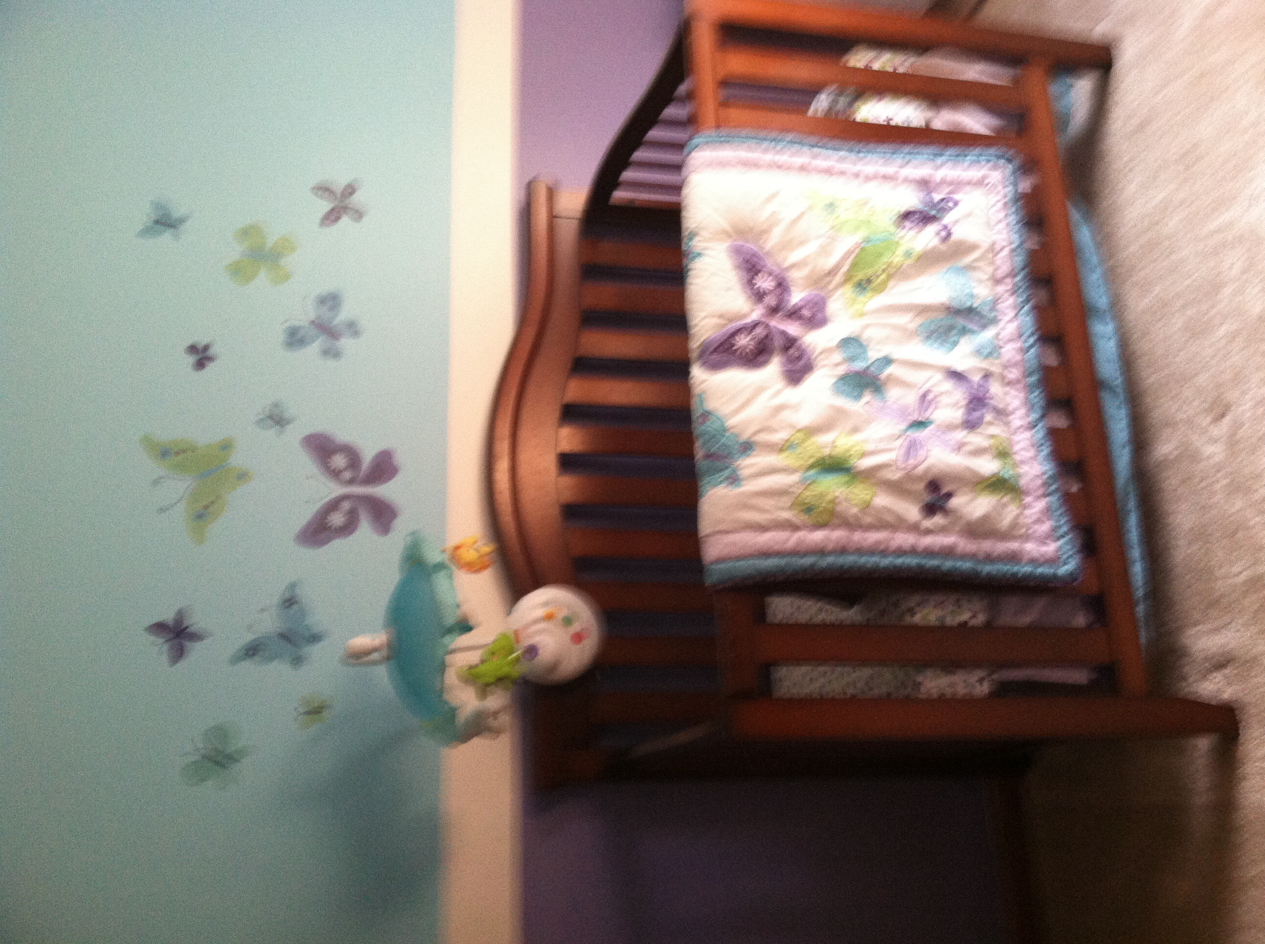 Here's her crib and her "wall" with NOTHING on it yet. Looks so sad.