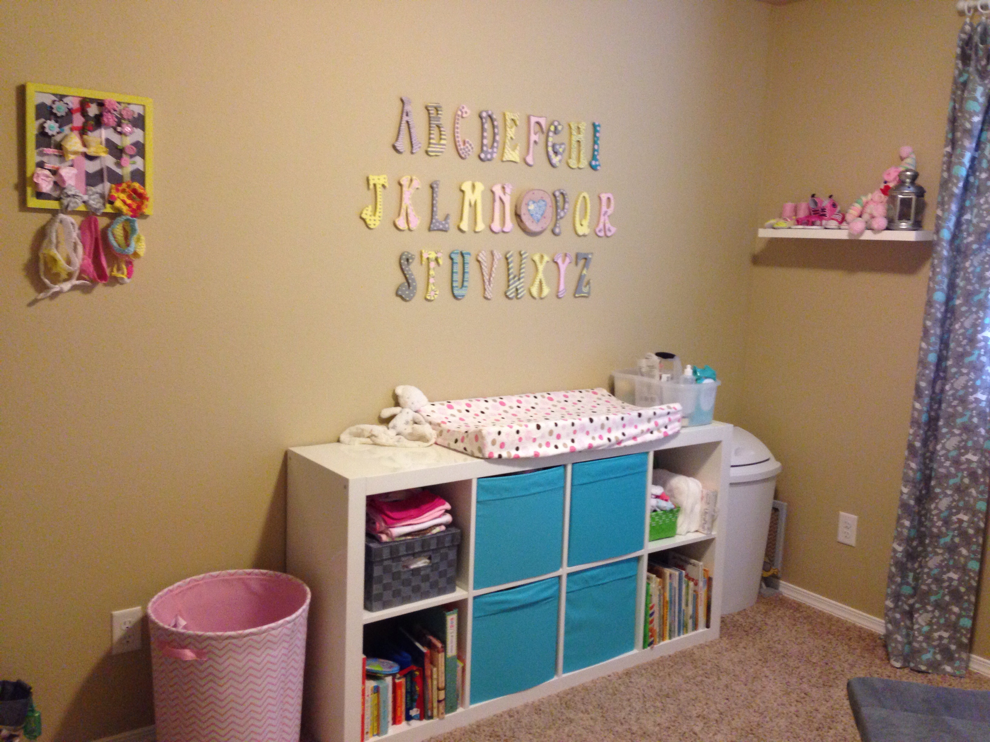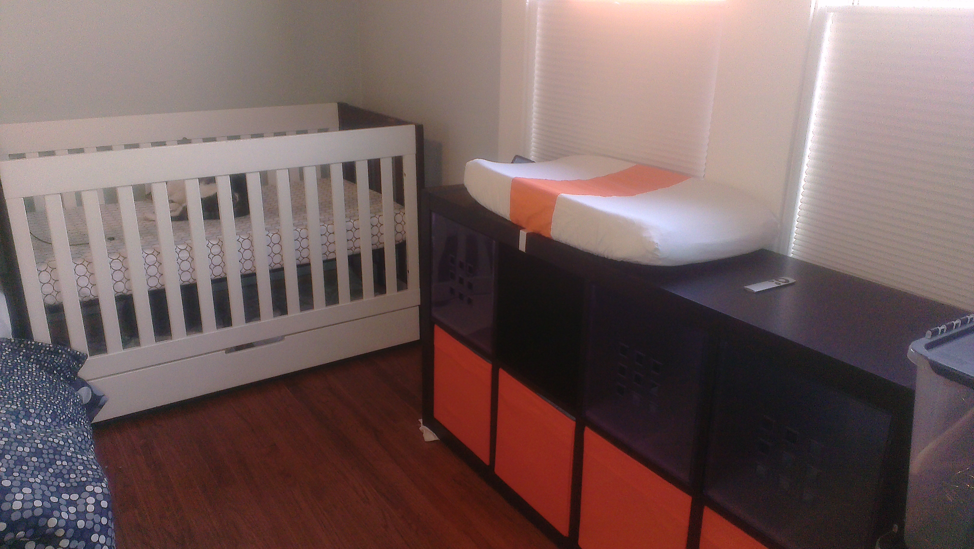 This baby will be hanging out in our room next to our bed. I tried to set up the crib side carred, but the mattress levels are off by a few inches and I wasn't quite comfortable with that for a newborn. So for now, we have a crib and a changing table. The bottom bins have all the clothes and diapers (cloth).