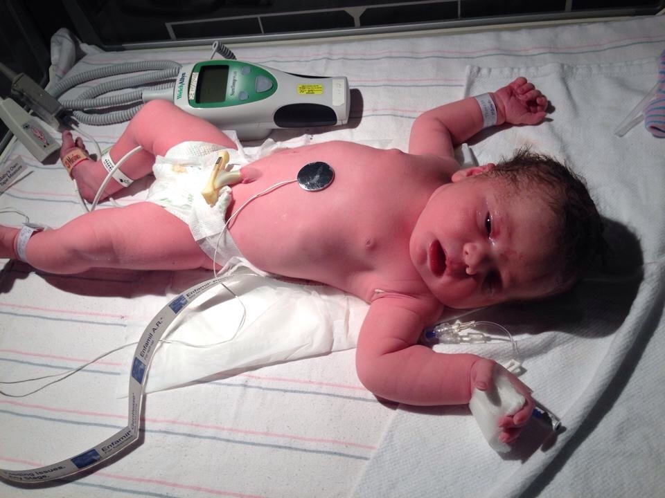 Apparently, she was not born with a heart beat (they knew she had one up to that point because someone was holding the cord.) and she also wasn't breathing. She was limp. They said it didn't take very long at all to get her back, but as they rushed down the hallway with her explained to my husband she was being rushed to the NICU for fluids because she was in shock and we could possibly see her in a few hours.