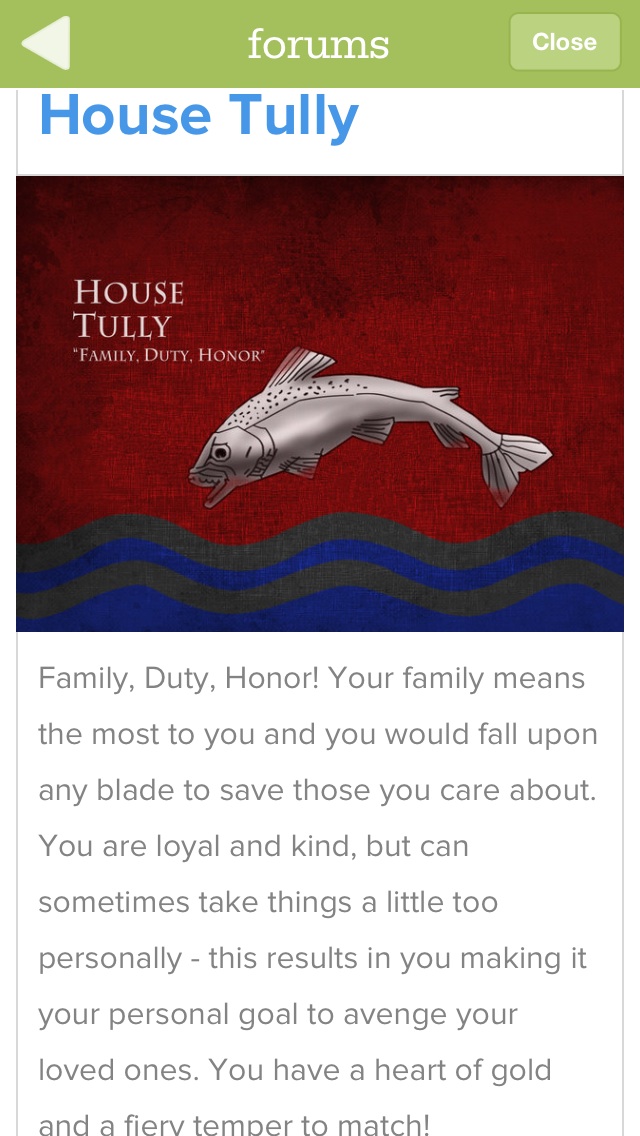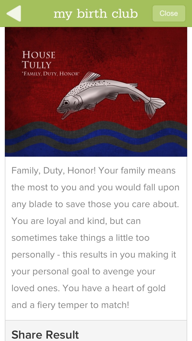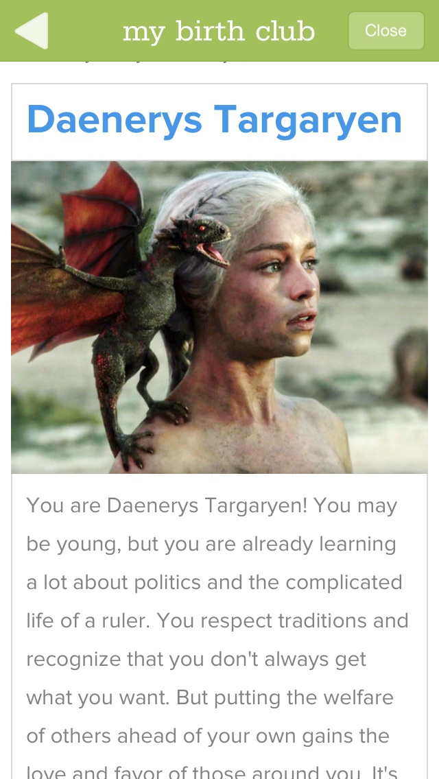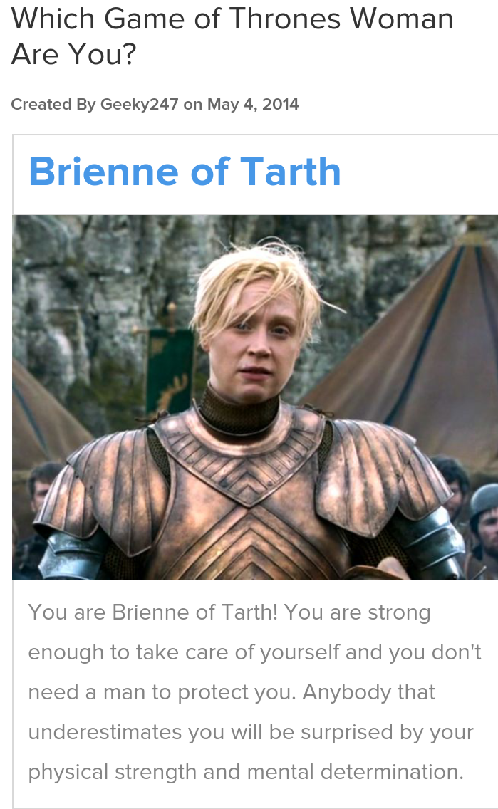 There is also this quiz, if you need to know which GoT lady you are. https://www.playbuzz.com/geeky24710/which-game-of-thrones-woman-are-you?excludeGameIds=1f05aac5-2a6e-4518-bbad-28a01a2e7217_08070556-ce9b-466f-9158-884339c79595_565adf8f-c138-4abc-81a3-85406102dad3_fe85a060-78b4-4fa4-95a2-8b2fdff23f87_68f5ad6a-232a-4bf2-99db-8c33d83a6857_c7678553-fd93-449b-8d7d-dd2ff0a54e09_c2913775-ddd0-45dc-b32a-23ab9a56c20d_ab0505f6-73f3-4715-8c68-db83b9819bffApparently I am,