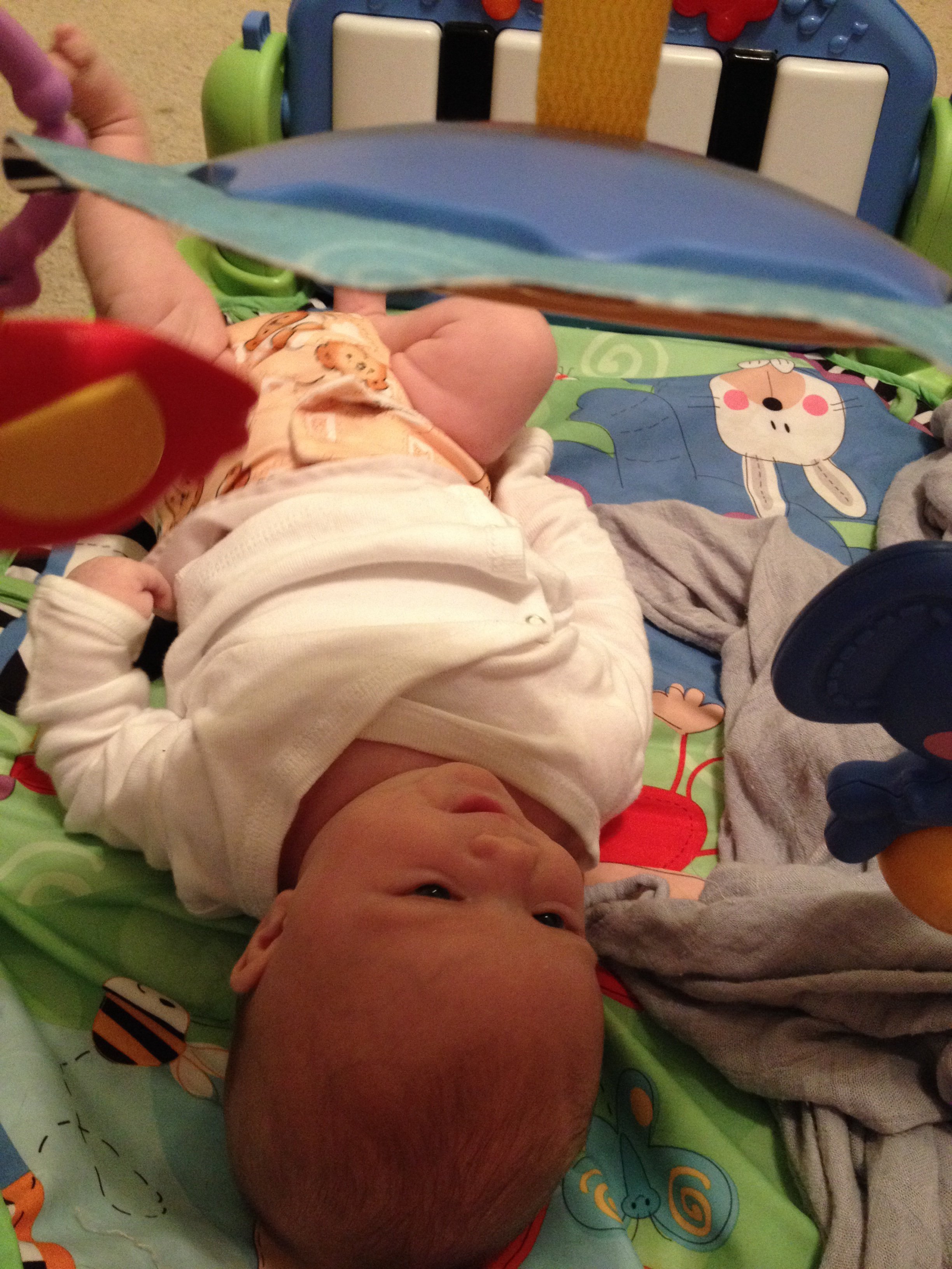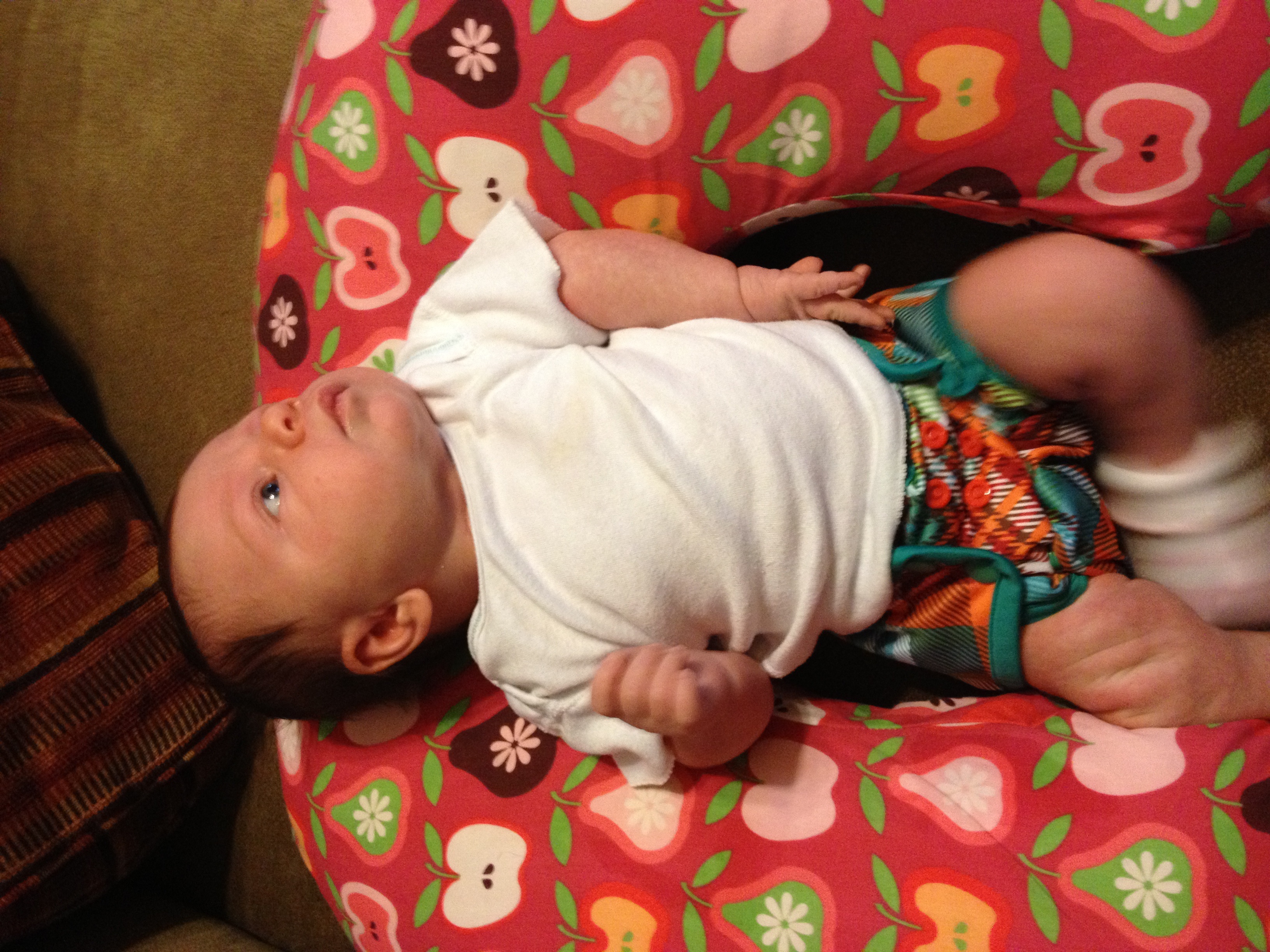 I hope you can see it well enough, Colin modelling the pocket diaper I won the week the was born. Such awesome timing! It's a Glowbug pocket diaper with a 360 degree gusset, it goes around the whole diaper, front and back as well as sides. It works pretty well since Colin had a huge poop about 5 minutes after this picture was taken.