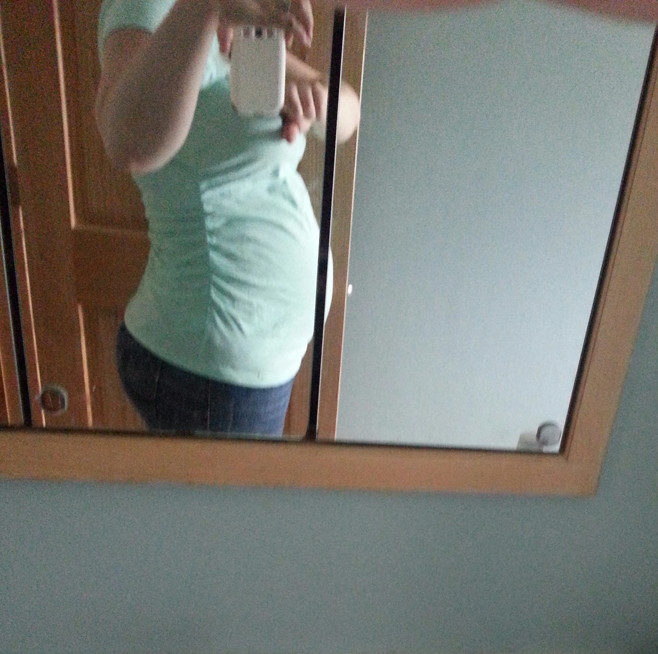 Here is my first bump pic at 18 weeks 5 days. Sorry my mirror cuts off right before the end of my belly. You can still kind of see it on the other side of the break.