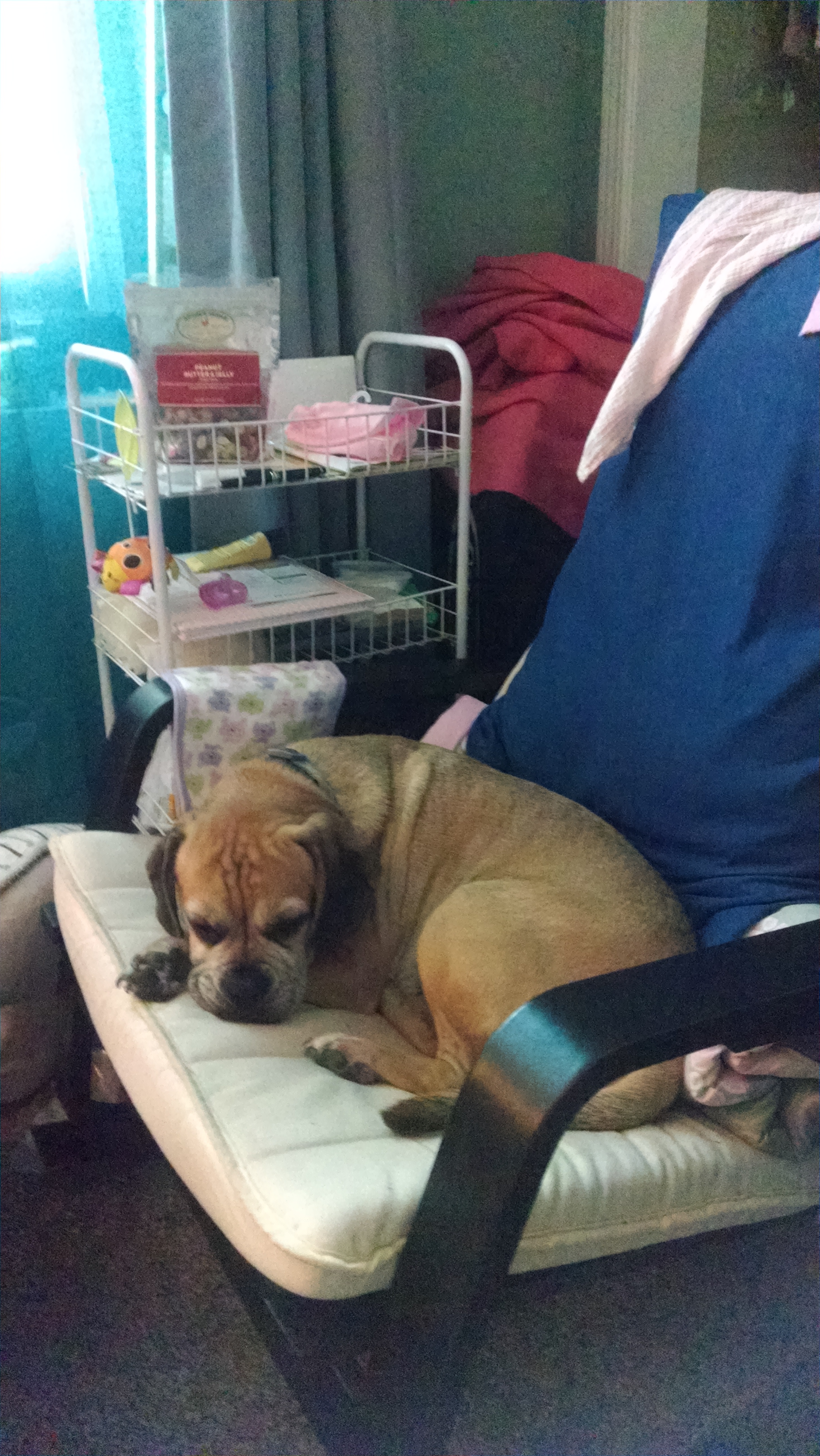 I'll add a lighter post here. The alpha puggle, Vegas, just jacked my pumping chair. In his defense, this was his chair for a few weeks before it went into the nursery but still...