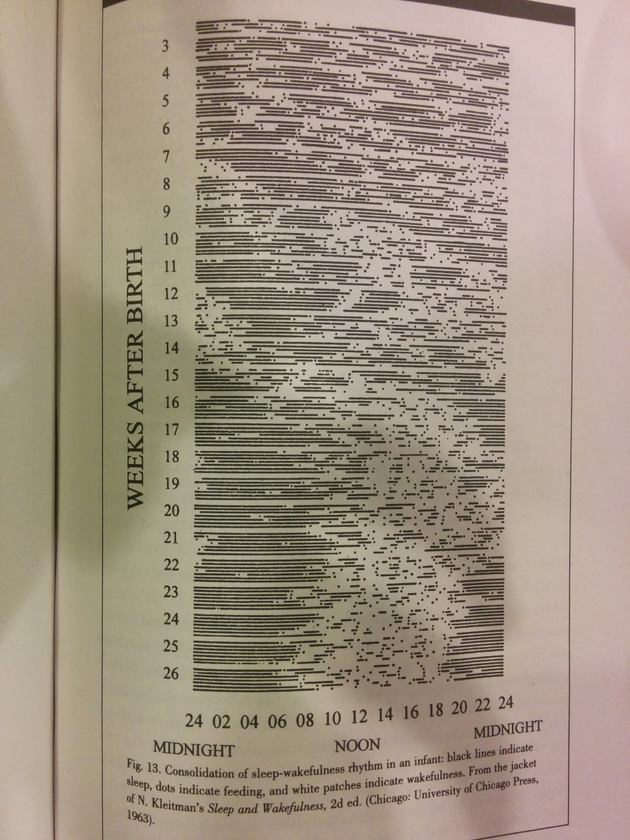 My mother is reading a book on the science of sleep and one of the things it covers is infant sleep patterns. I hope the photo comes through, but basically the black lines are sleep, dots are feedings, and white is awake time. It covers weeks after birth.